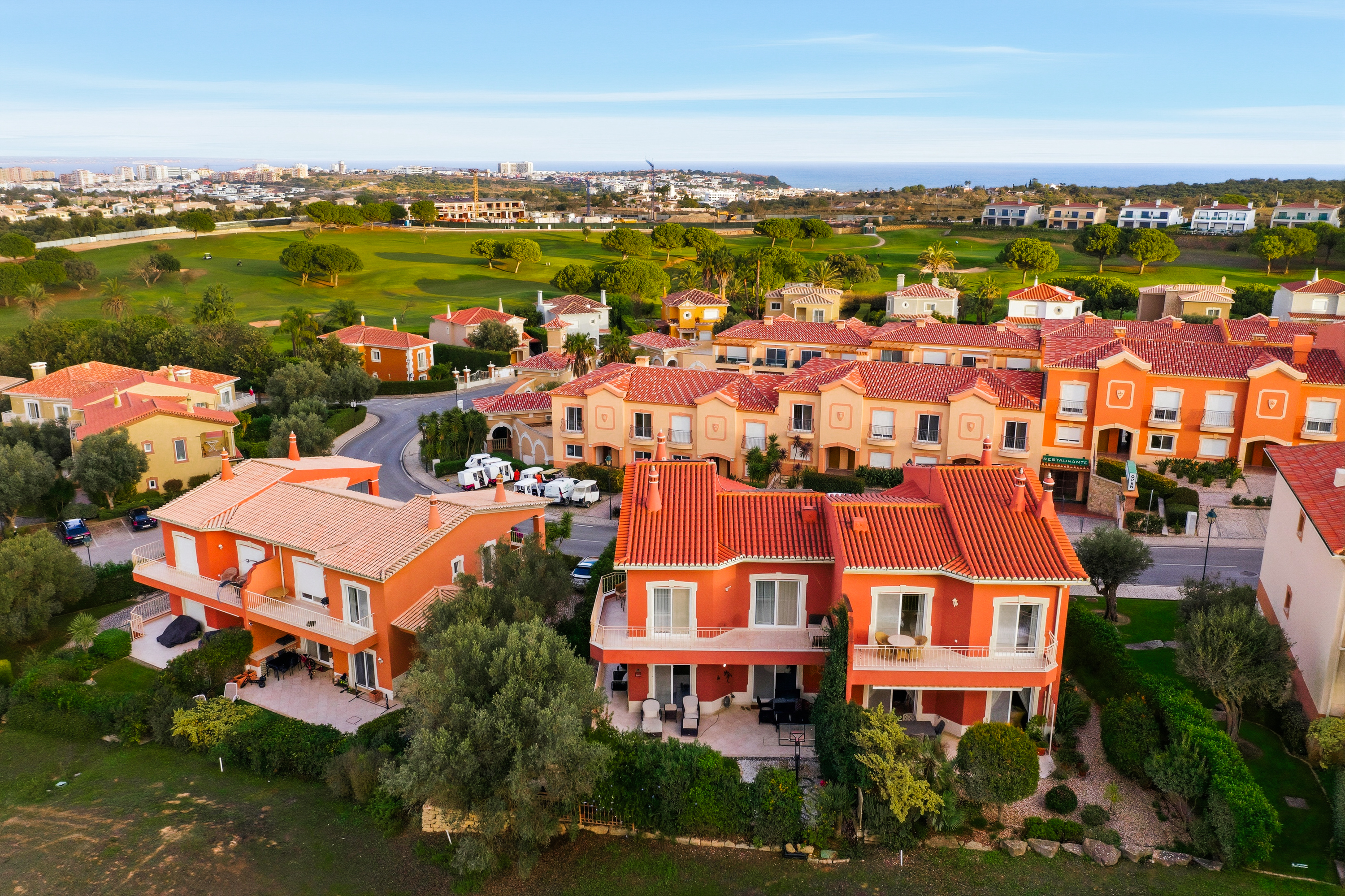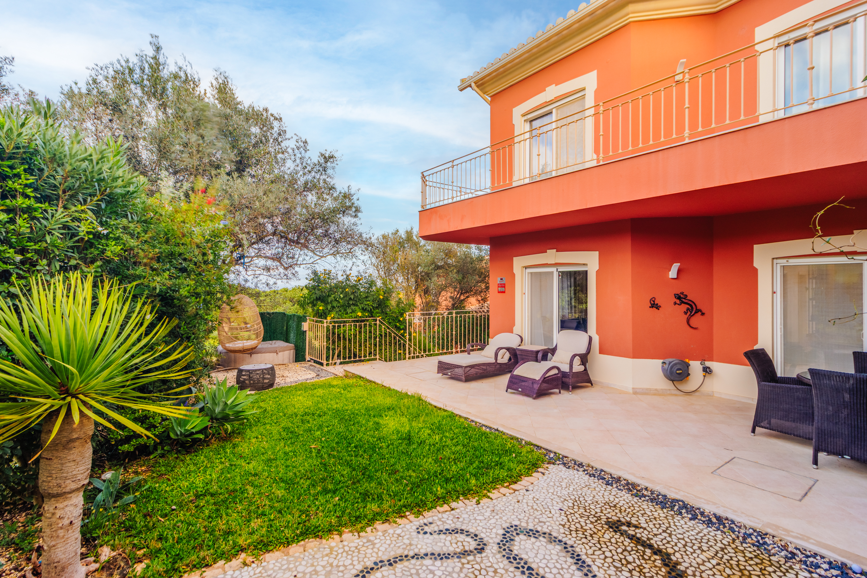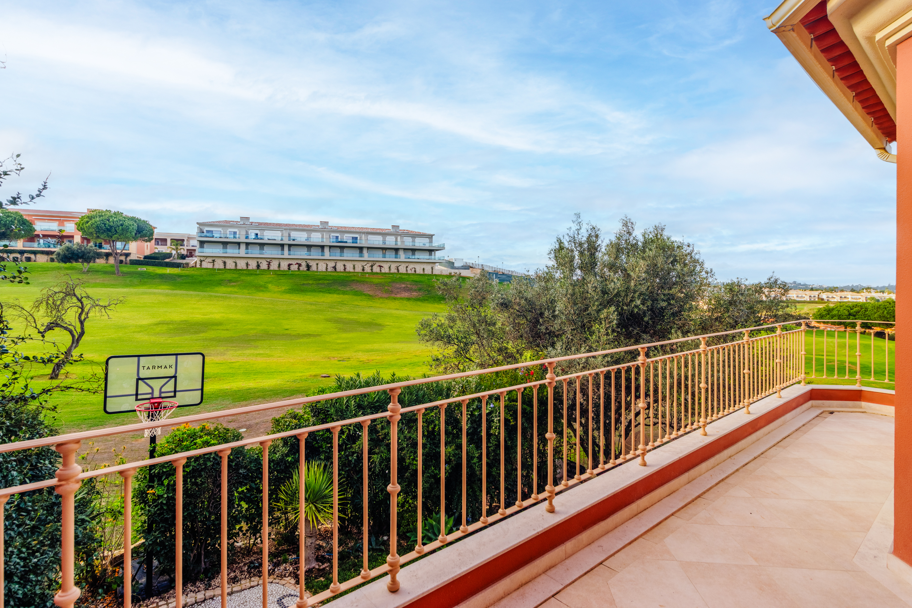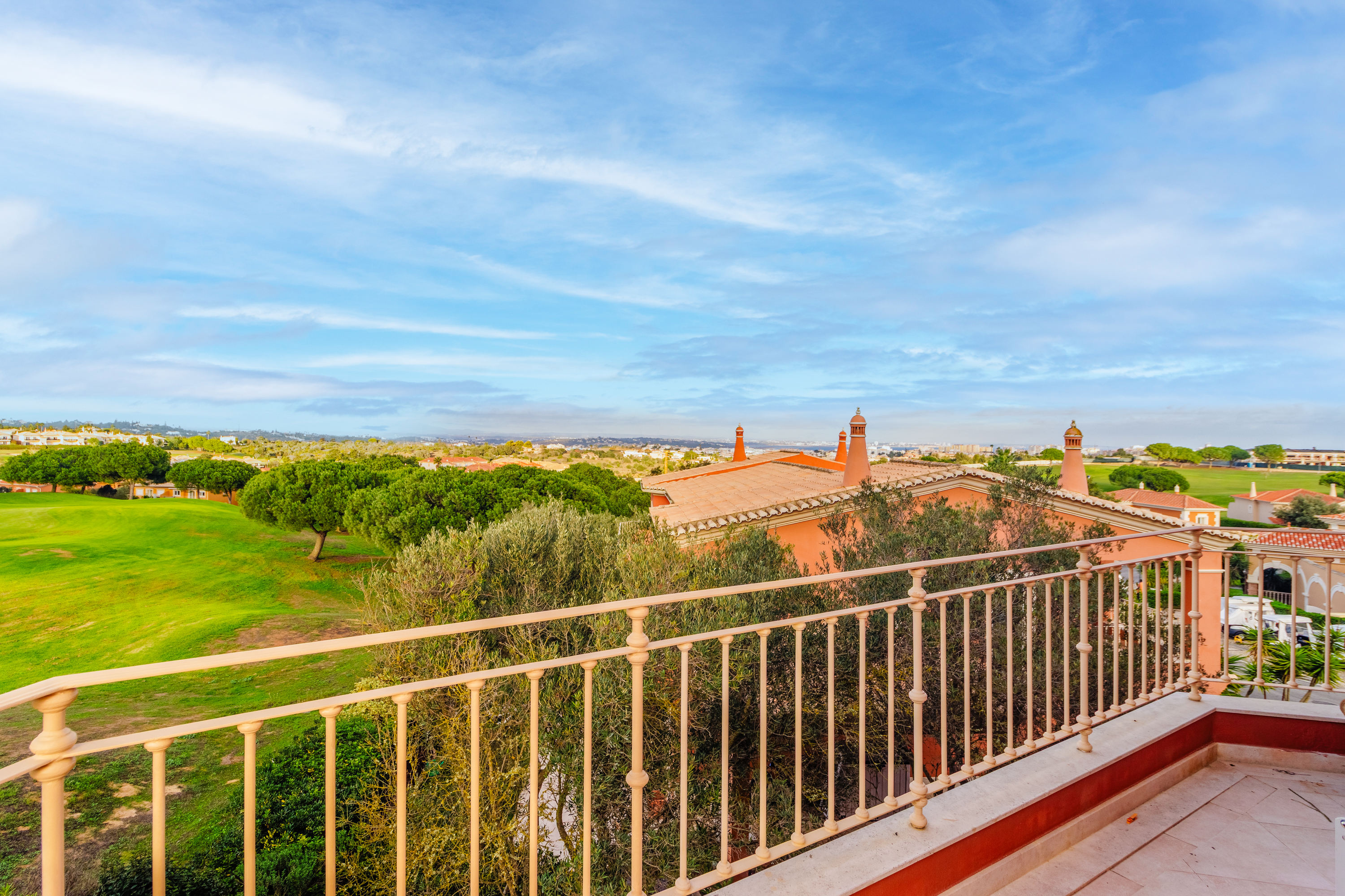 Im Obergeschoss befinden sich zwei weitere Schlafzimmer, jeweils mit eigenem Bad und direktem Zugang zu einer großen umlaufenden Terrasse, die viel Platz bietet, um die Sonne der Algarve zu genießen. An der Vorderseite des Hauses sorgt ein verglaster Balkon mit Faltglaspaneelen für einen vielseitig nutzbaren Raum das ganze Jahr über. Von hier aus bietet sich ein Panoramablick über das Resort und bis hin zu den Bergen in der Ferne.