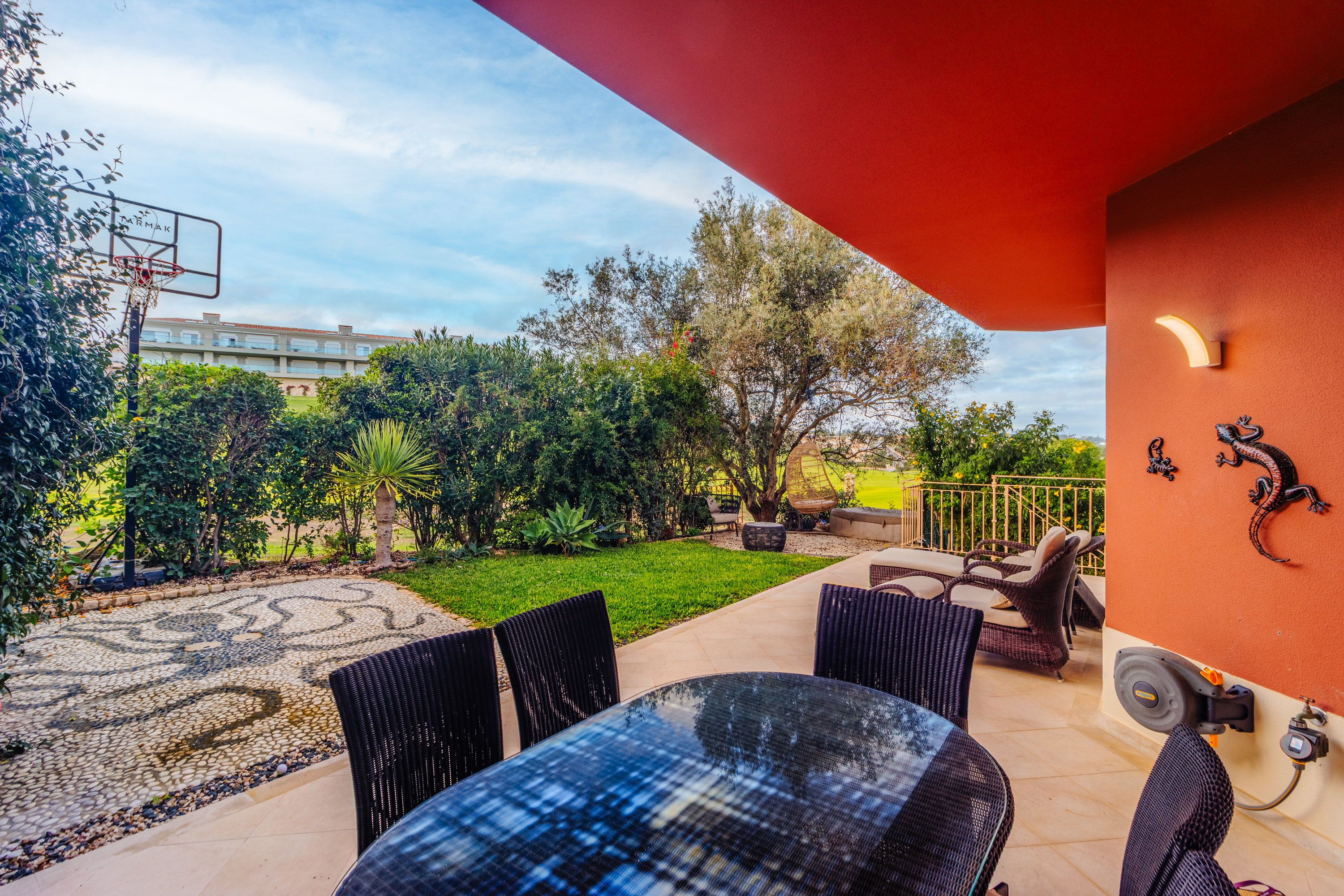 Im Untergeschoss bieten eine große private Garage und ein Abstellraum hervorragenden Platz für Fahrzeuge, Golfausrüstung oder Strandequipment. Draußen lädt ein privater Garten mit Blick auf den Golfplatz zu Entspannung oder geselligen Momenten im Freien ein.