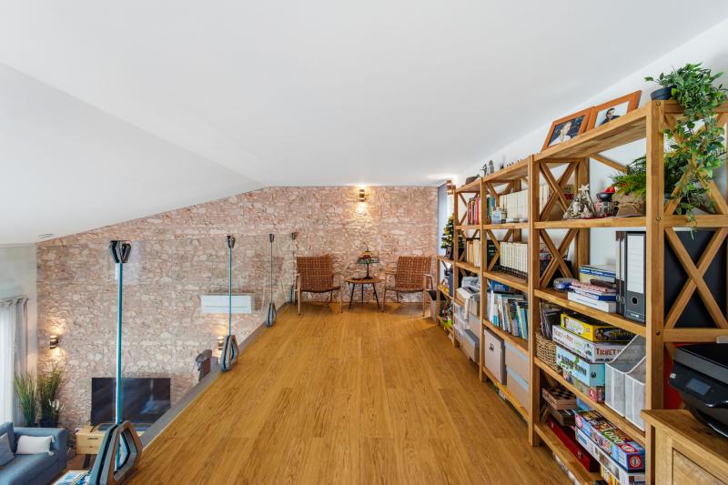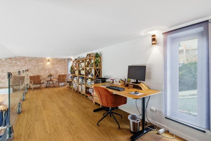 Eine stilvolle Treppe führt zur darüberliegenden Galerieebene, die derzeit als Büro oder Bibliothek genutzt wird. Lichtdurchflutet und mit erhöhter Aussicht eignet sich dieser Bereich ideal für Homeoffice oder als ruhiger Rückzugsort.