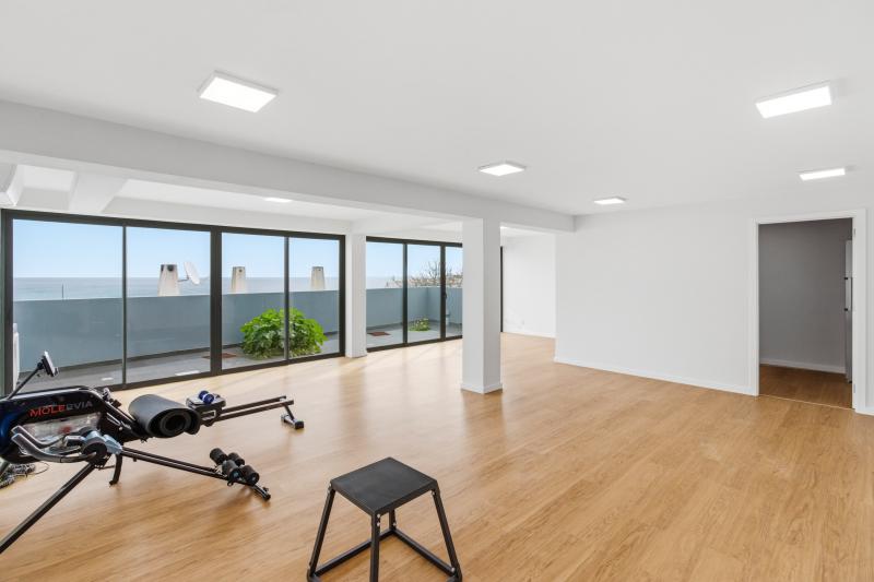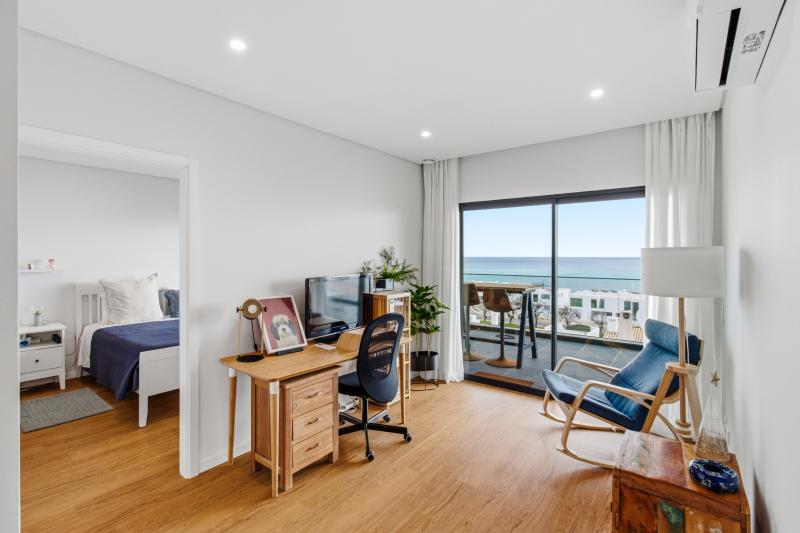 Beim Betreten der Hauptebene gelangen Sie in ein helles und einladendes Wohnzimmer, dessen große Fenster auf einen großzügigen Balkon mit Meerblick führen — der perfekte Ort, um zu entspannen und die freie Aussicht zu genießen.