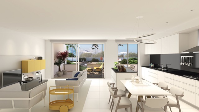 The apartment has a spacious balcony and comes fully equipped with various amenities, such as air conditioning, underfloor heating, solar panels for hot water, central sound system, high-speed Fibre internet, double glazed windows with electric roller blinds. The apartments are also designed to have an energy rating of A.