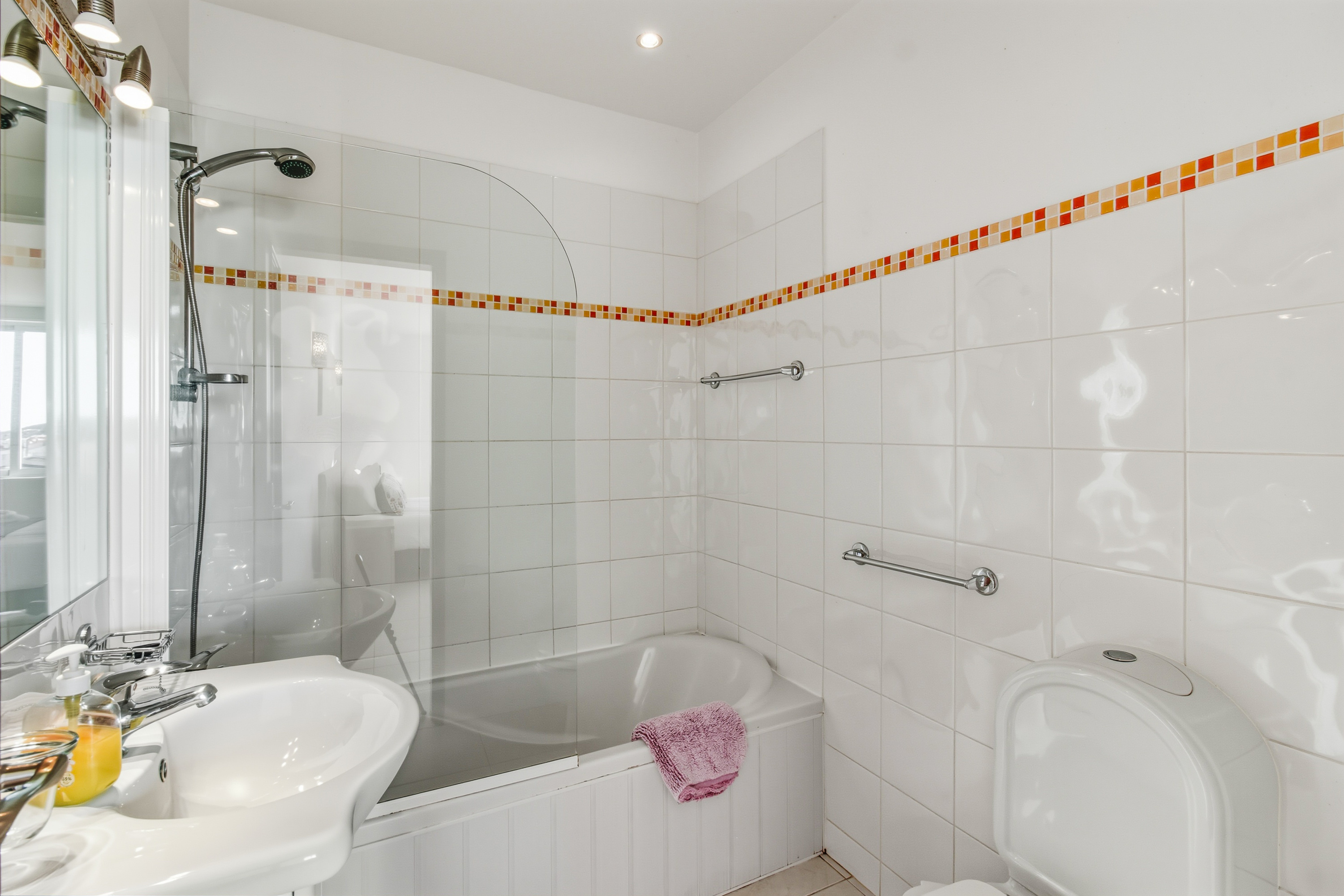The modern, fully equipped kitchen is both stylish and practical. This floor also includes a guest bedroom with an en-suite bathroom.