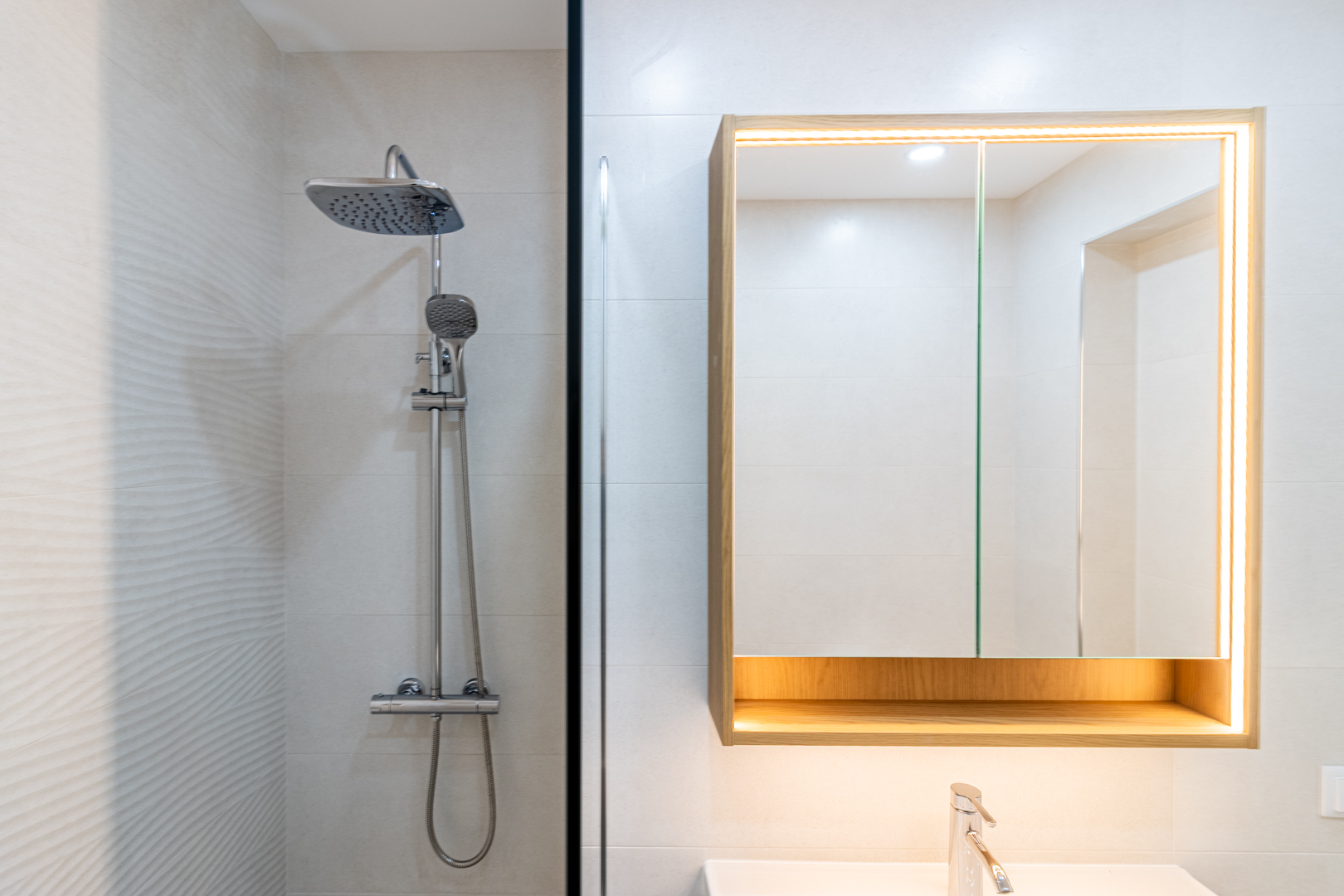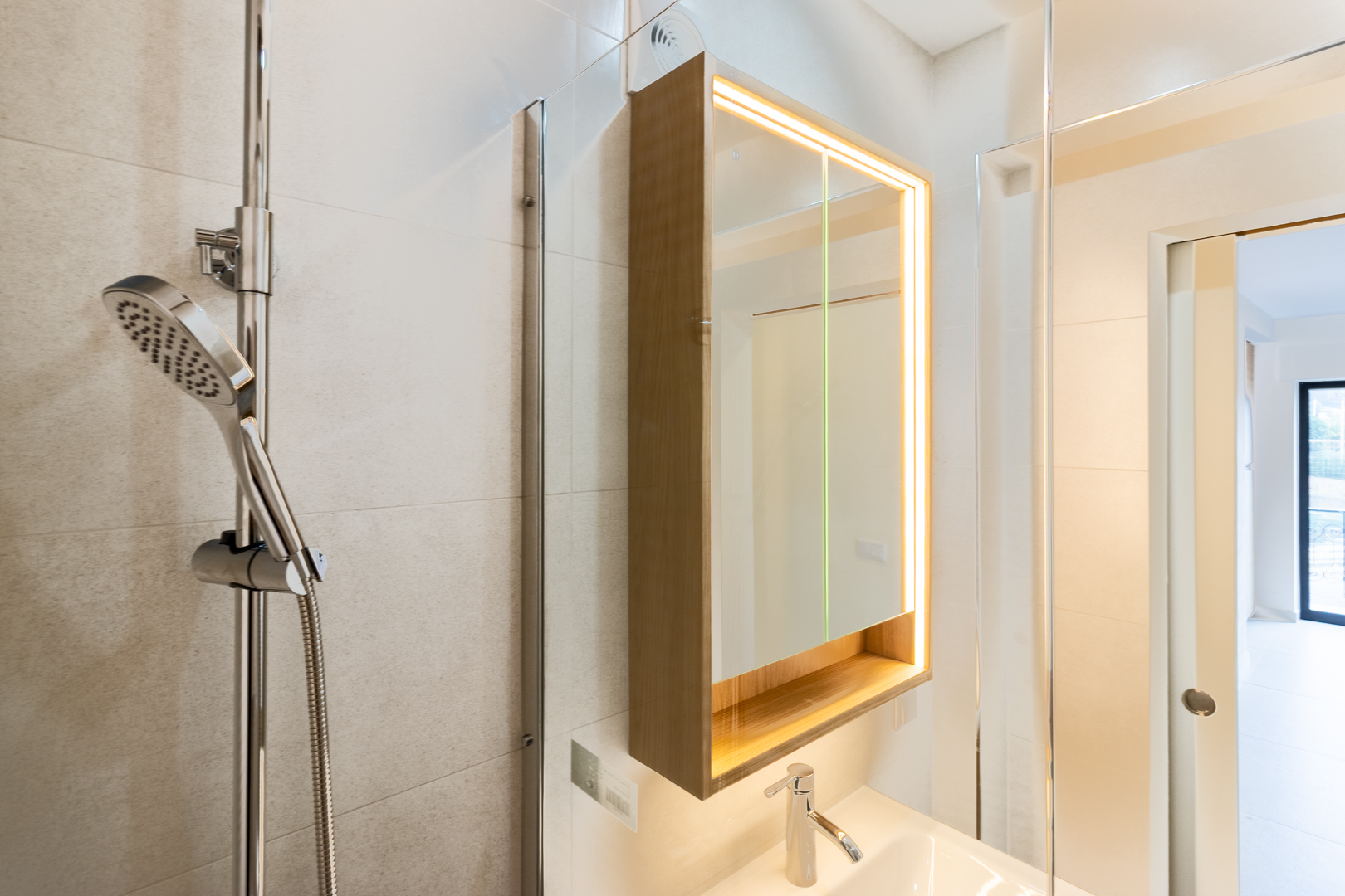 The apartment is further complemented by two modern bathrooms, each equipped with a stylish walk-in shower.