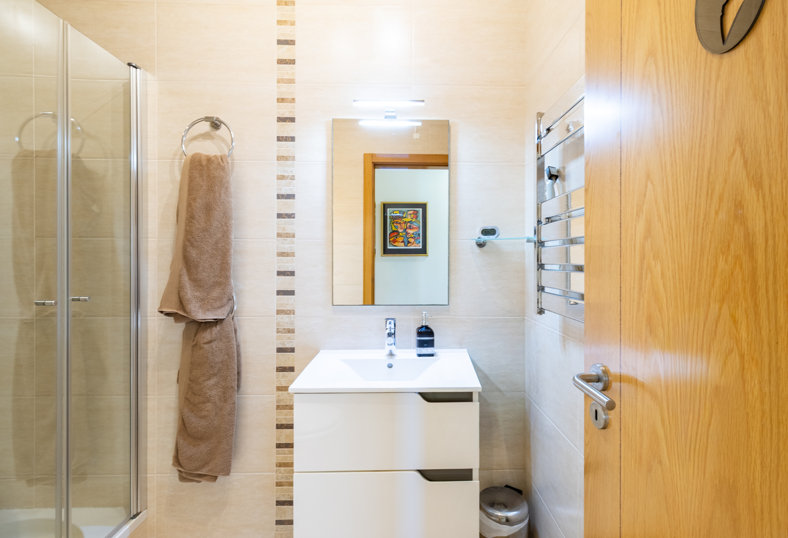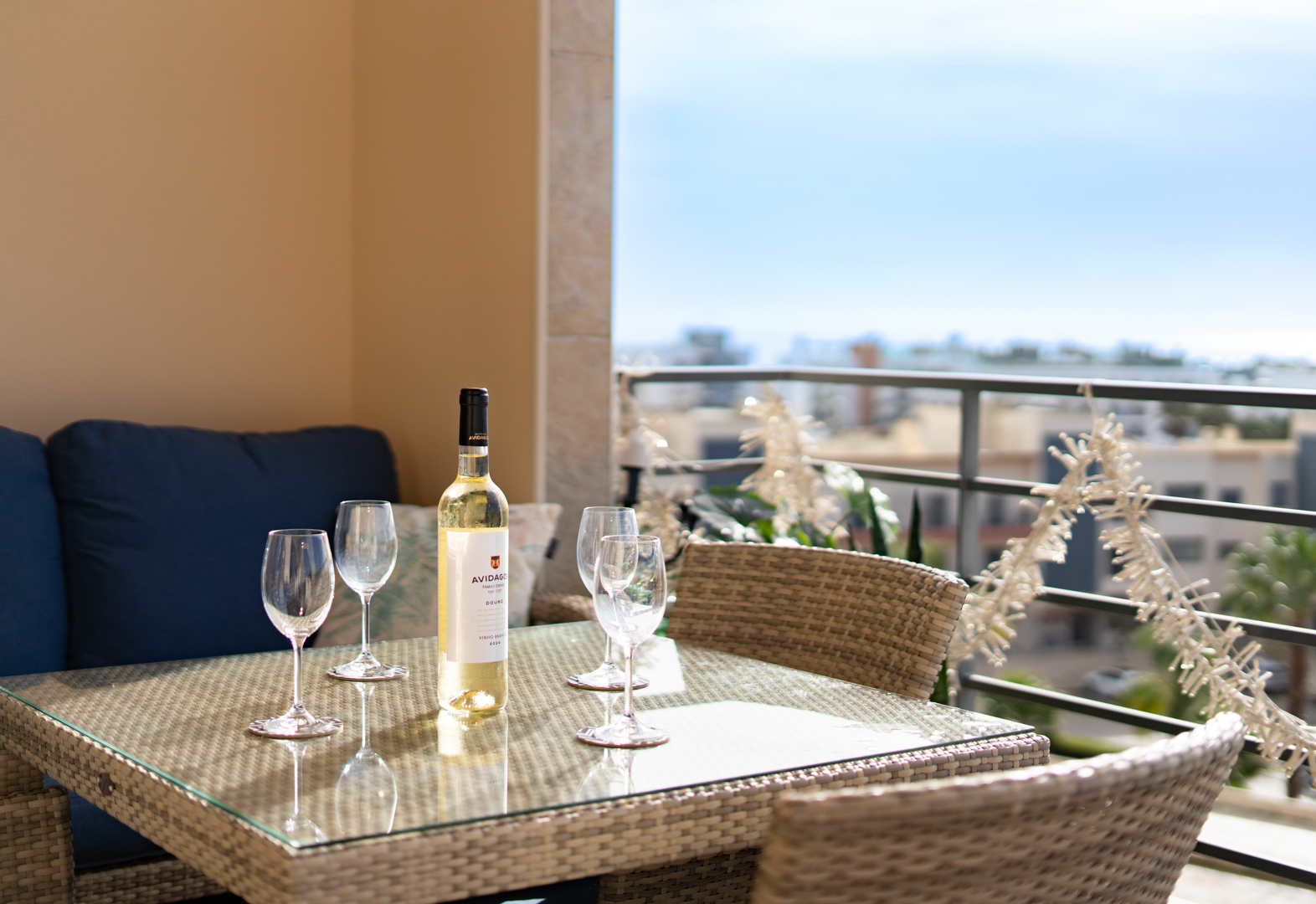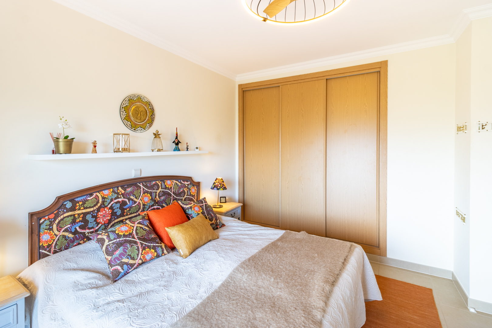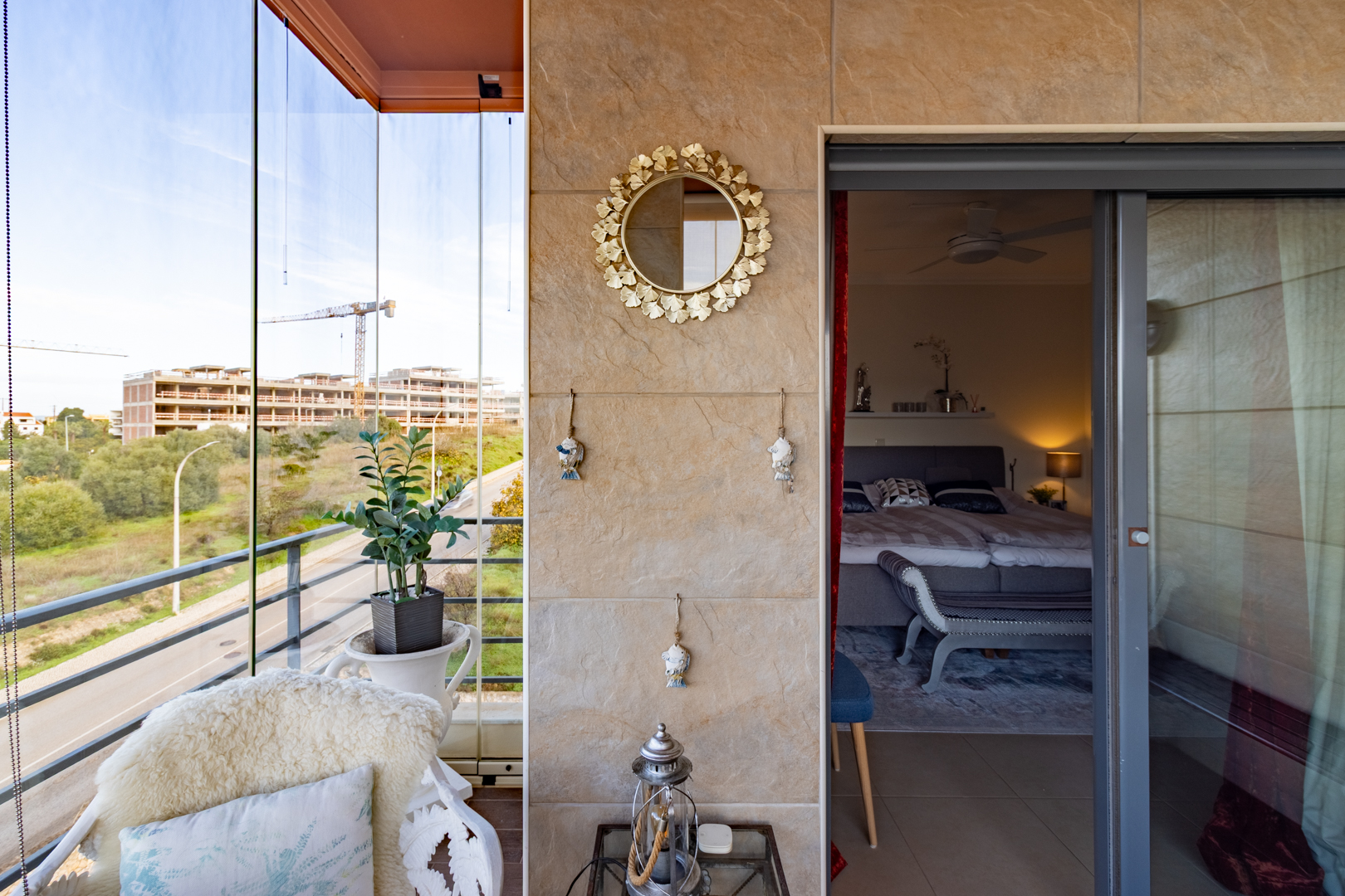 The apartment features three balconies: a spacious south-facing terrace with a built-in BBQ, glass windbreak, and electric awning; a fully glazed west-facing balcony off the main bedroom, ideal to enjoy the sunset; and another glazed balcony off the guest bedroom. From the main terrace, you can enjoy sea views and views towards Avenida, and residents also have access to a large communal rooftop terrace.