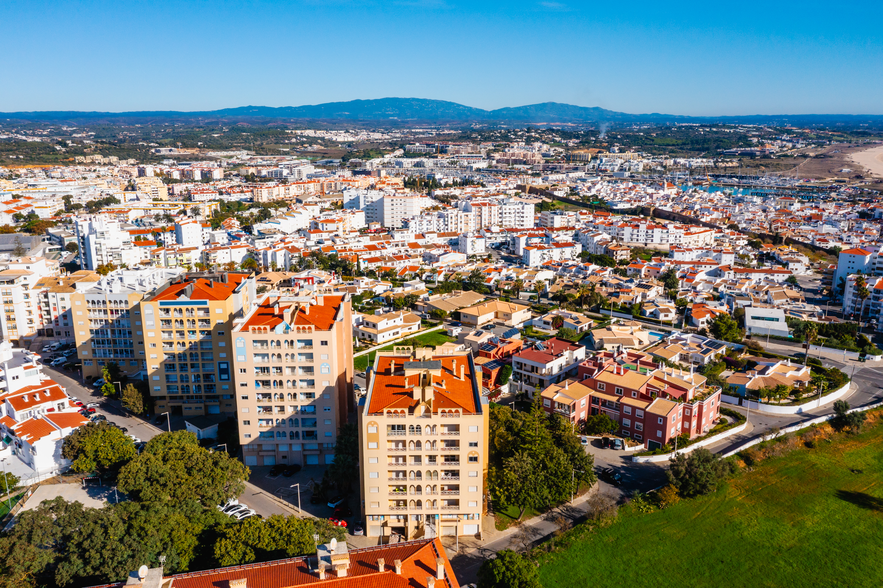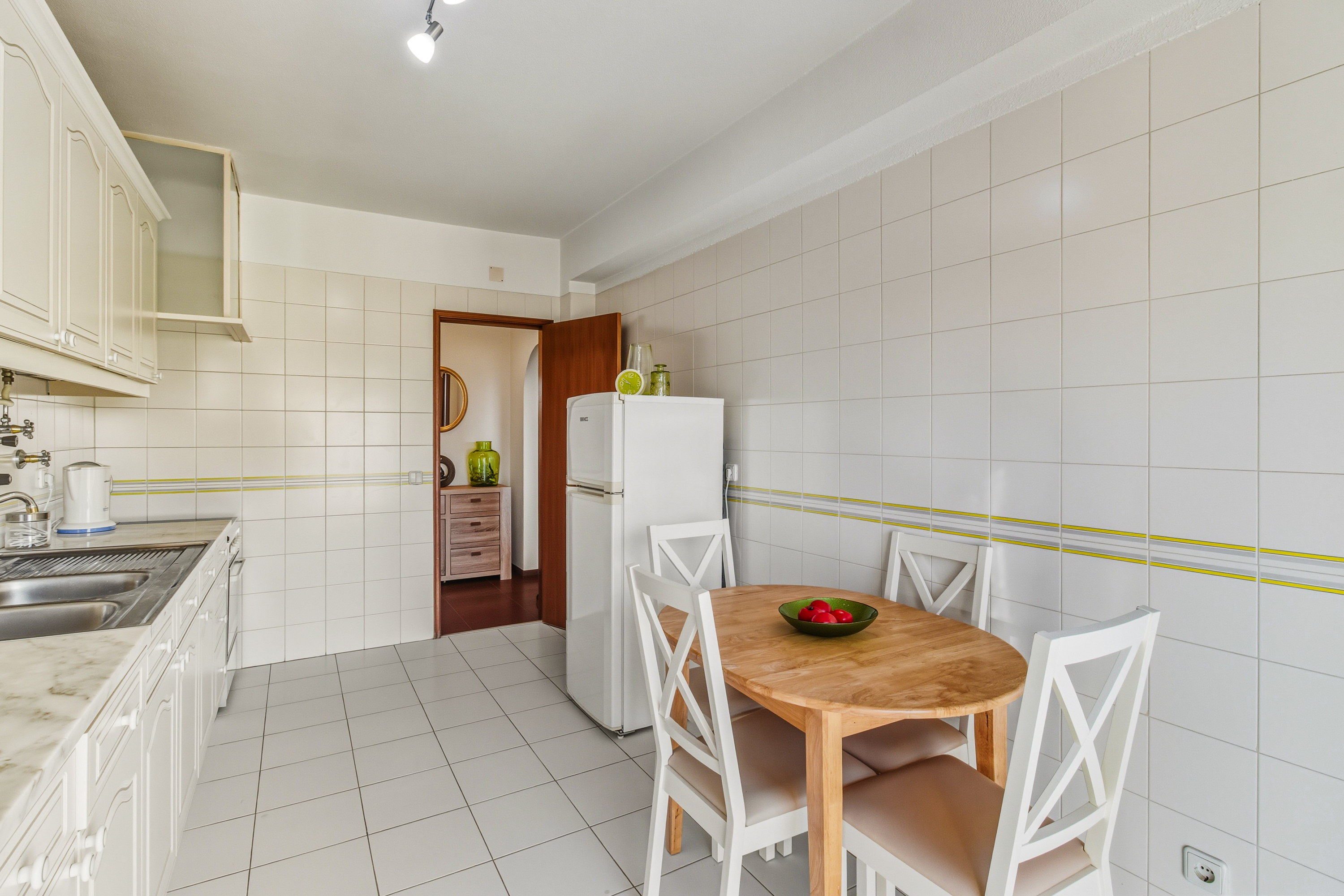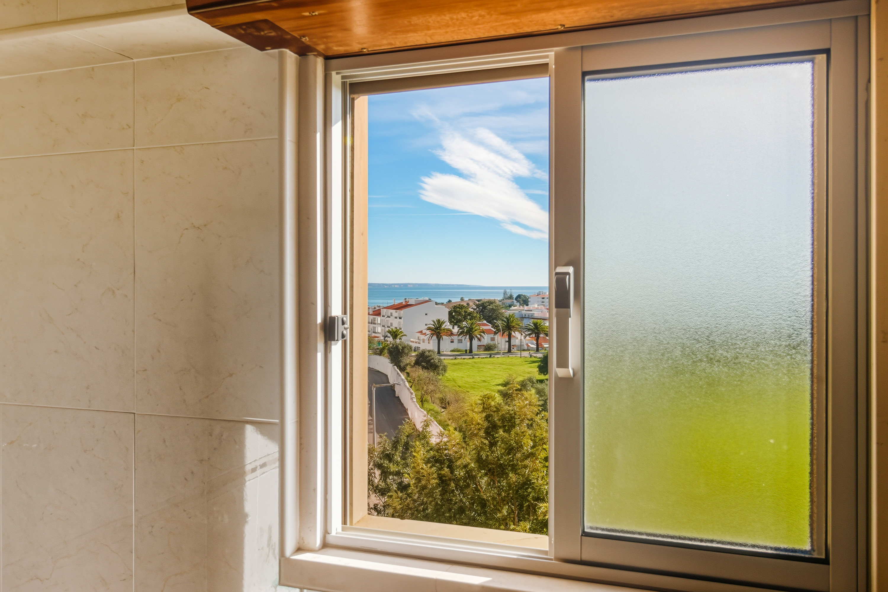 A separate hallway leads to the bedroom area. The master bedroom is positioned to the left and boasts beautiful sea views stretching across to Meia Praia, as well as a private balcony—an ideal spot to enjoy the morning sun. On the opposite side is the second bedroom, currently arranged as a twin room, which is spacious and features fitted wardrobes. A family bathroom is conveniently located between the two bedrooms.