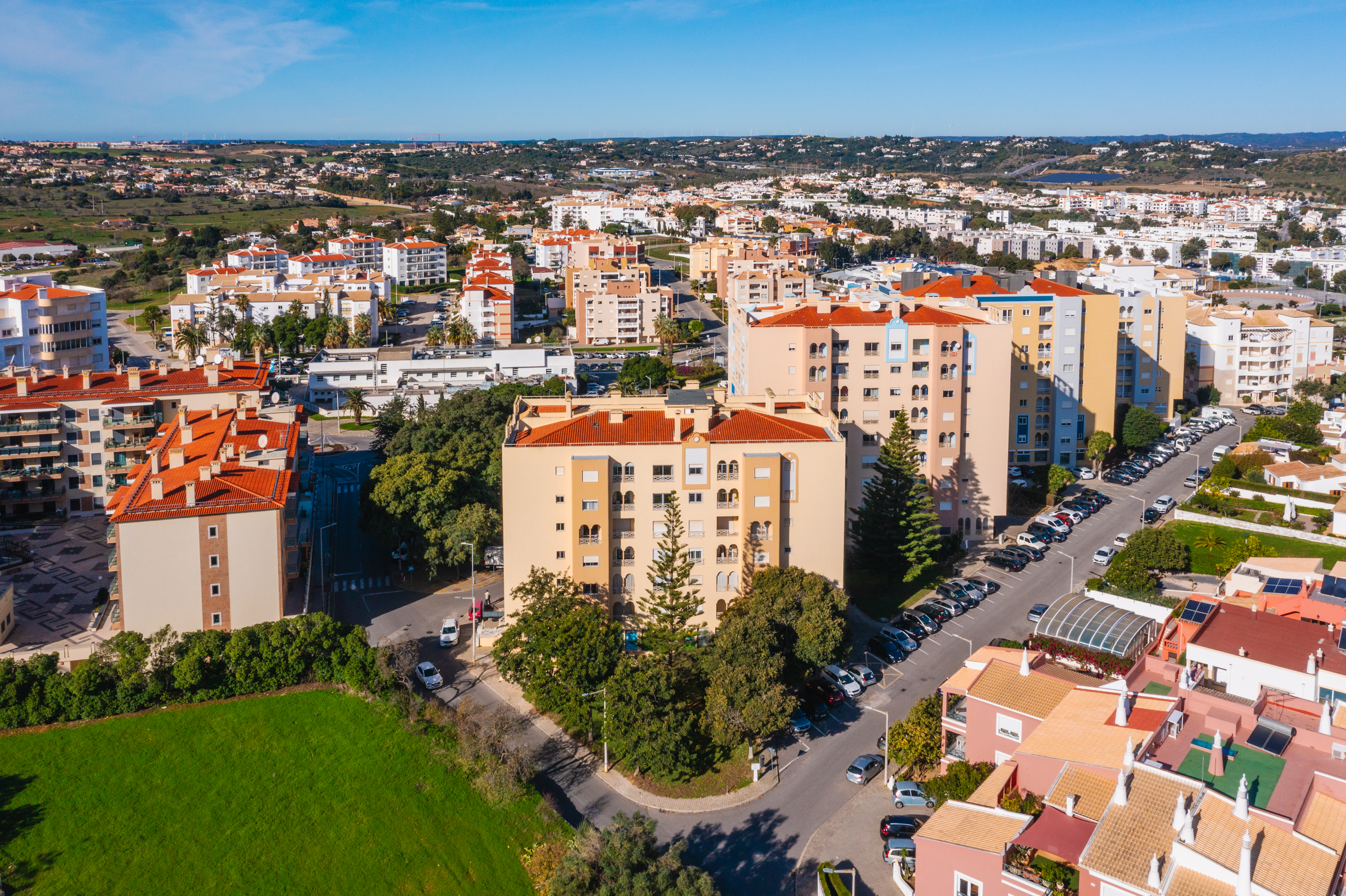 The apartment opens into a welcoming entrance hall that leads through to a bright, open-plan living and dining area. Large sliding doors open onto a spacious southwest-facing terrace, the perfect place to enjoy afternoon and evening sunshine while taking in views across to Boavista Golf Course in the distance.