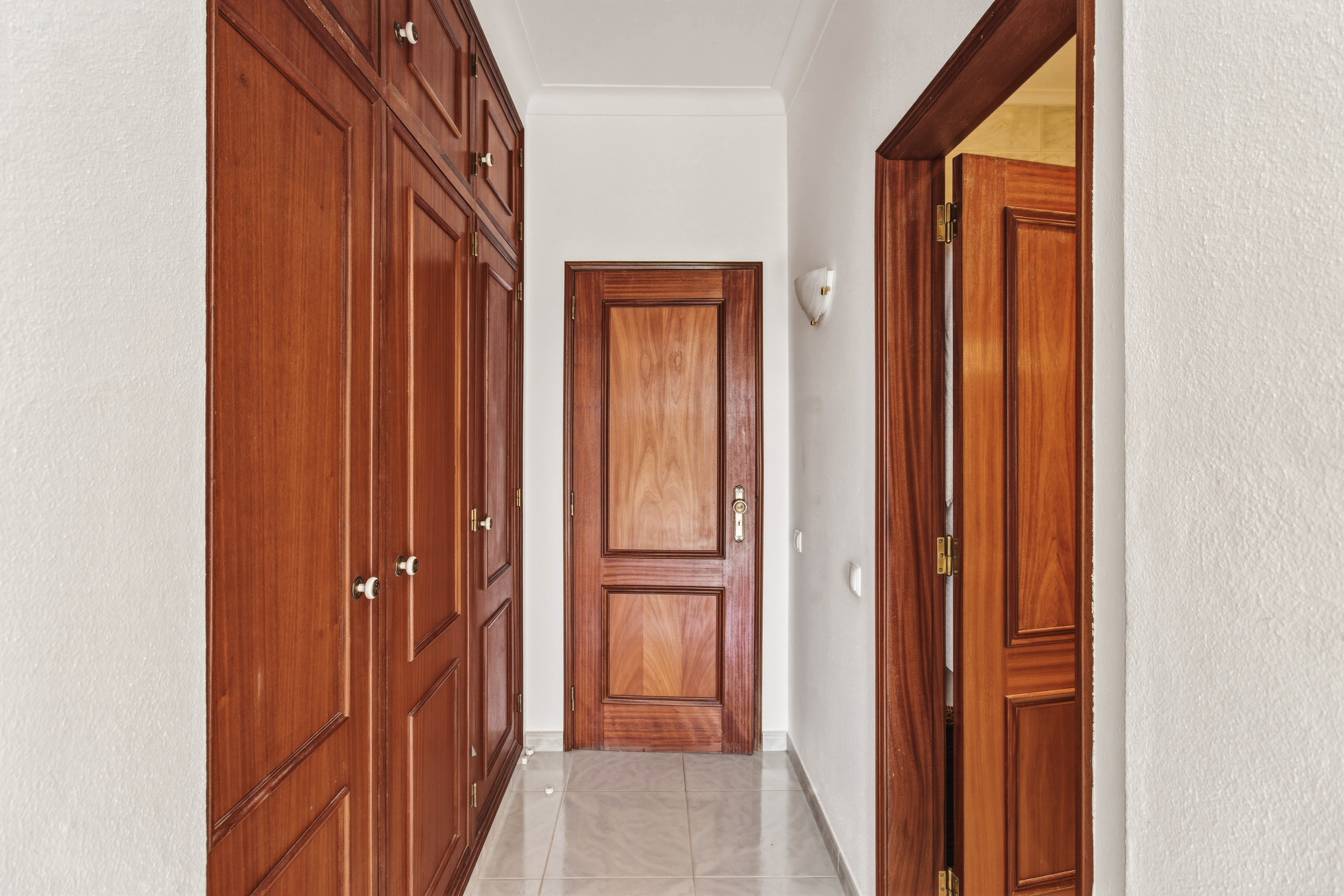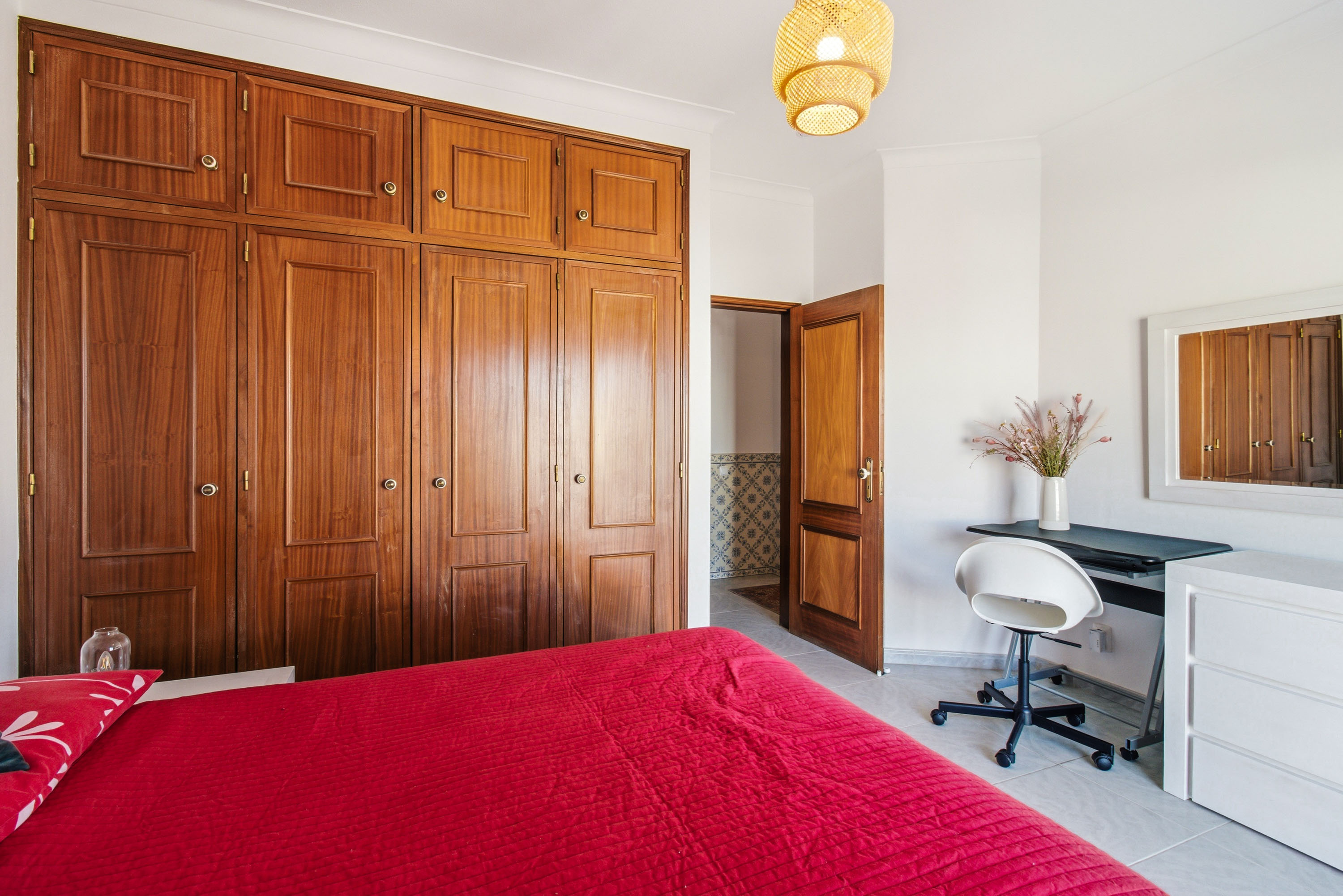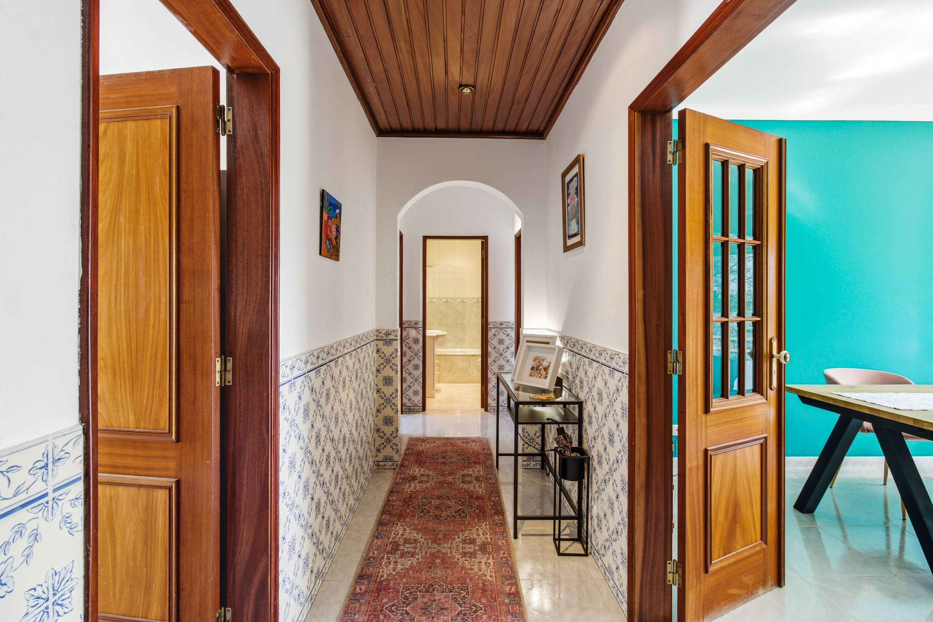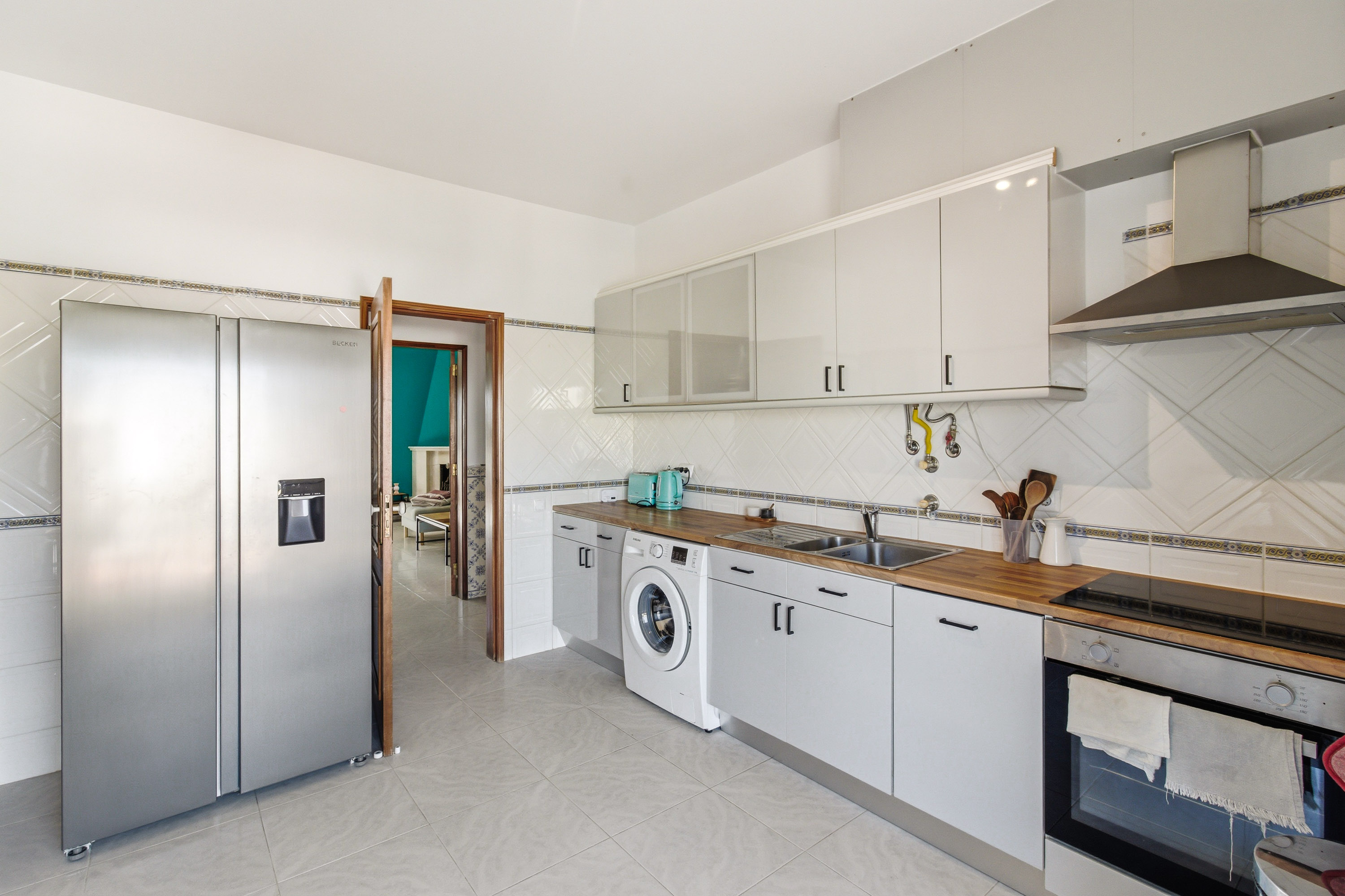 The property opens into an entrance hall featuring traditional Portuguese tiles, adding character to the space. From here, the layout leads into a bright living room with a wood-burning fireplace and direct access to a spacious balcony where you can sit and enjoy the sun.