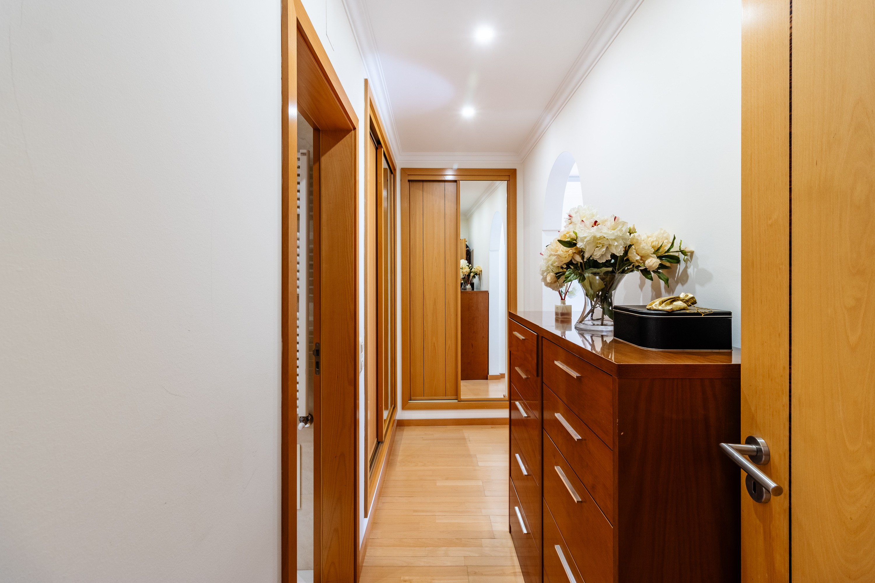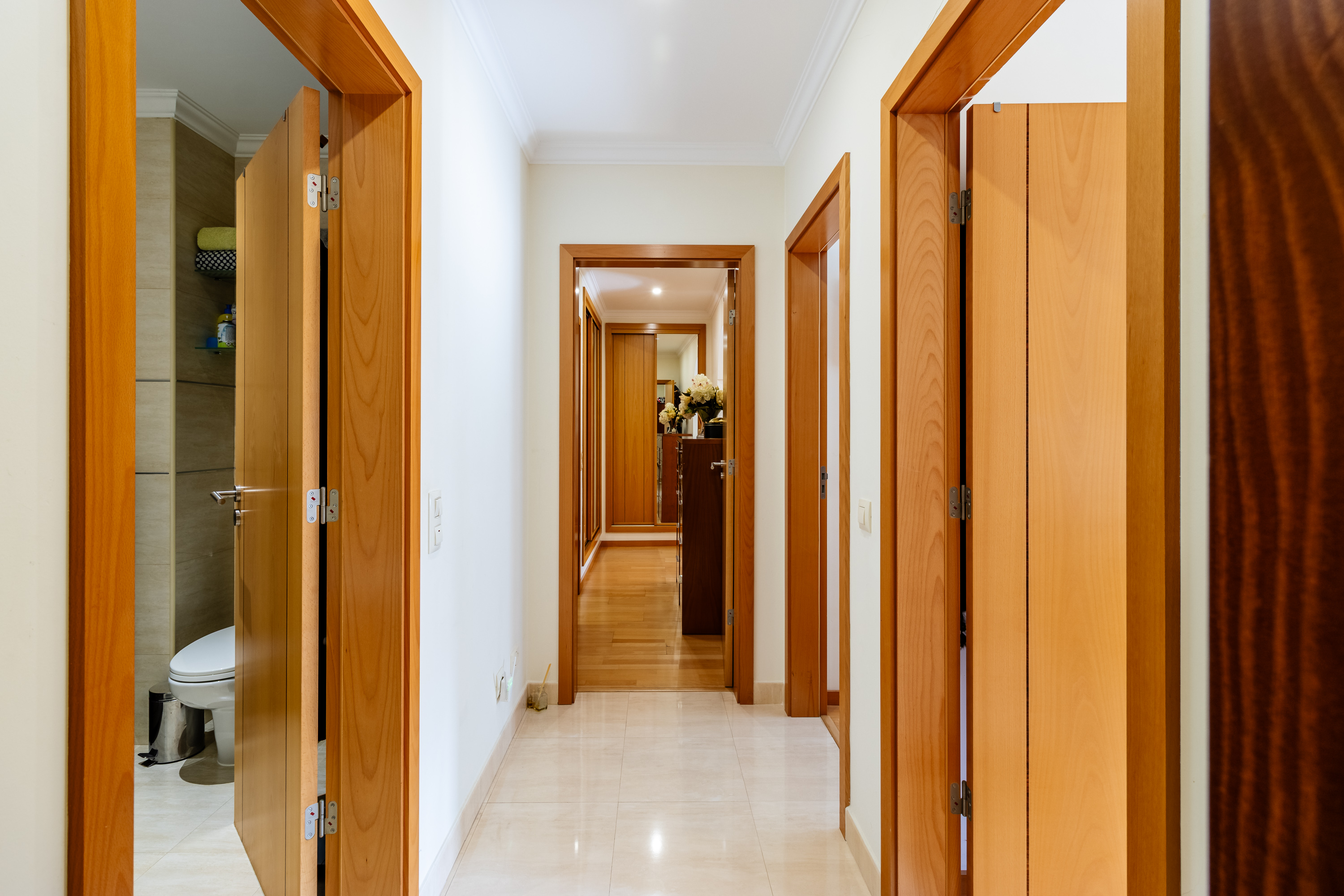 The corridor continues to two spacious guest bedrooms, both featuring fitted wardrobes and sharing a family bathroom with a shower.