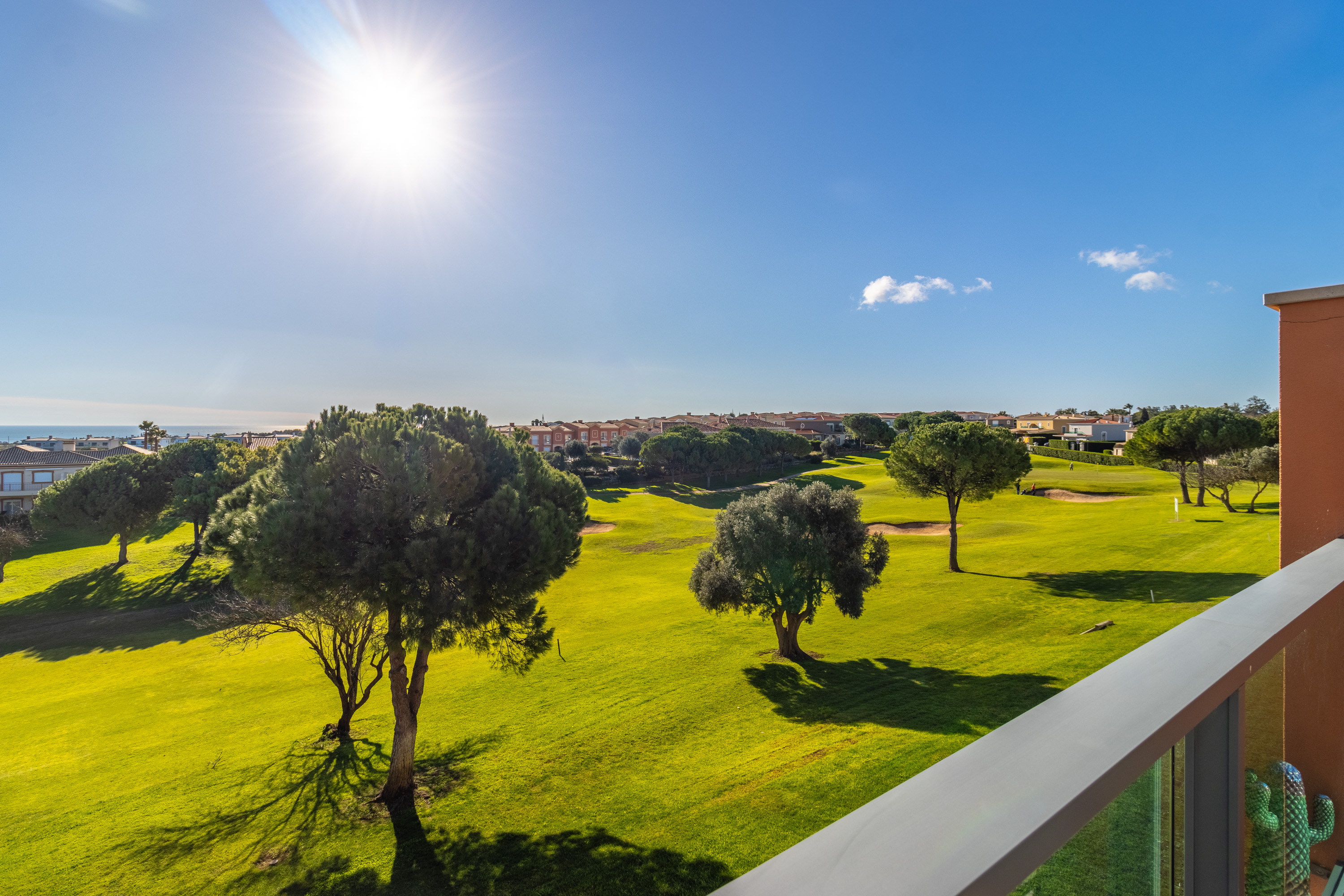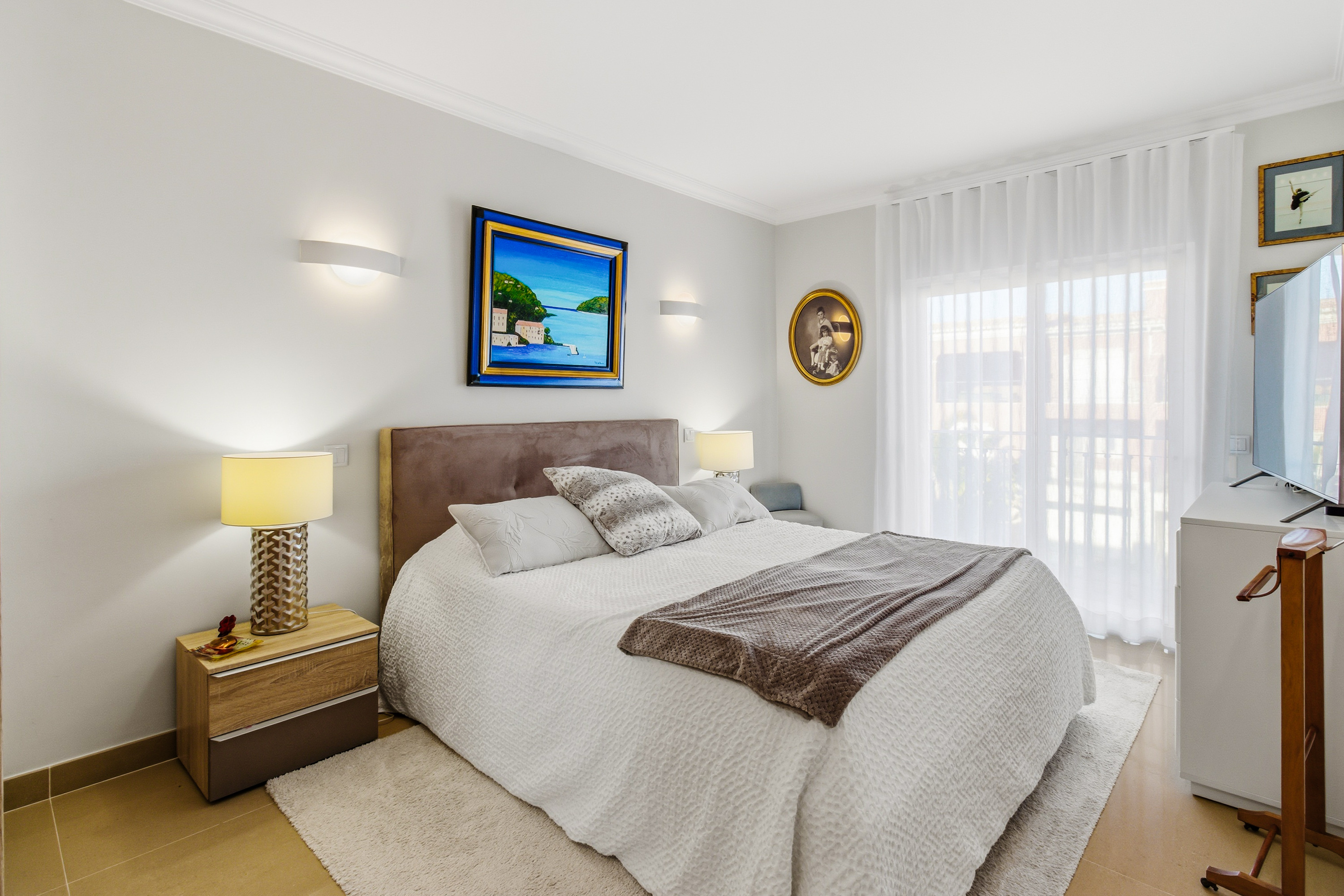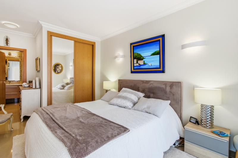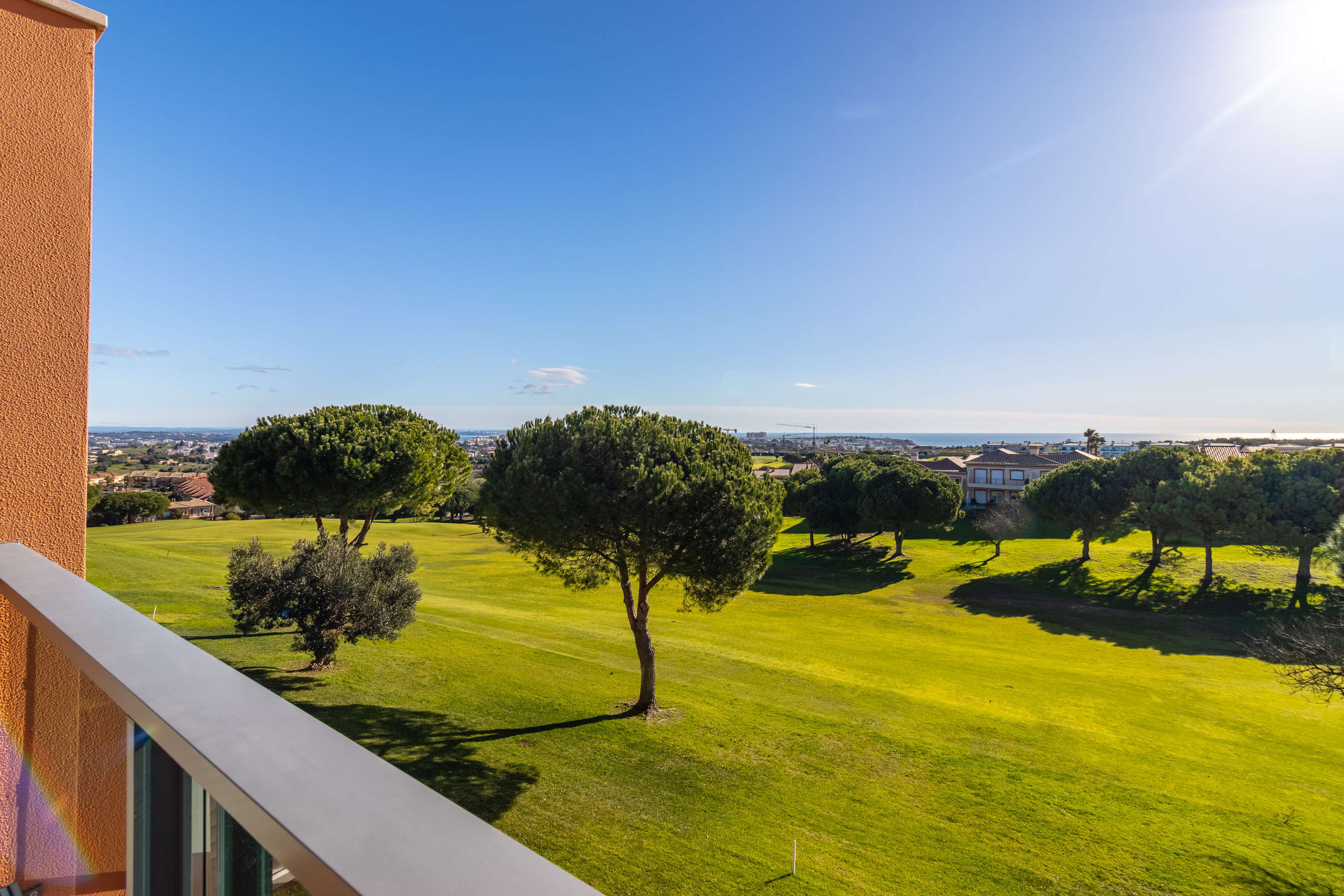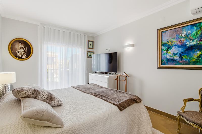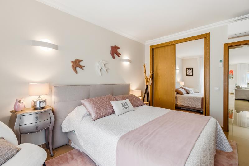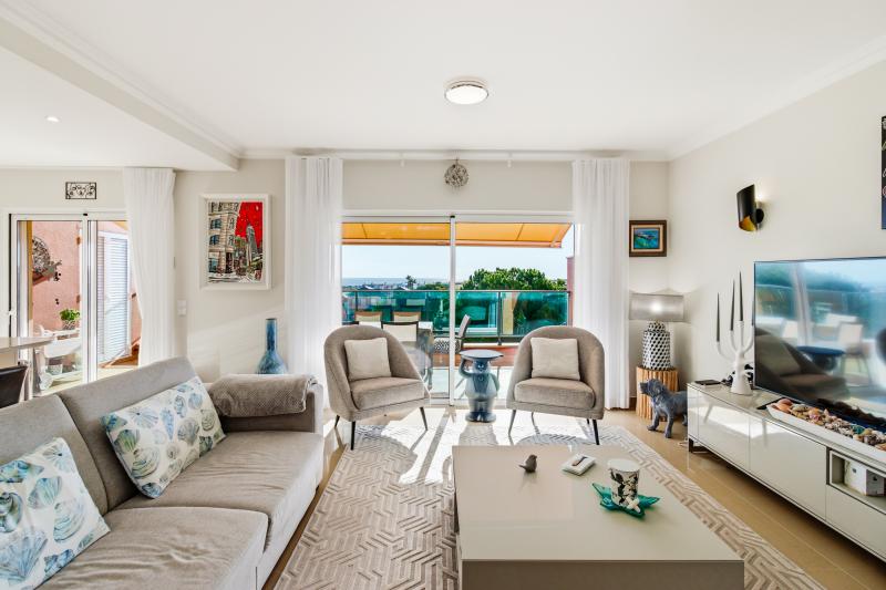 This room opens onto a large south-southeast facing terrace where you can enjoy outdoor meals protected from the sun by electric awnings, from which you can enjoy the fantastic open view of the golf and Lagos Bay.