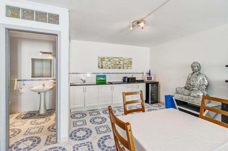 From here, doors open onto a terrace with steps leading down to the pool area – the perfect spot to cool off in the summer months. The kitchen is fully open to the main space and offers generous worktop areas. Also on this level is a bedroom and a bathroom, ideal for guests or single-level living.