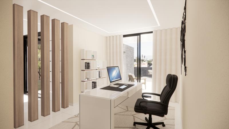 The villa features an open-plan layout that seamlessly flows from through the living room, dining area, and a fully equipped kitchen, creating a stylish and beautiful living space. The villa has 3 bedrooms, all en-suite, along with an office that can easily serve as a fourth bedroom.