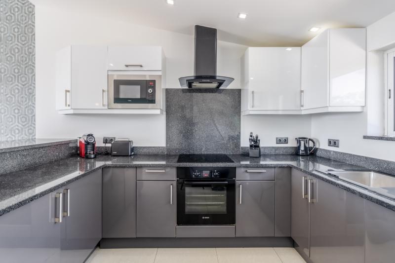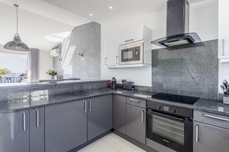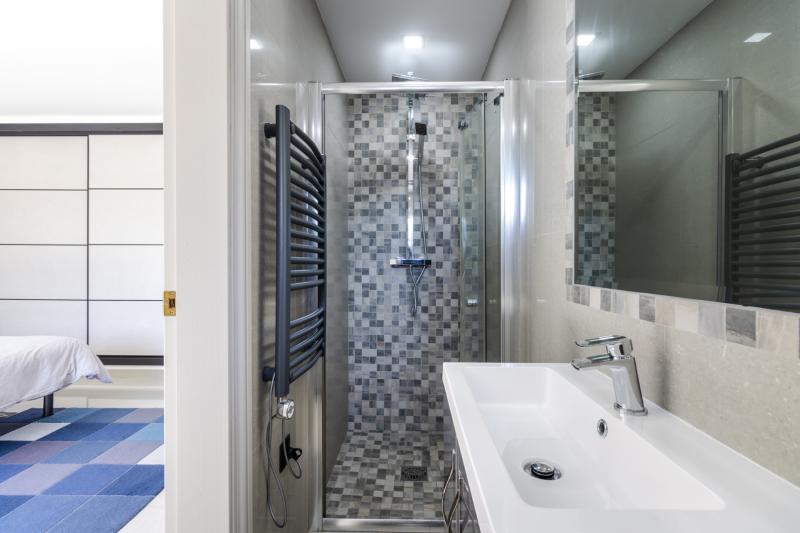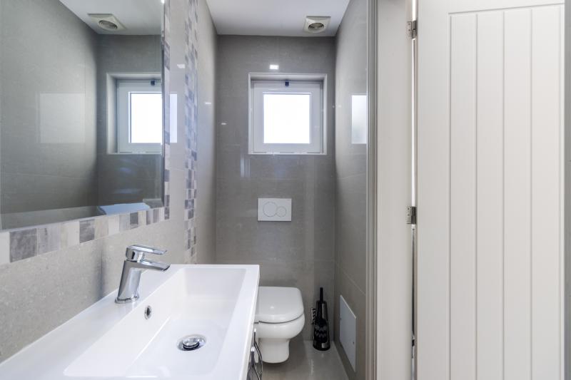 On the upper floor, you’ll find the main living area, composed by an open-plan design that seamlessly integrates a fully fitted kitchen with the living space.