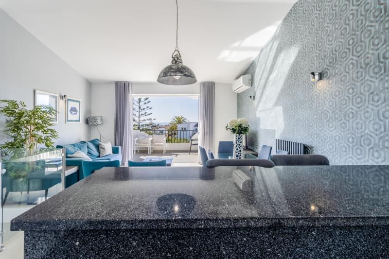 This area opens onto a south-facing terrace, providing stunning views of the black rock formations and the sea beyond.