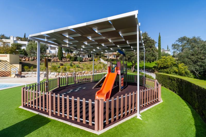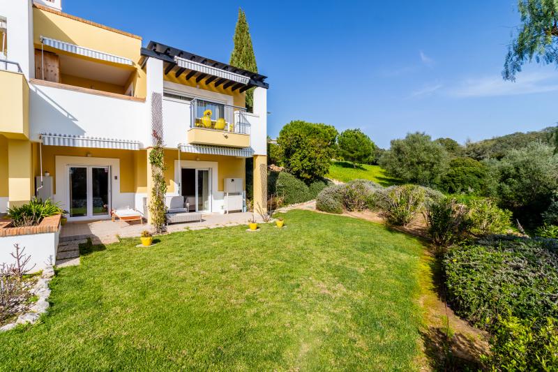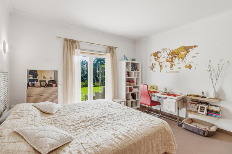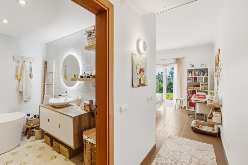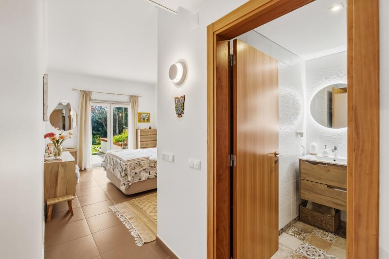 The lower floor is dedicated to the sleeping accommodation. The principal bedroom benefits from a chic en-suite bathroom complete with a bathtub, while the second bedroom also enjoys its own modern en-suite. Both rooms are fitted with wardrobes and walk-in closets and open directly onto a spacious patio that leads into the landscaped garden — a peaceful retreat for outdoor relaxation. A charming stepping-stone pathway offers direct access to the resort’s communal swimming pool.