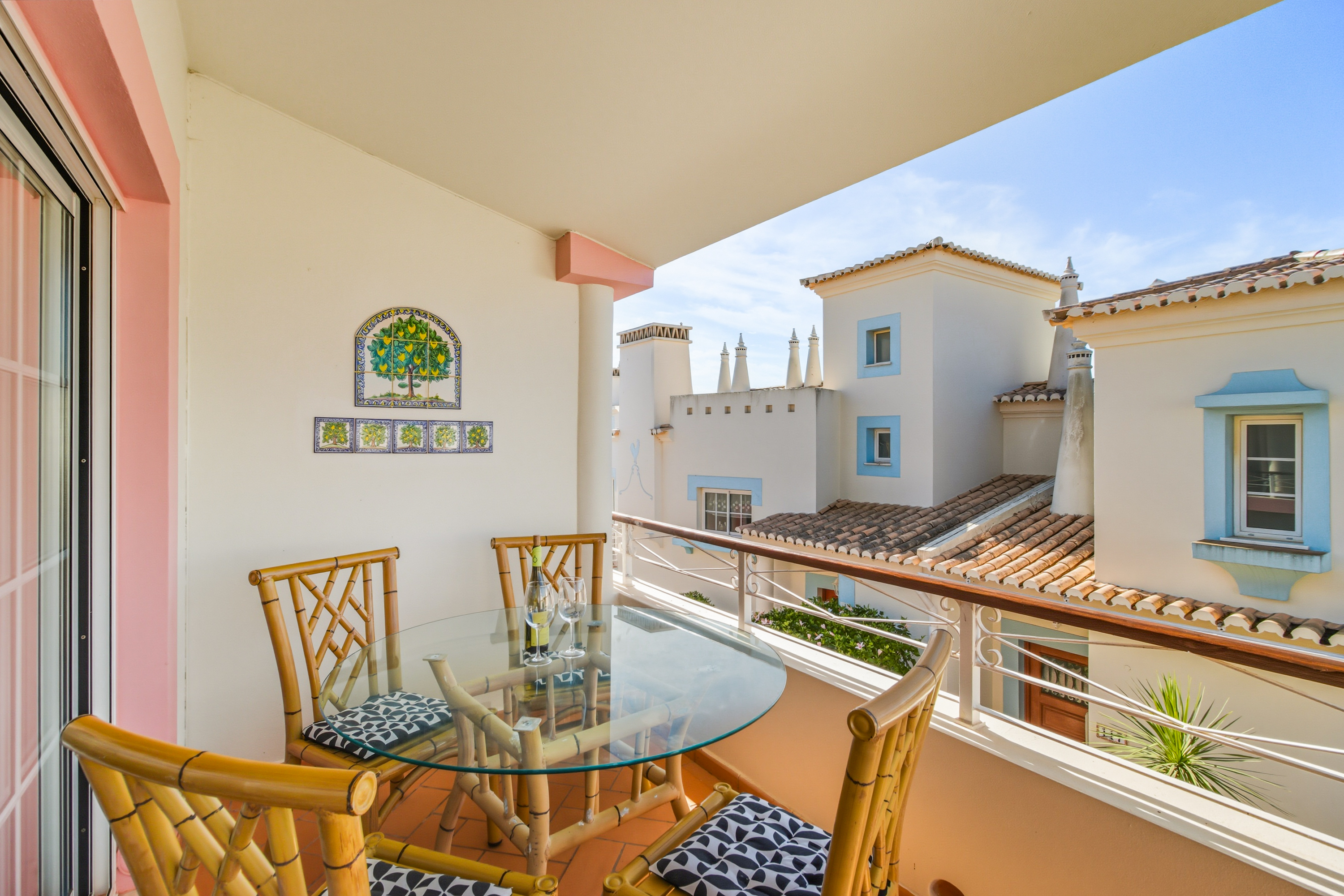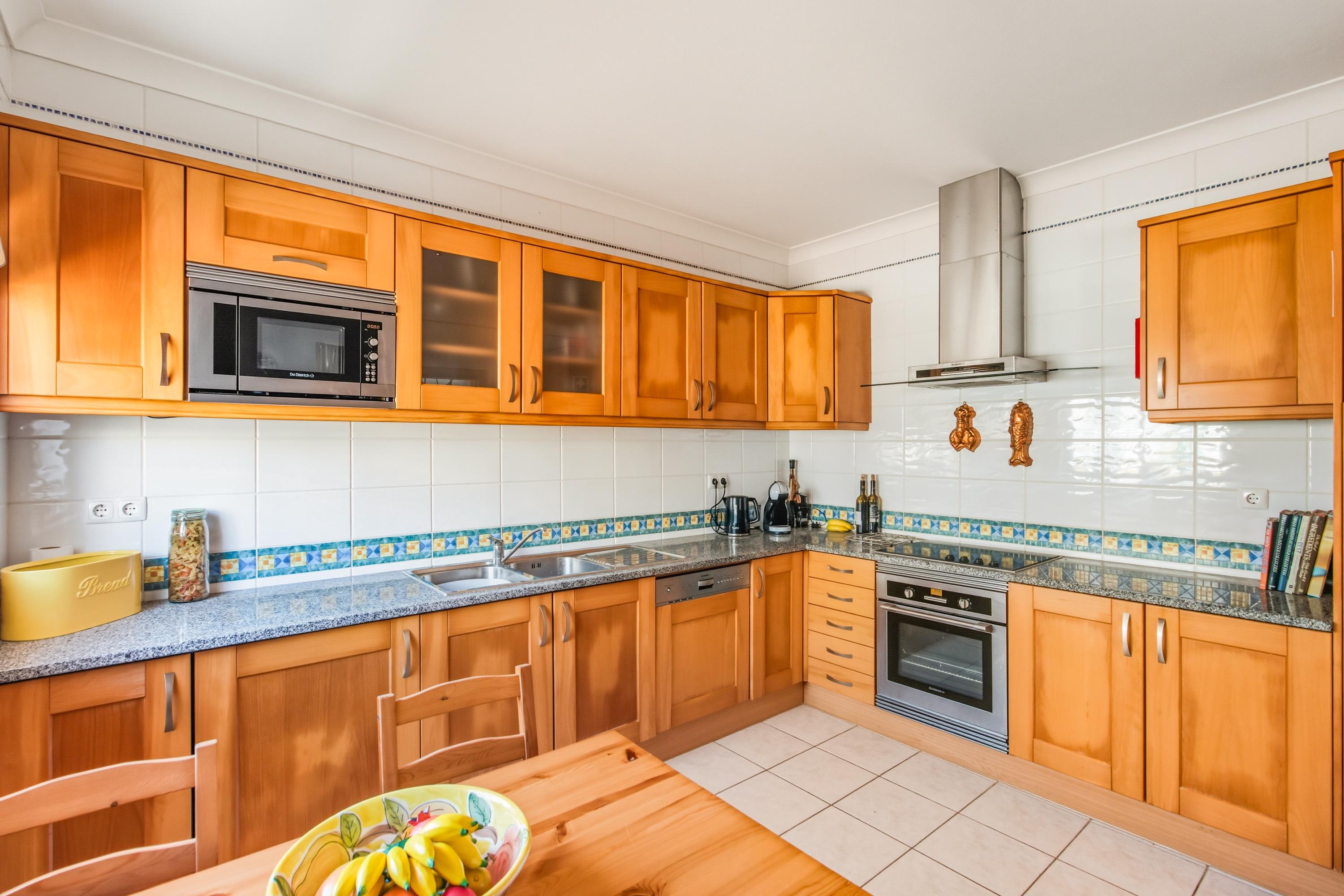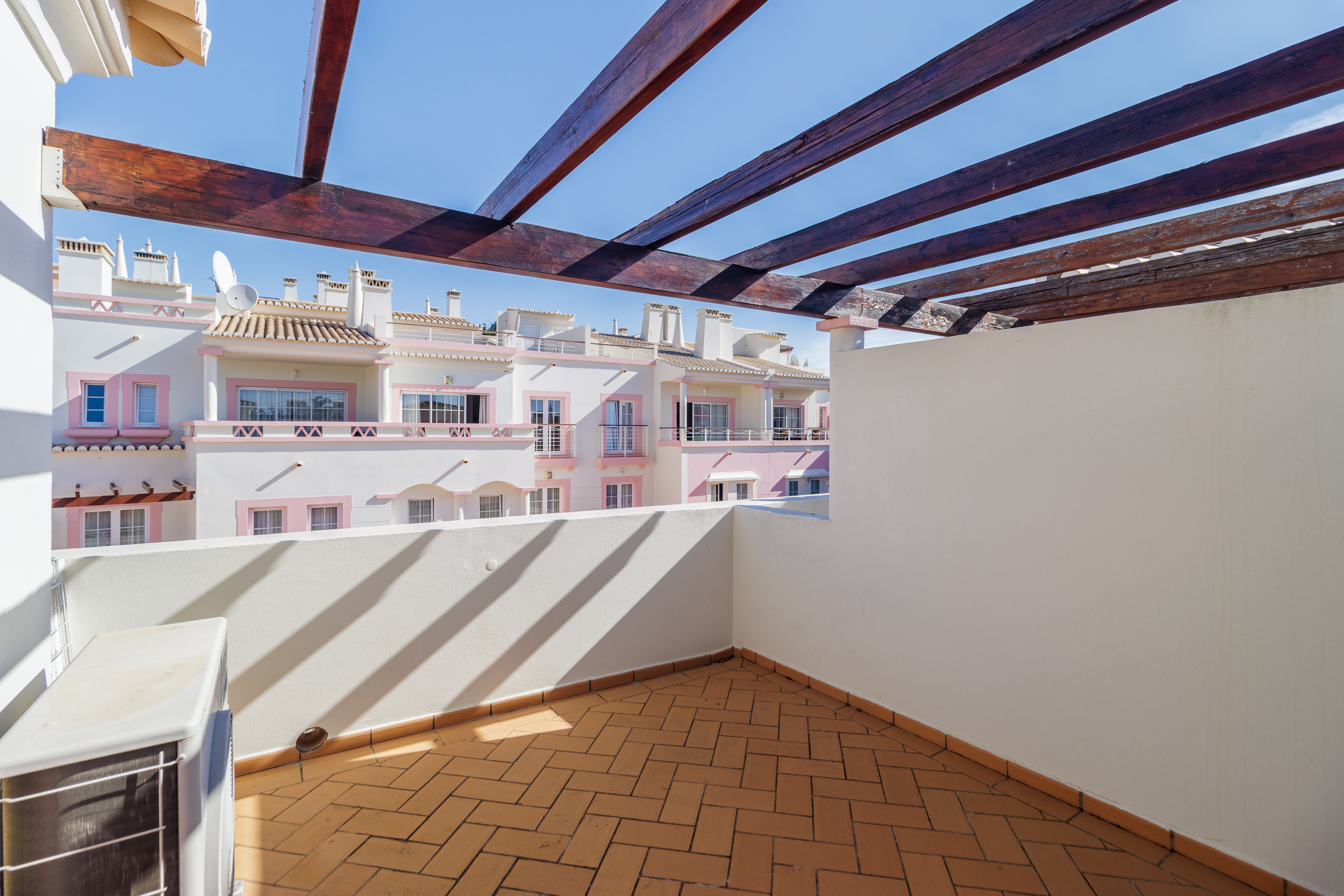 The property opens into a bright and spacious living and dining area featuring a wood-burning fireplace and patio doors leading to a balcony with lovely views over the rooftops and the golf course beyond. Adjacent to the entrance hall is a fully equipped kitchen with integrated appliances. From the lounge, a staircase leads up to a private terrace with a barbecue and outdoor dining area overlooking the communal pool.