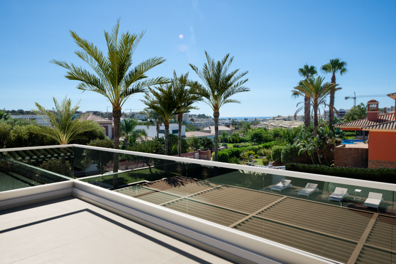 The villa comes with luxurious features like air conditioning, underfloor heating, a heated pool with automatic cover, a sauna, and a landscaped garden with LED lights. Solar panels help with energy efficiency, and there are high-tech security systems.