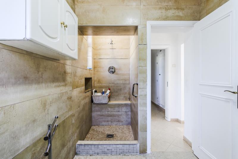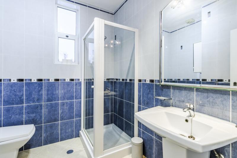 The villa boasts three comfortable bedrooms. The master bedroom includes fitted wardrobes and an en-suite bathroom with a walk-in shower. The remaining two bedrooms share a well-appointed family bathroom. Additionally, there is a handy storage room in the hallway.