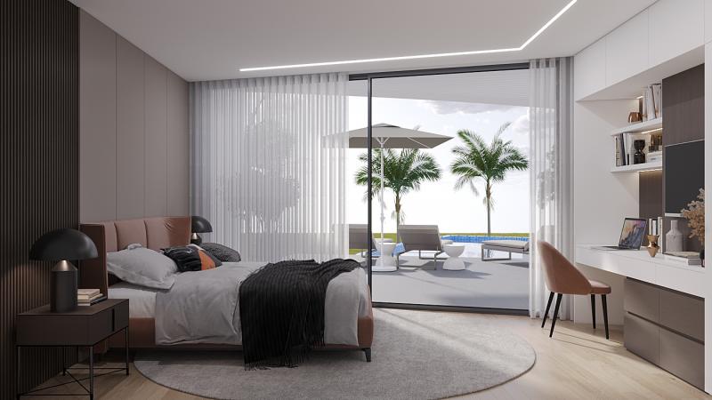 The villa boasts a spacious open-plan layout, seamlessly connecting the living room, dining area, and a fully equipped kitchen. It features three en-suite bedrooms, plus an office that can easily be transformed into a fourth bedroom.