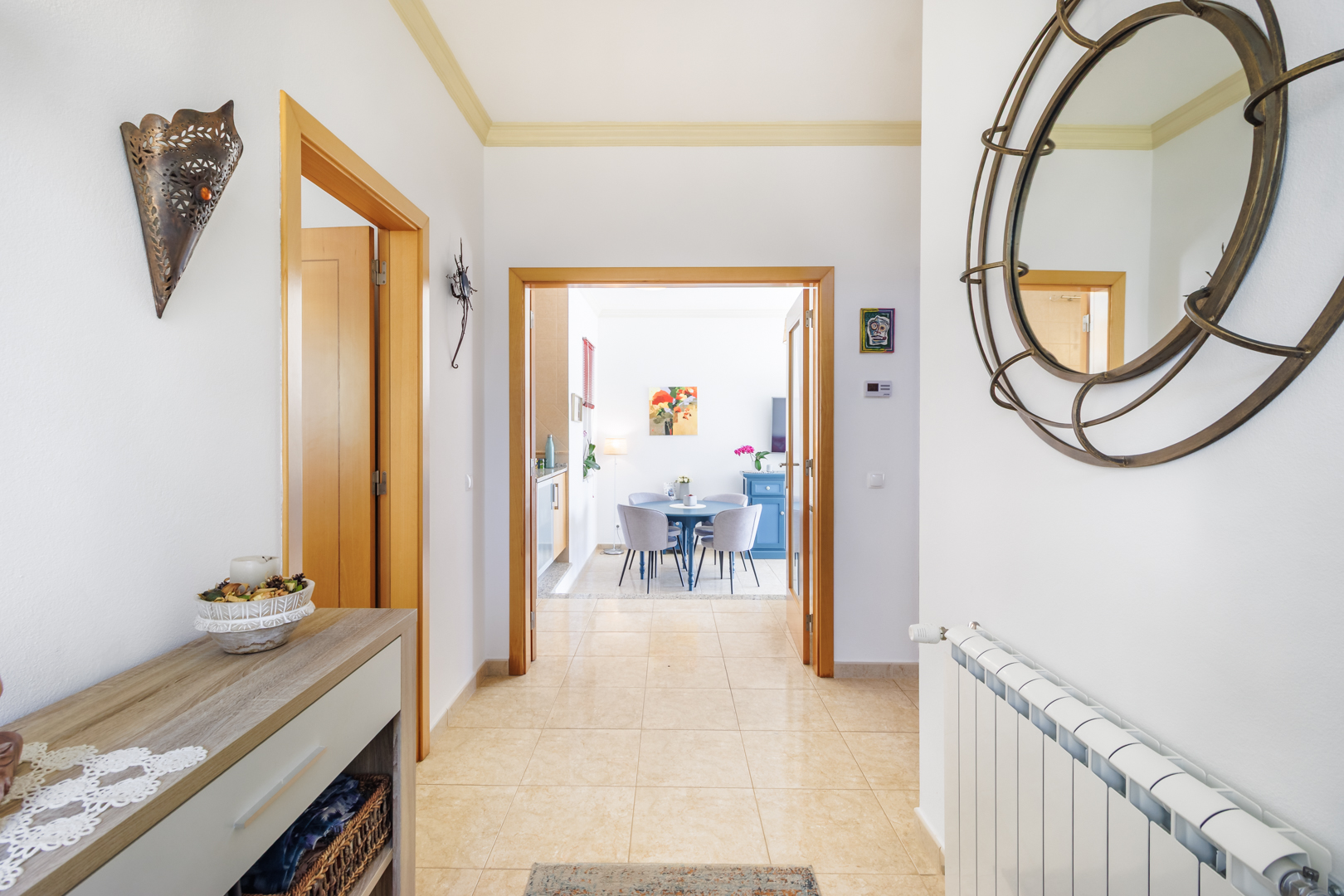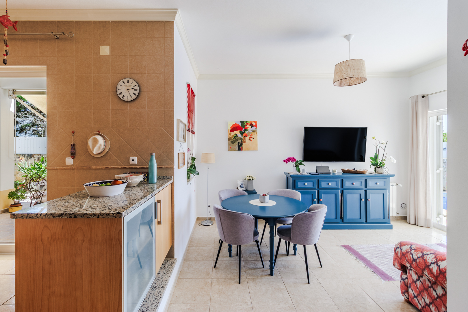 From the hallway, you also access the fully equipped kitchen, which is complemented by a generous dining area, both offering direct access to the outdoor poolside.