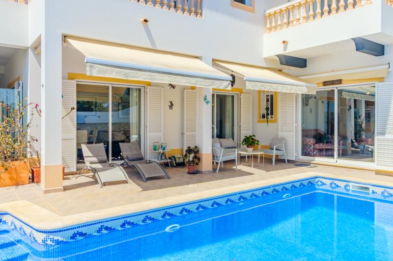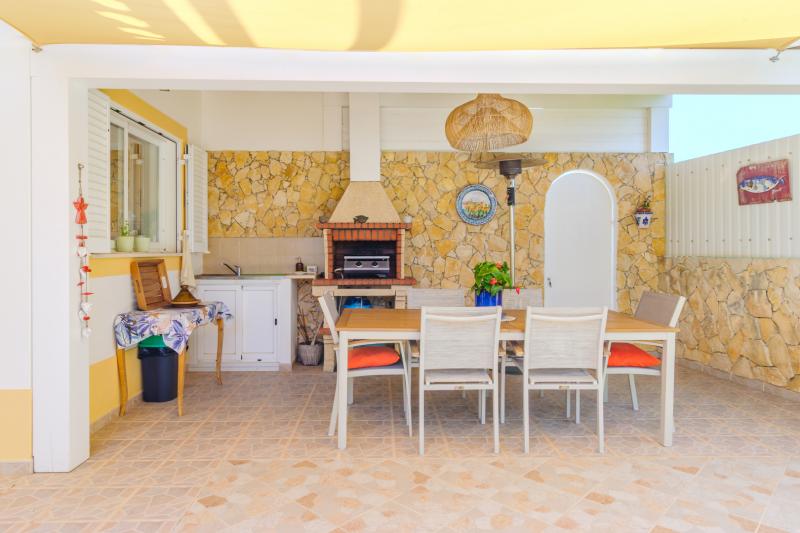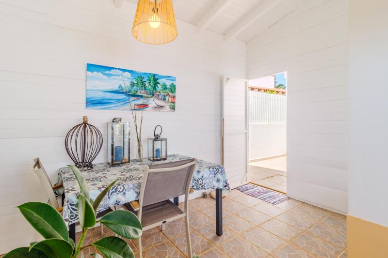 From the hallway, you also access the fully equipped kitchen, which is complemented by a generous dining area, both offering direct access to the outdoor poolside.
