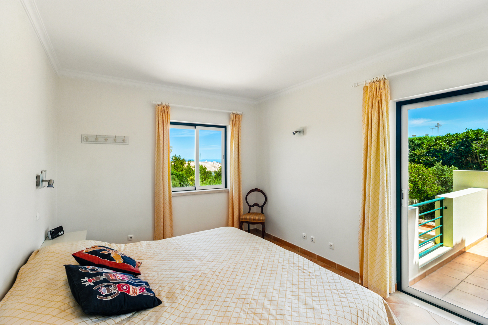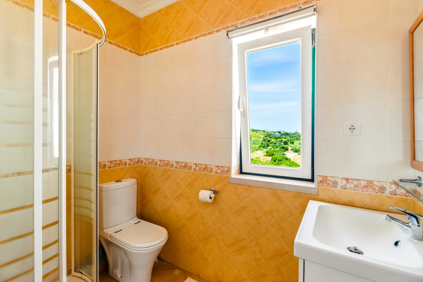 Spread across three floors, the villa features a spacious layout. The ground floor includes a welcoming entrance hall, a fully equipped kitchen with stunning countryside and Monchique mountain views, and an open-plan dining and living room with a wood-burning fireplace. These areas open onto a sunny pool terrace with multiple seating areas—perfect for relaxing or entertaining. This level also includes a guest toilet and the en-suite master bedroom.