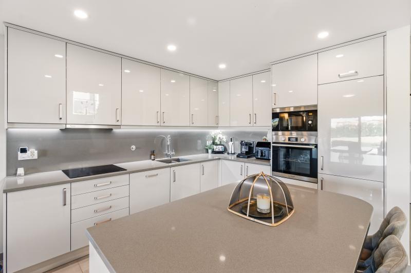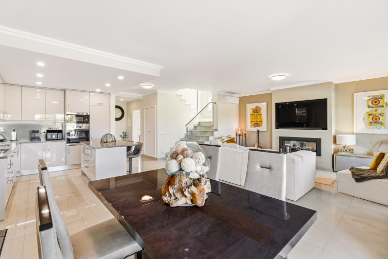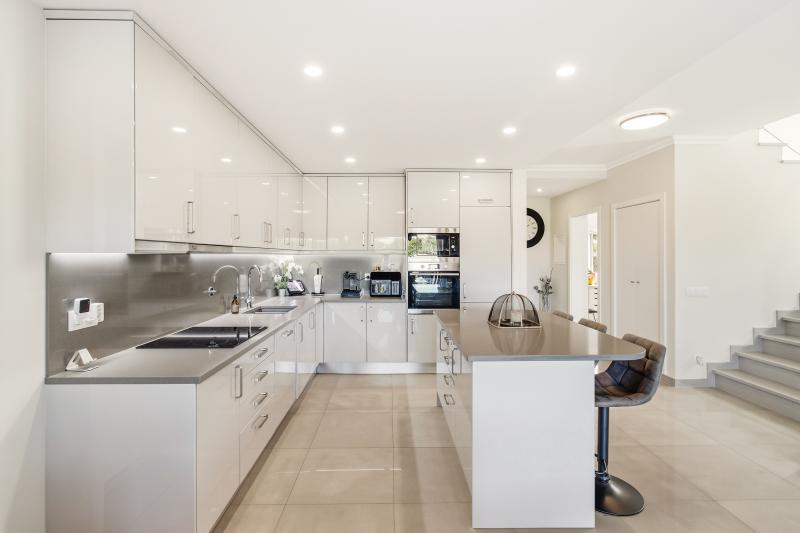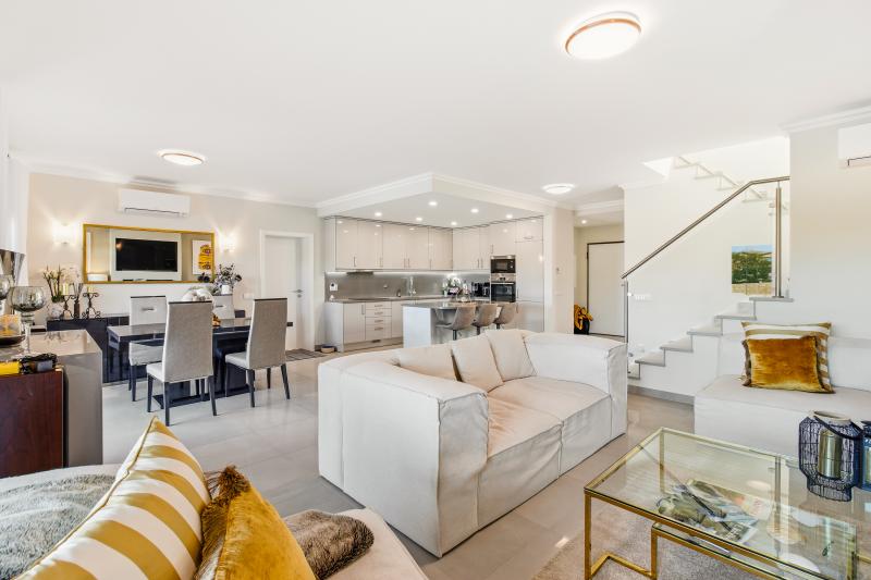 The villa’s design emphasizes light, space, and seamless indoor-outdoor living. On the ground floor, the open-plan kitchen, dining, and living areas flow effortlessly toward the west-facing heated swimming pool, creating a natural connection between the interior and the sun-drenched terraces. Practicality and convenience are integrated throughout the property. A winter terrace can be enclosed with glass to create an additional living area. The kitchen features a central island, fully equipped appliances, and a design that encourages both everyday family life and entertaining.