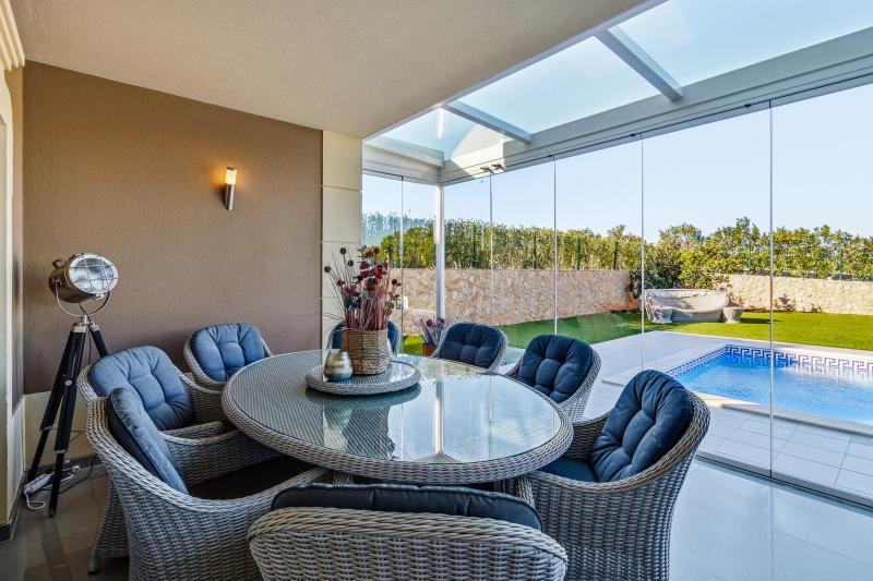The villa is equipped with air conditioning, underfloor heating, and boasts a high energy efficiency rating, ensuring comfort and sustainability throughout the year.