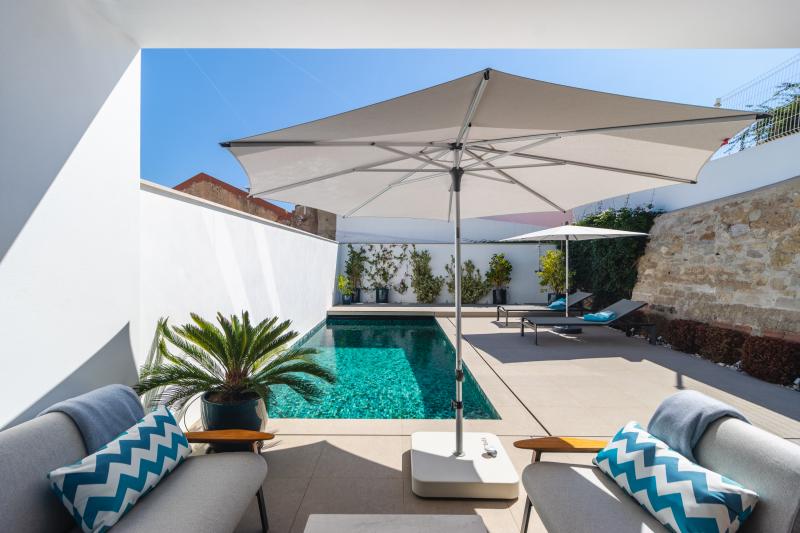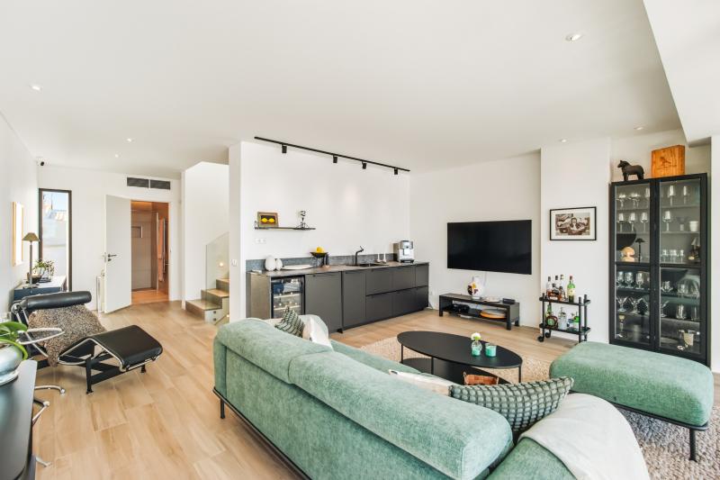 Tucked away behind a charming courtyard, this hidden gem reveals itself as soon as you step inside. The entrance opens into a spacious open-plan kitchen and dining area, designed with floor-to-ceiling windows that flood the room with natural light and connect seamlessly to the outdoor terrace. Here you’ll find a private swimming pool and sunbathing area, a perfect oasis right in the city. Every detail has been thoughtfully considered – from the top-quality appliances to the original stonework that hints at the home’s past life as a ruin.