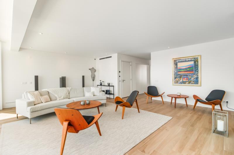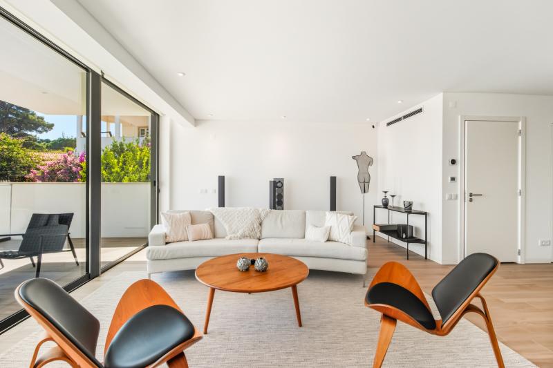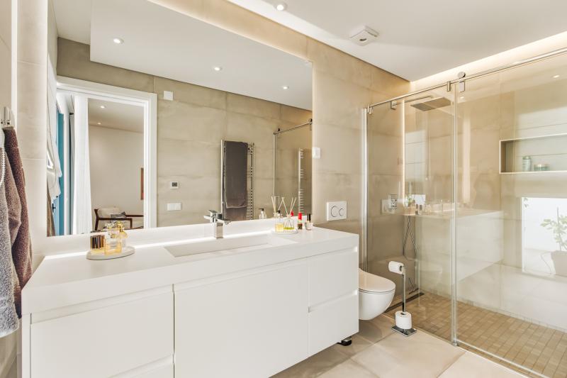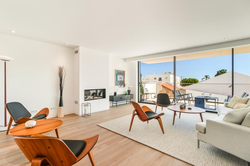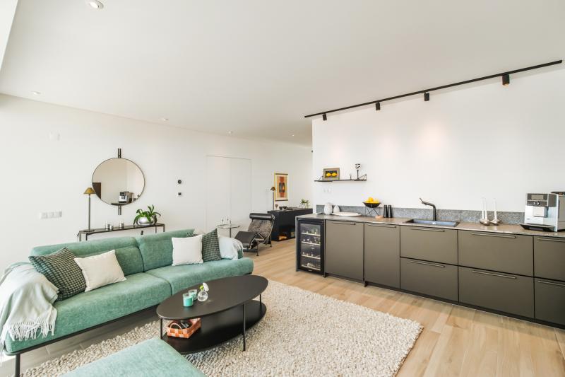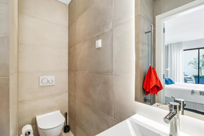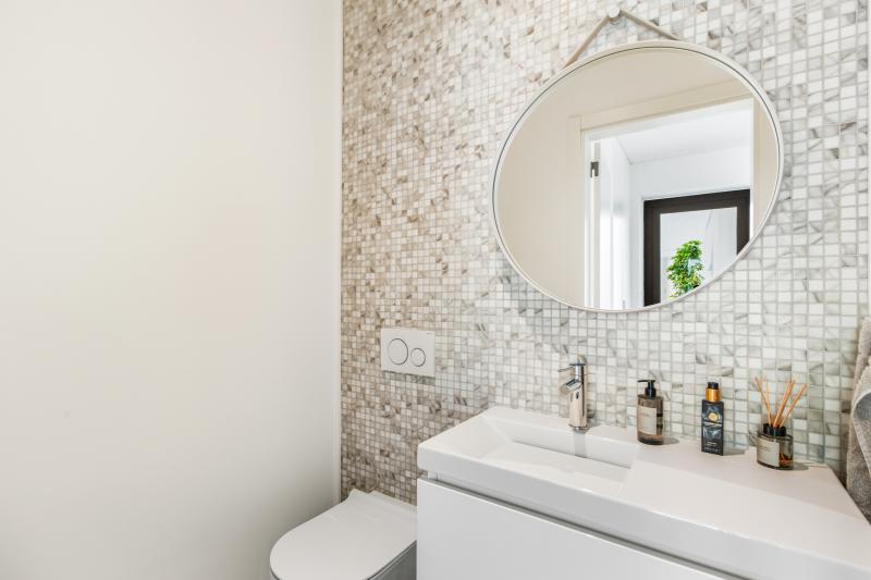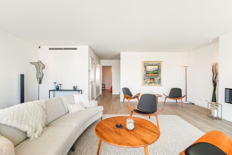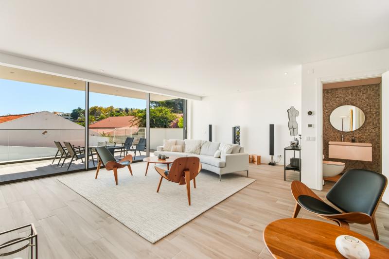 On this same floor is a beautifully appointed bedroom with en-suite bathroom, along with a guest toilet. A striking open staircase then leads you to the first floor, home to the main living room with direct access to a large balcony overlooking the sea. The living room also hosts a gas fireplace, perfect for those winter evenings. The master suite is also on this level, complete with walk-in wardrobe, luxurious en-suite bathroom, and its own balcony with lovely views over the city.
