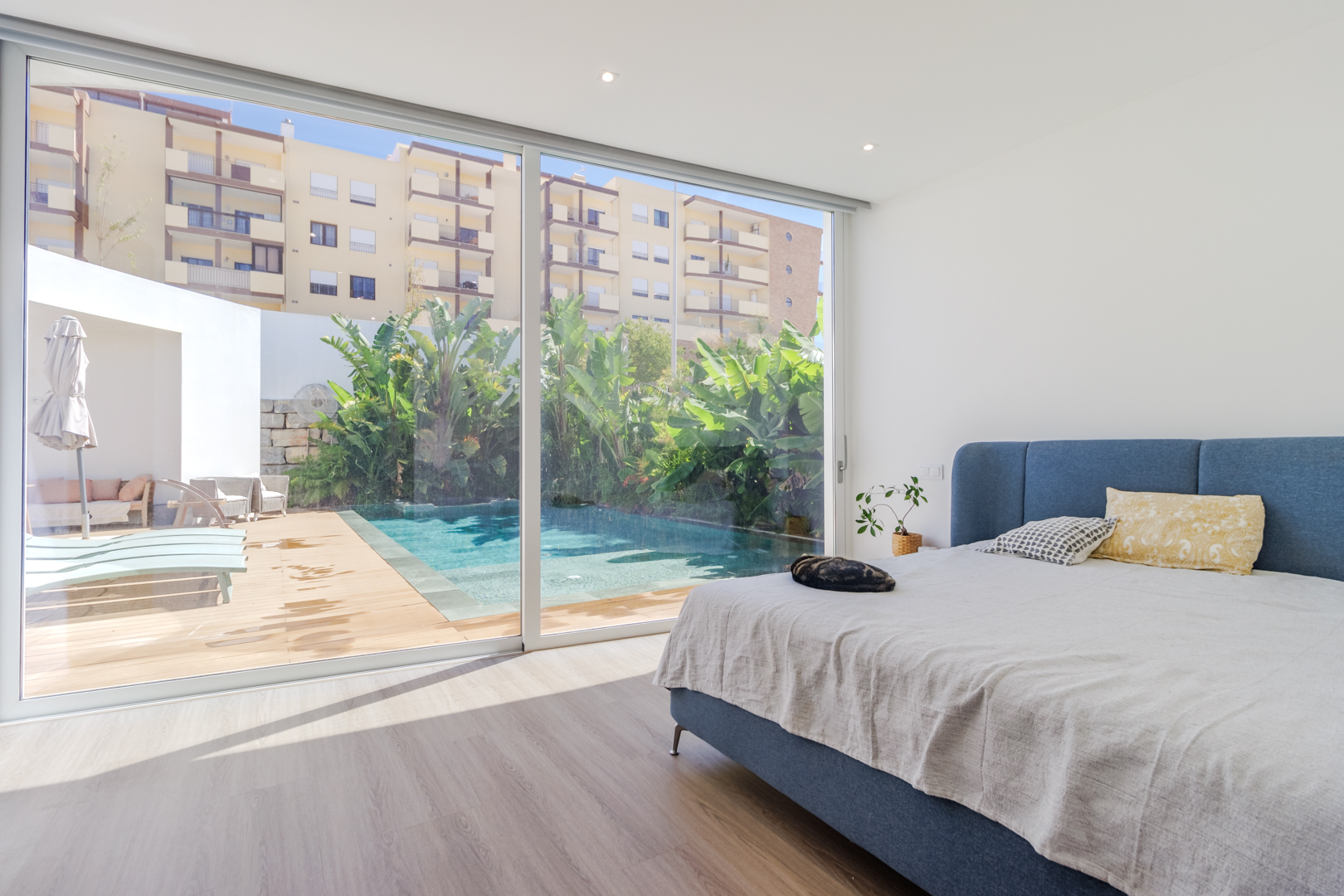 Ascending to the first floor, the villa’s main living space unfolds, showcasing an open-plan, fully equipped kitchen, dining area, and living room that seamlessly transitions to a tropical-inspired outdoor space. This area epitomizes the essence of indoor-outdoor living. The first floor also houses the luxurious master suite, complete with a large bathroom featuring a walk-in shower. Additionally, there are two generous bedrooms that share a spacious family bathroom, also equipped with a walk-in shower.