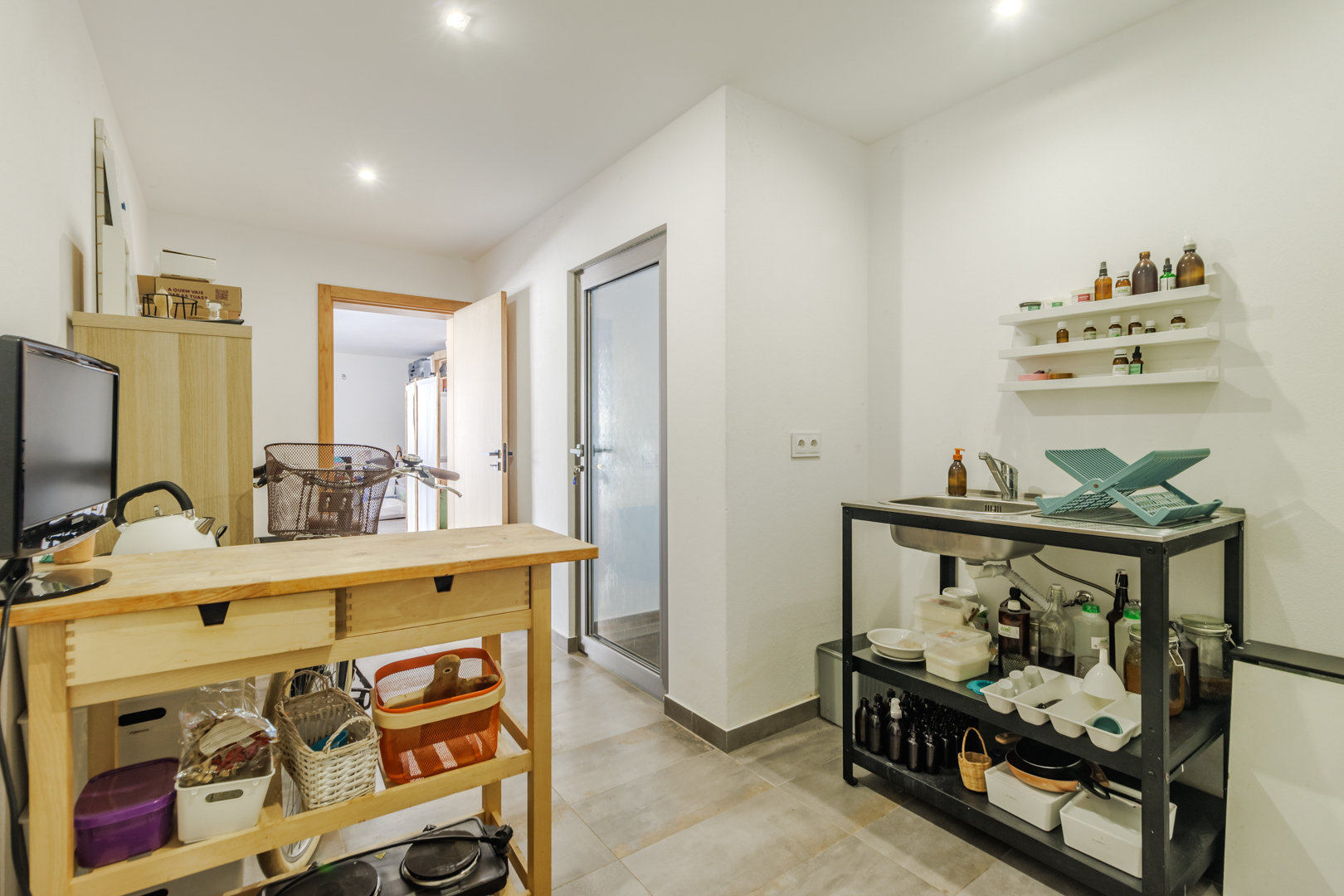 Through the electric gates, you arrive at the villa’s ground floor, greeted by an inviting entrance hall with stairs leading up to the main living area. This level features a spacious bedroom with an en-suite bathroom, a versatile studio space perfect for a workout area or home gym, an additional bathroom, and ample storage. Towards the back of this floor, you’ll find a double garage with a dedicated storage room and a laundry area.