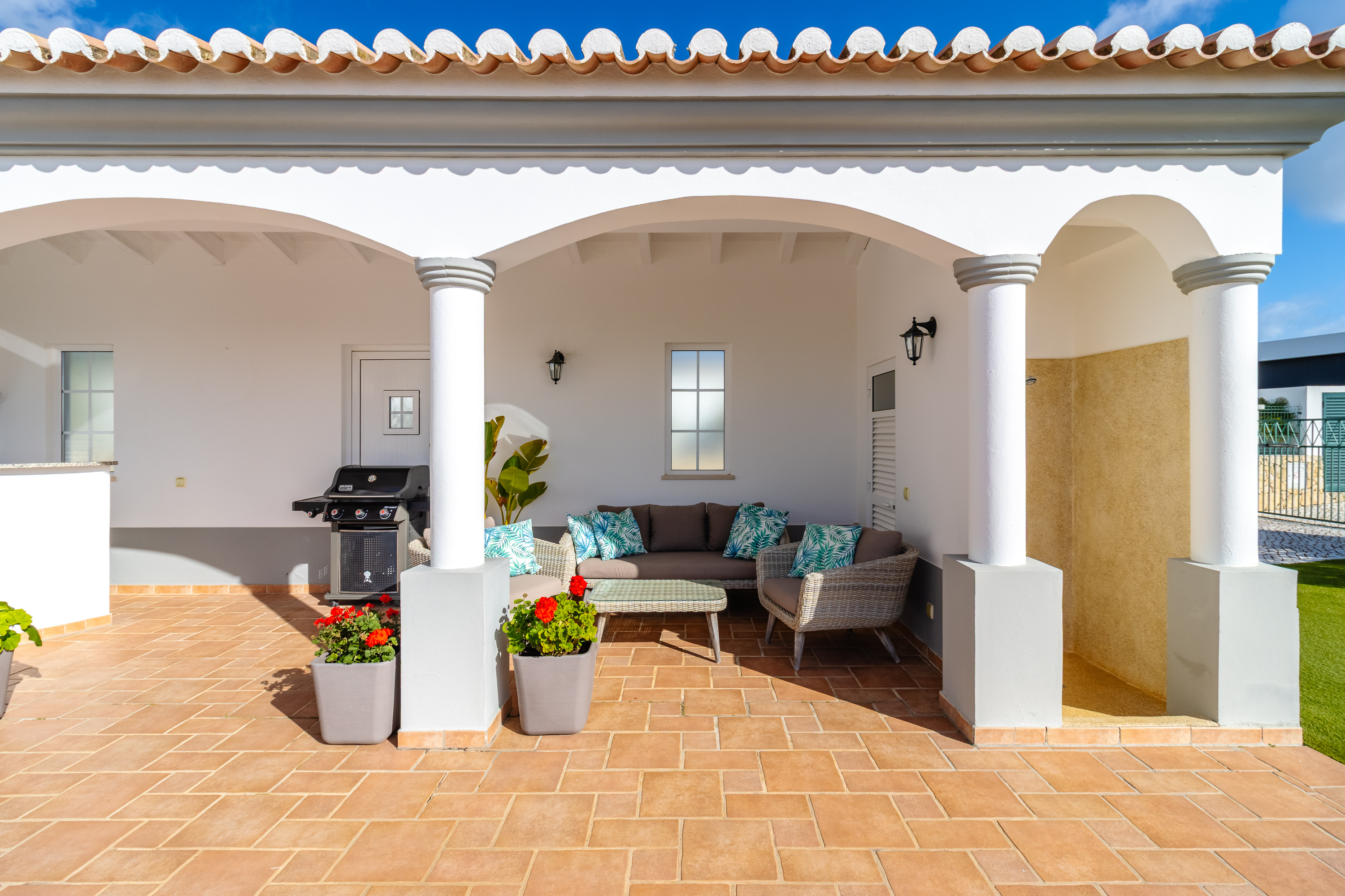Outside, the property continues to impress. A covered terrace area features a built-in BBQ and outdoor kitchen, perfect for alfresco dining and entertaining. The heated swimming pool invites you to enjoy long sunny days, while the outdoor shower and toilet adds convenience. The garden is both attractive and easy to maintain, with charming olive trees and thoughtfully landscaped areas complemented by artificial grass, providing year-round greenery without the upkeep.