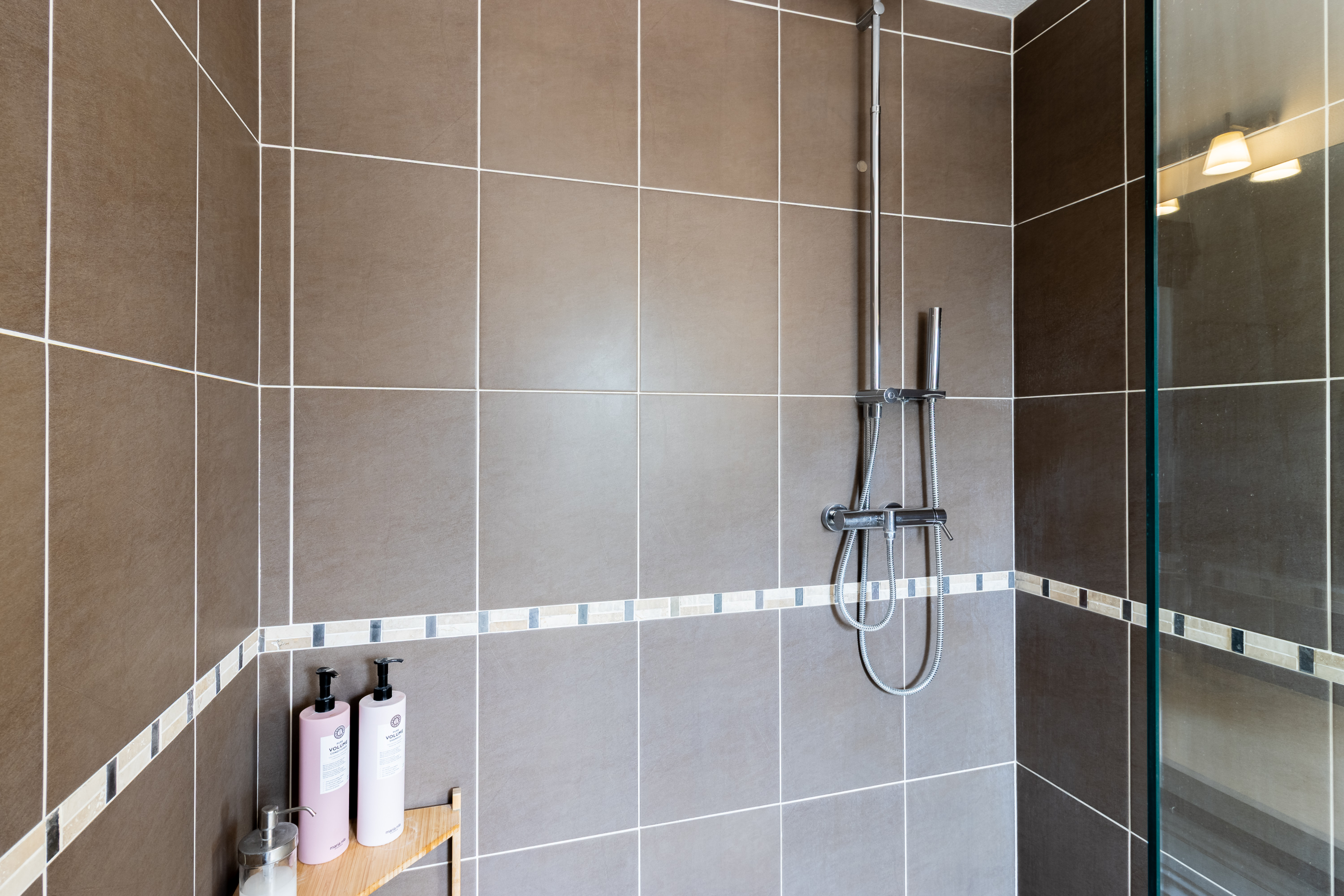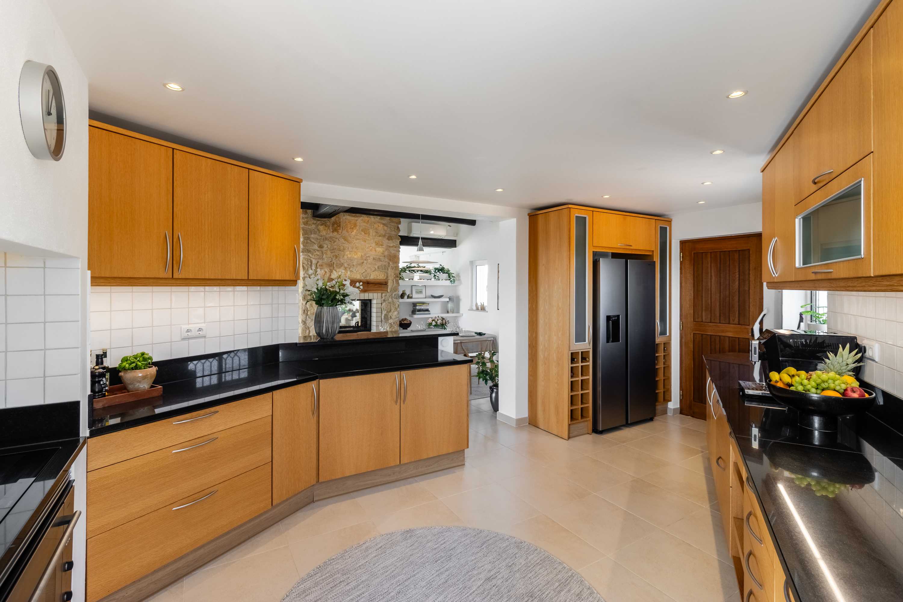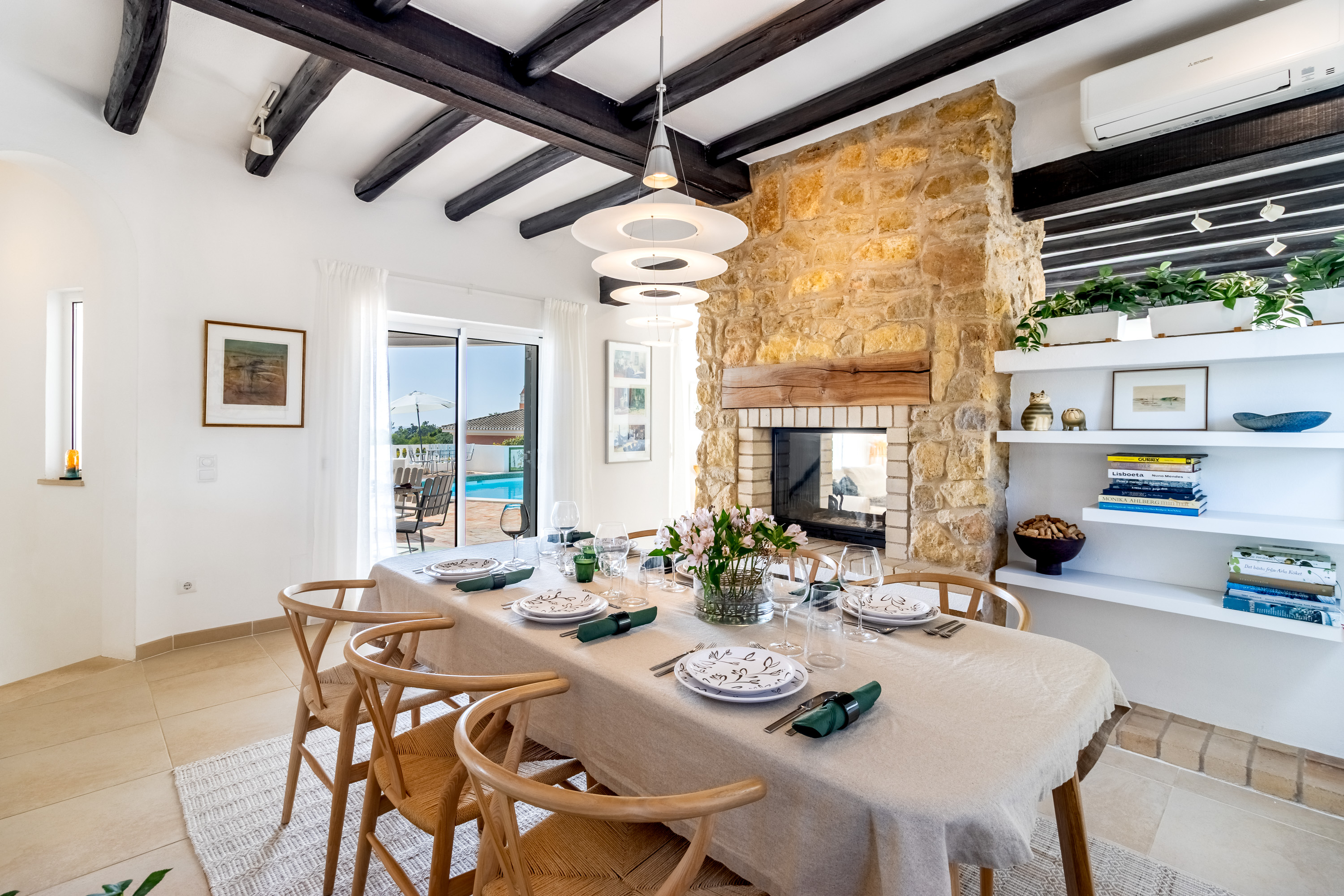 Upon entering the upper level, the living areas immediately impress with their brightness and proportions. The lounge and dining area are subtly divided by an elegant stone feature wall with a double-sided fireplace, adding warmth and character to both spaces. Exposed wooden beams enhance the architectural charm and create a warm, refined atmosphere.