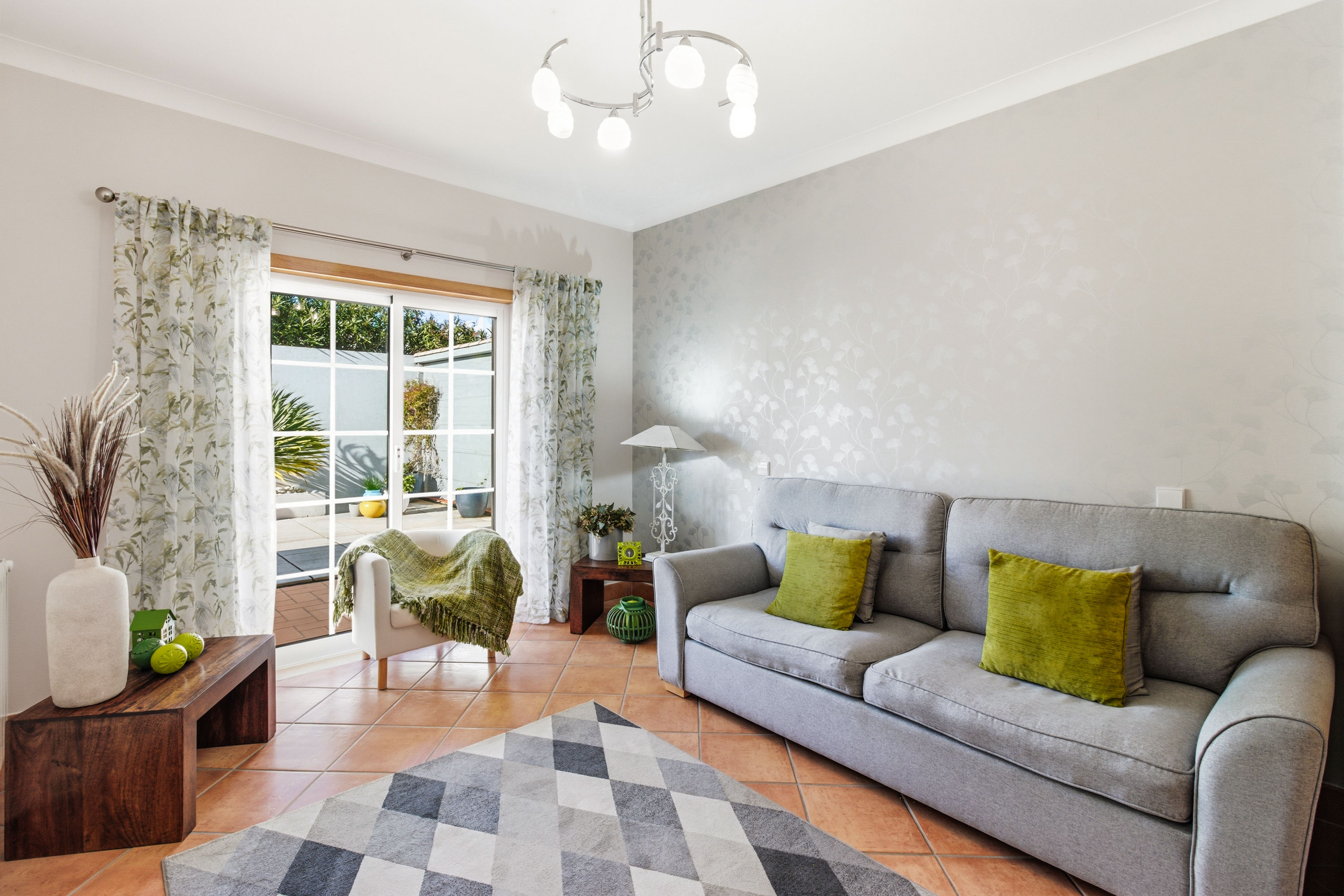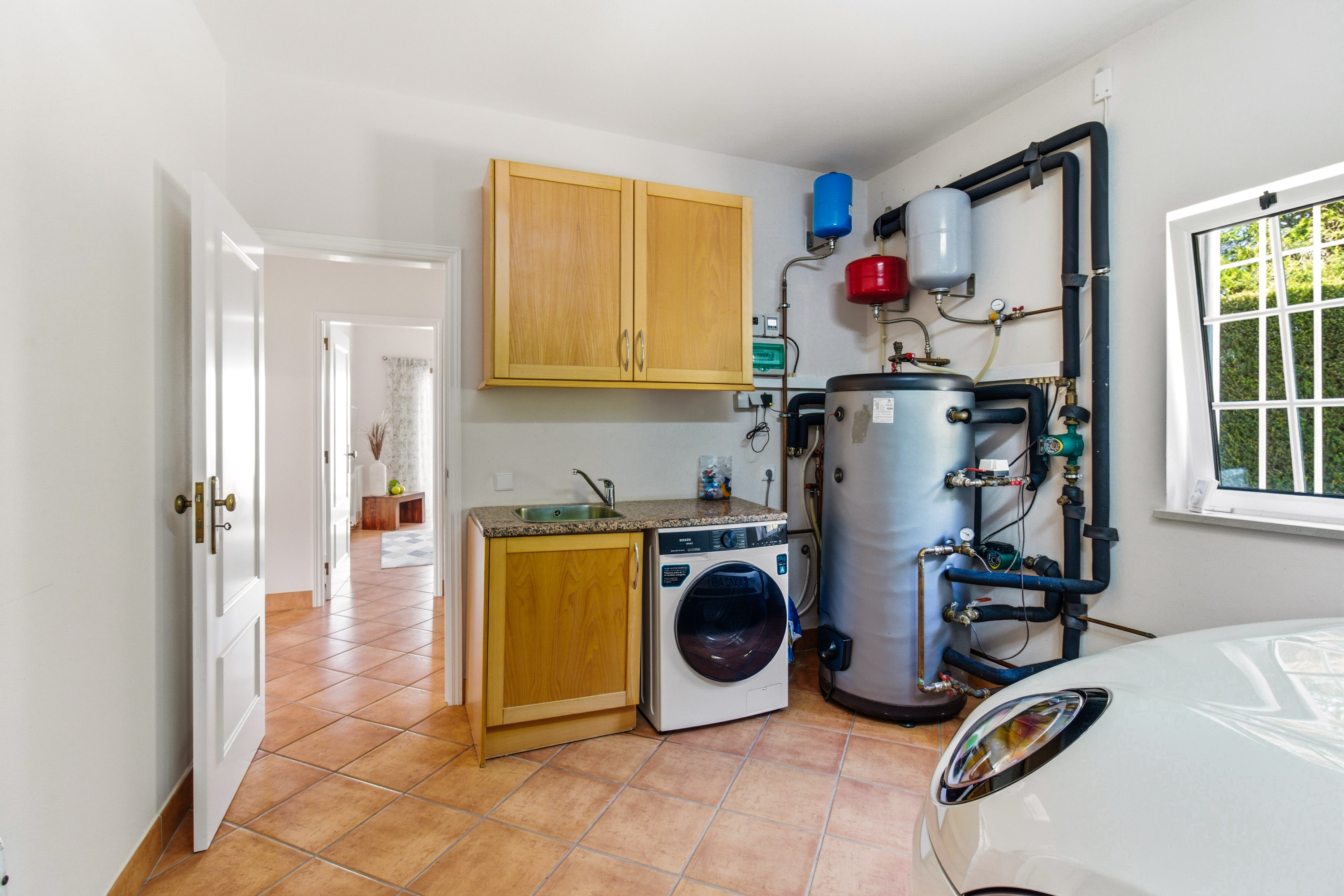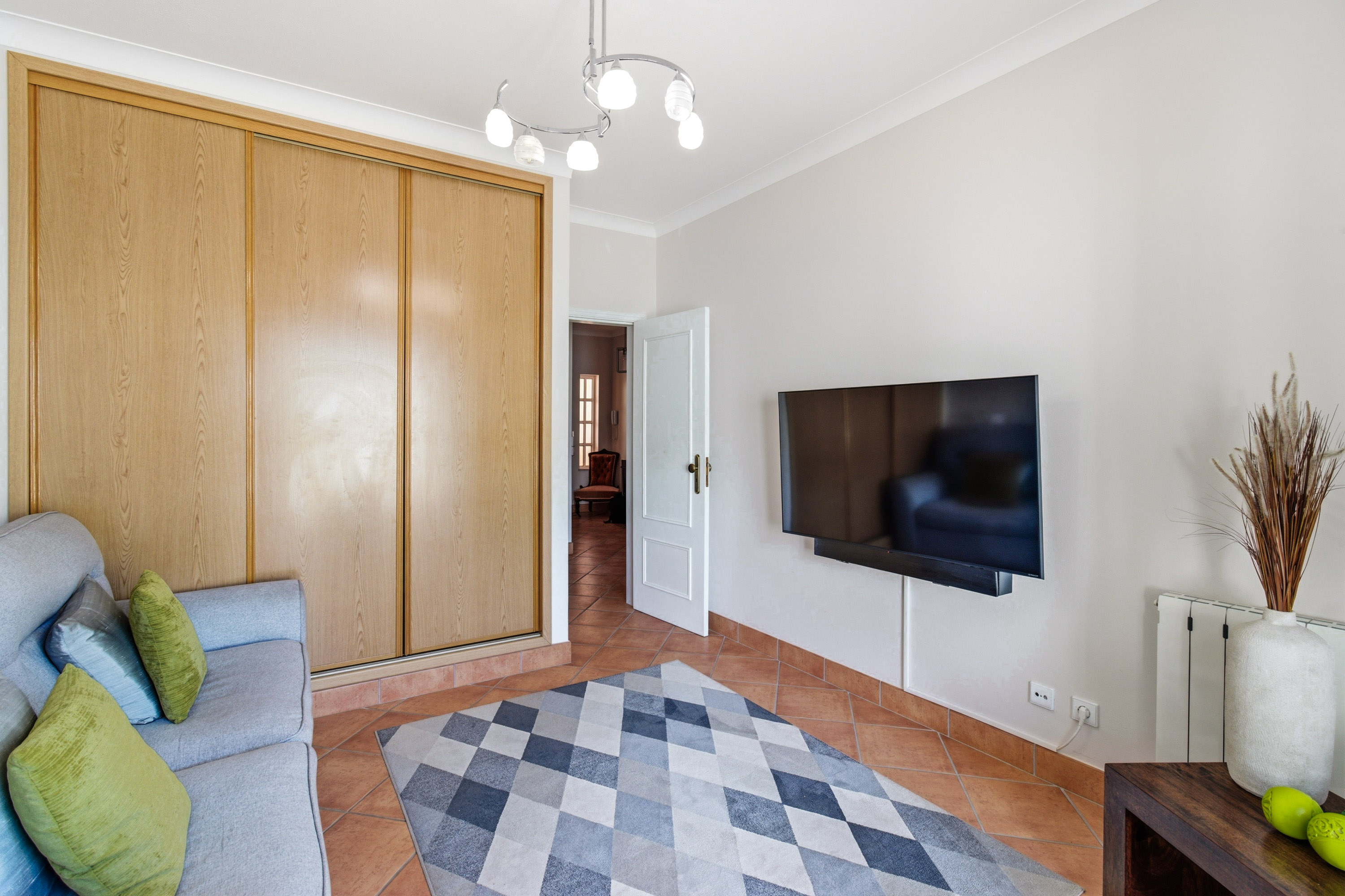 From here, there is direct access to the front garden, beautifully finished with traditional Portuguese calçada stone.