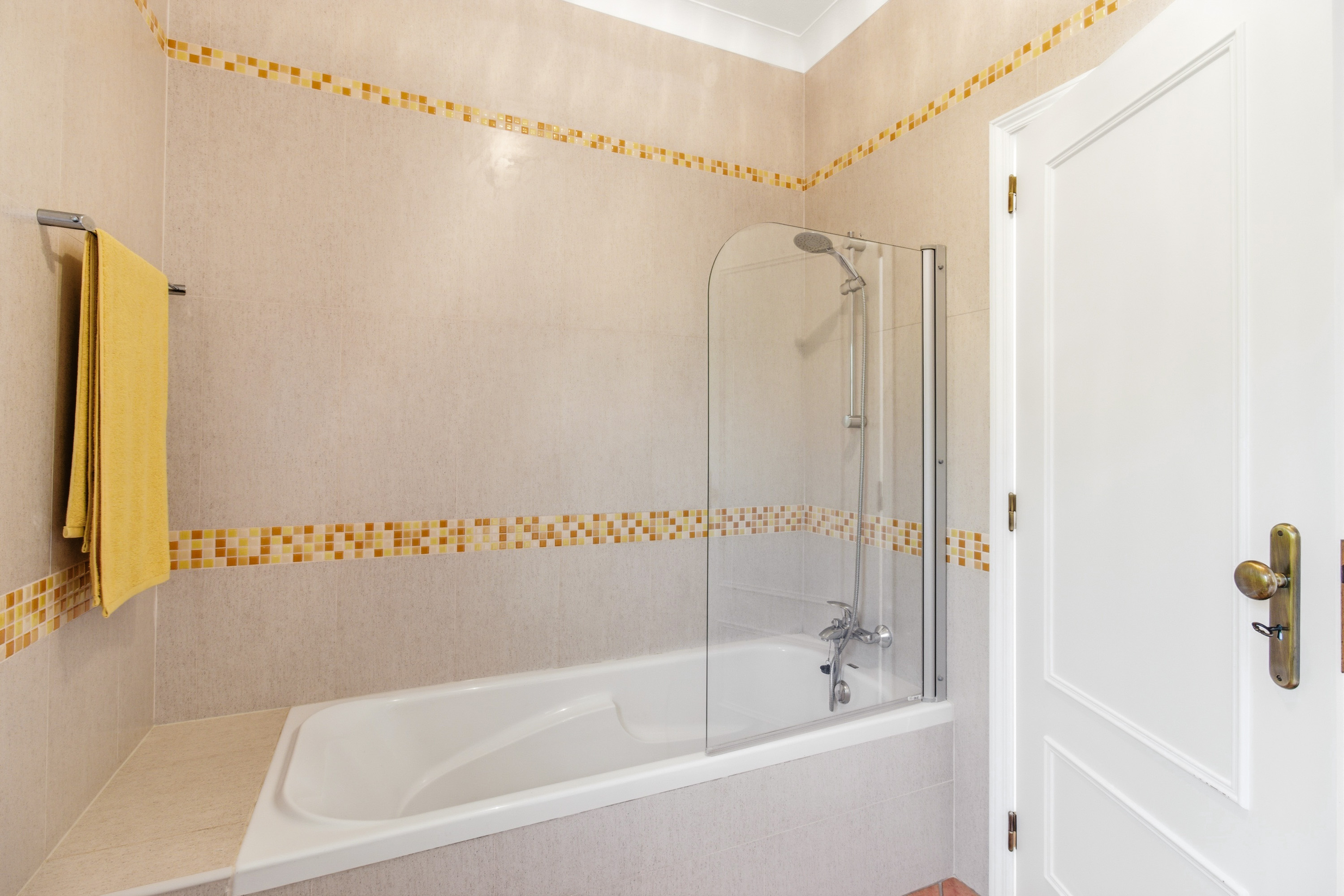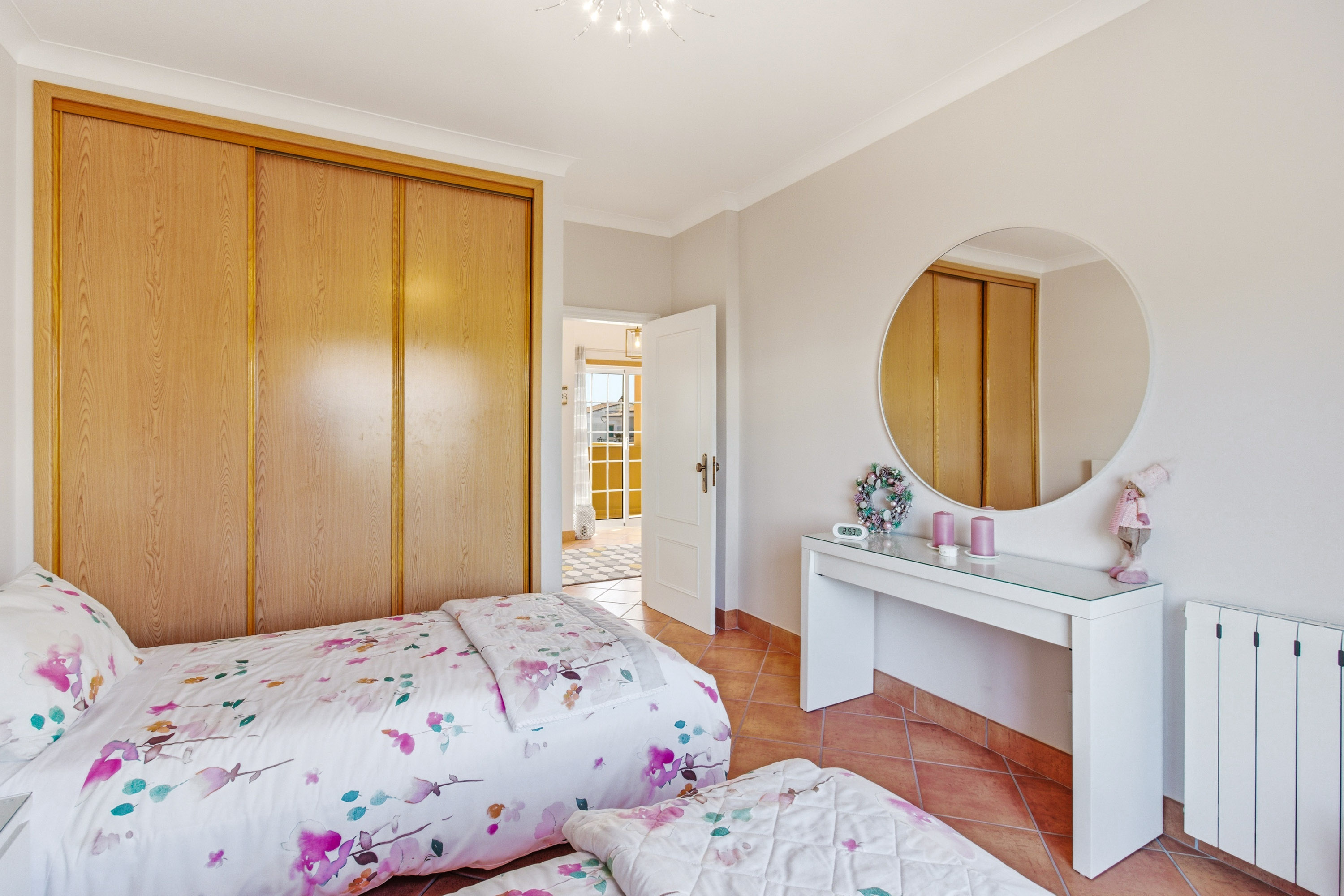 Two further bedrooms share a family bathroom equipped with a bathtub. All bedrooms are fitted with built-in wardrobes, air conditioning, double-glazed windows and electric shutters, ensuring comfort and energy efficiency.