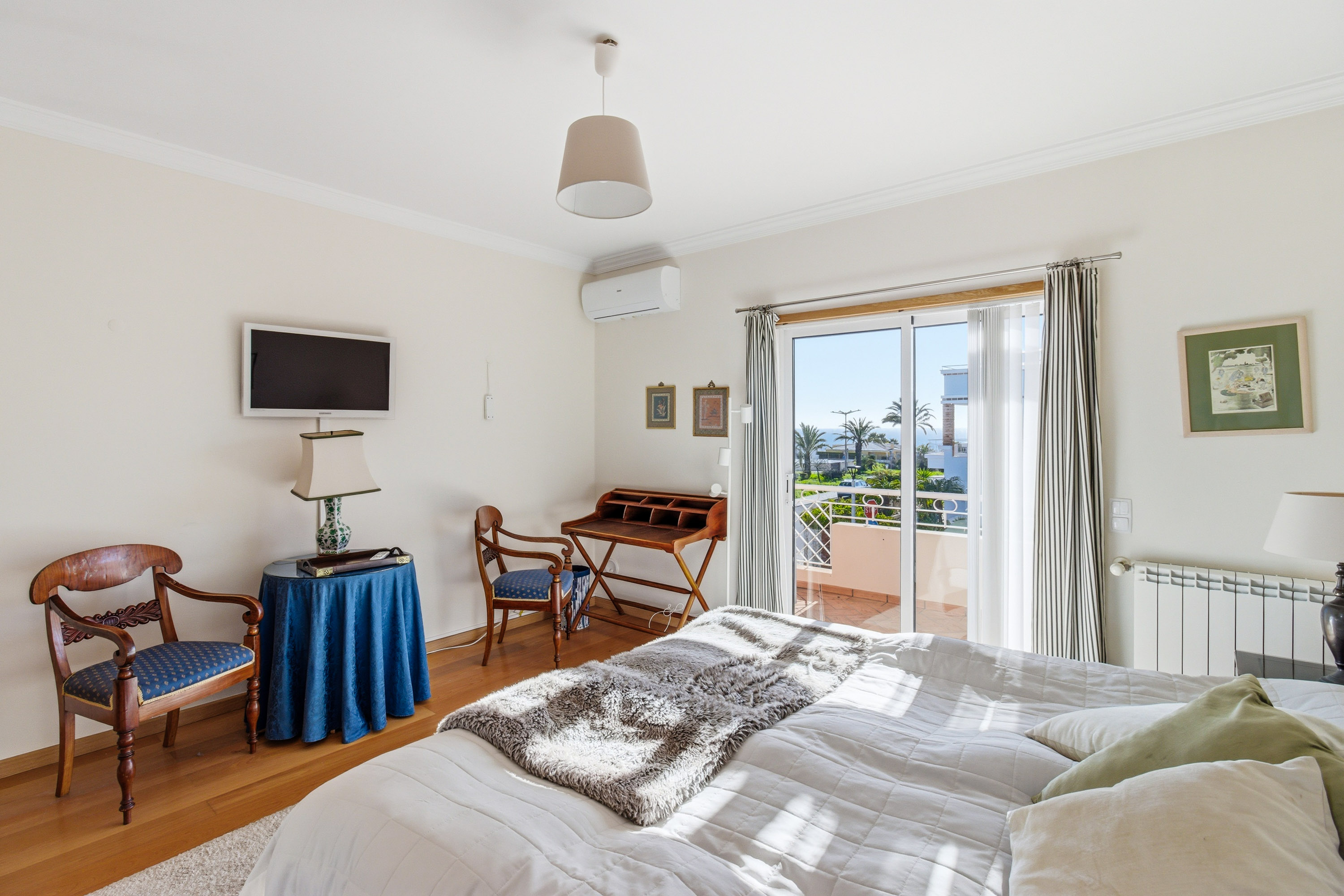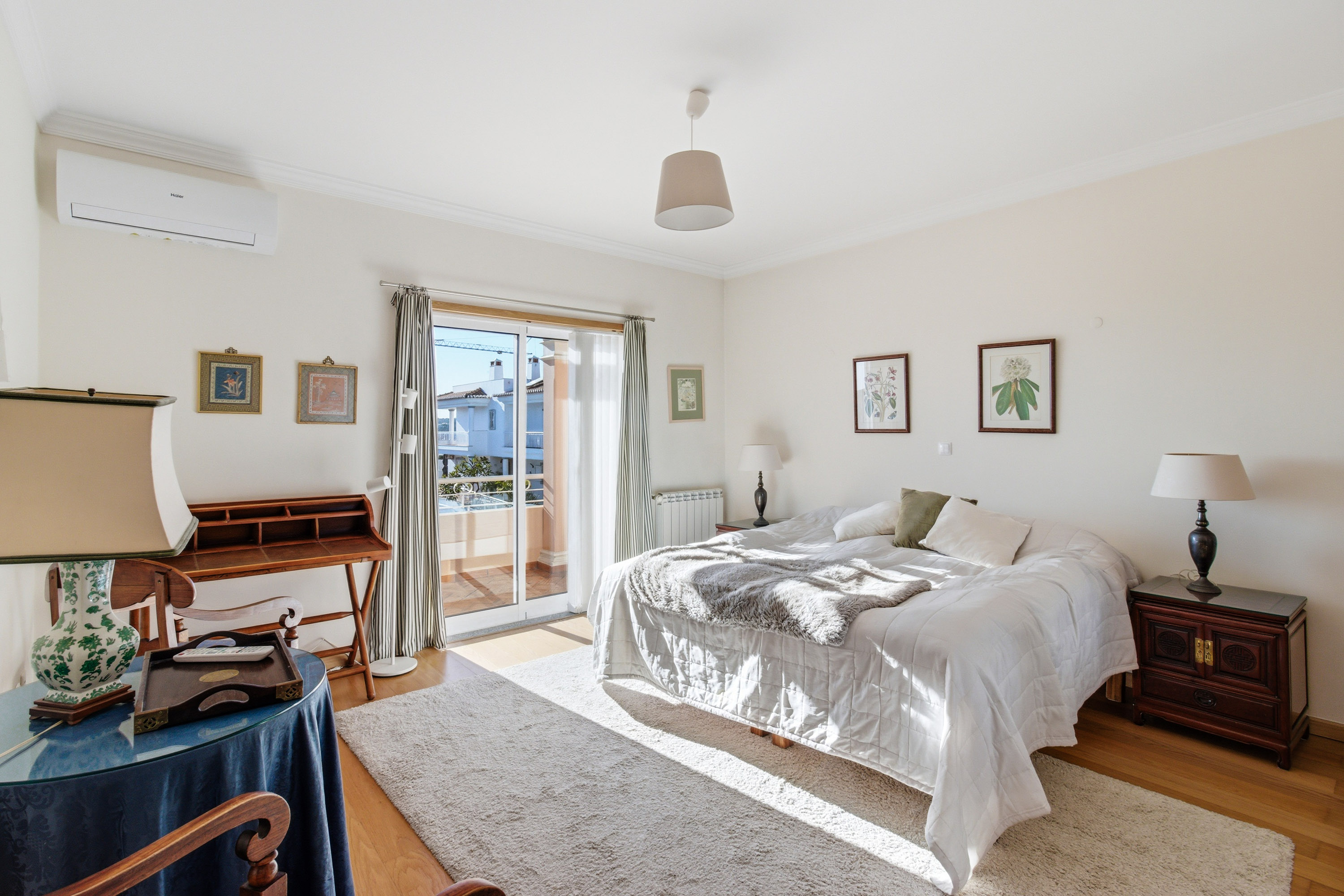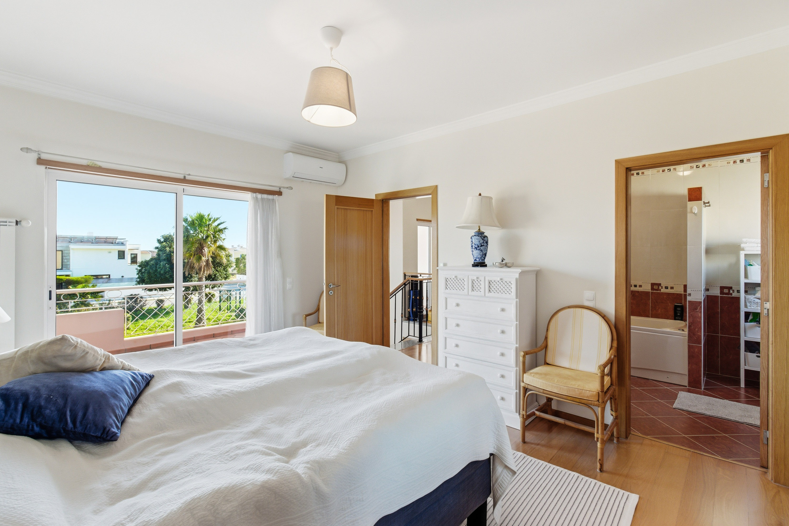 Upstairs, three double bedrooms provide peaceful retreats. All feature fitted wardrobes, air conditioning, and access to private balconies. The master bedroom includes an en-suite bathroom with a jacuzzi bath and a pleasant east-facing balcony, while the other bedrooms share a family bathroom and benefit from a west-facing balcony overlooking the garden.