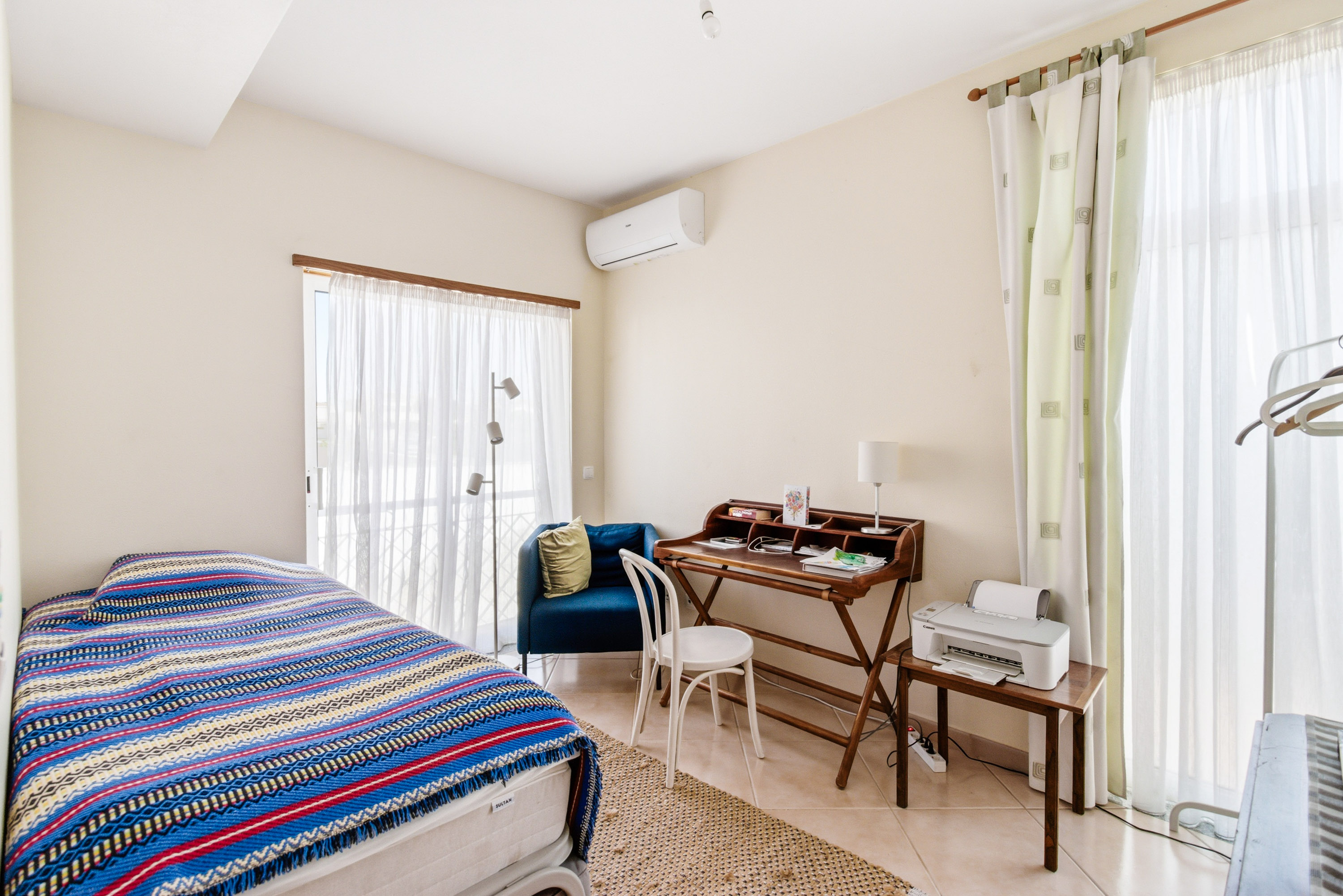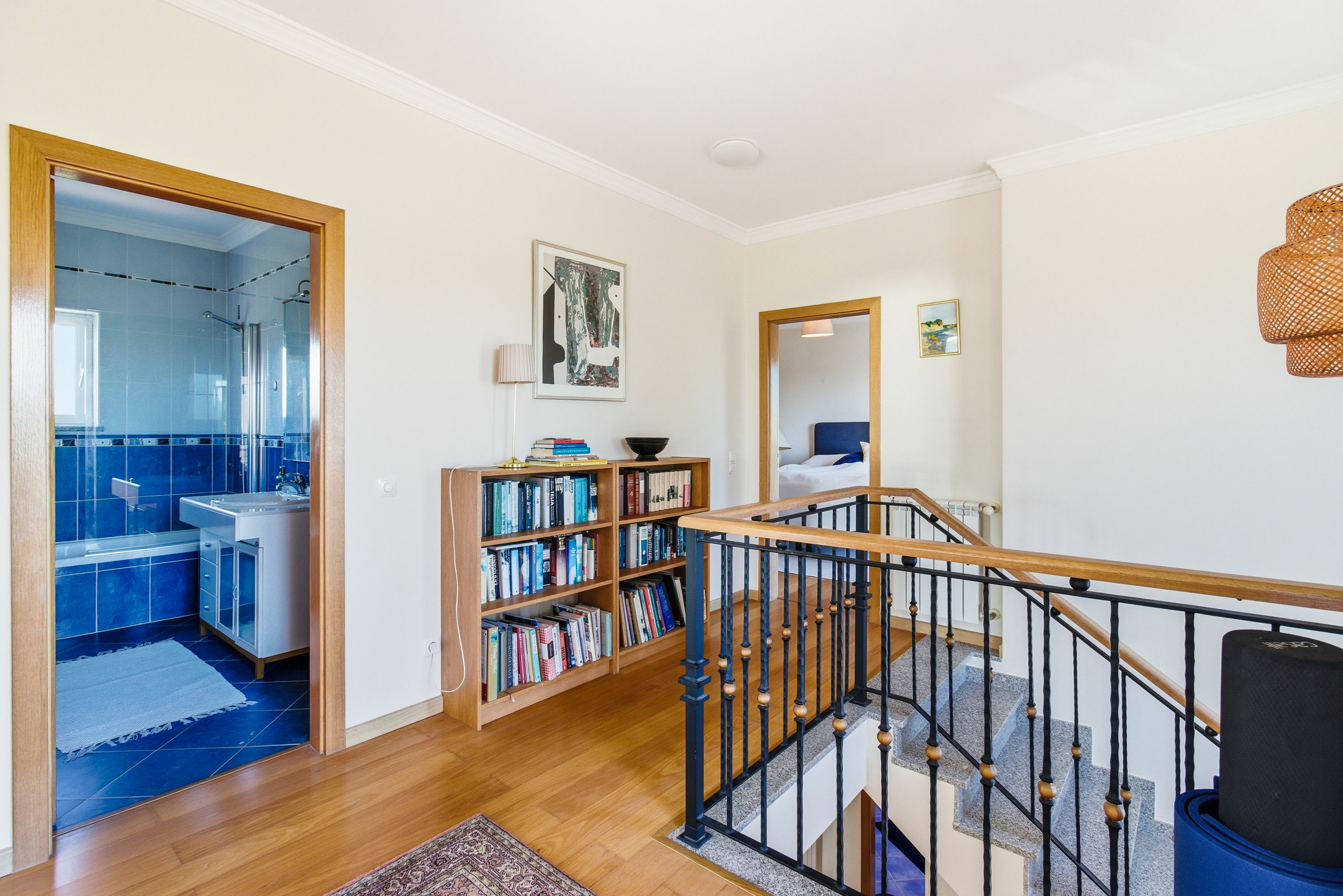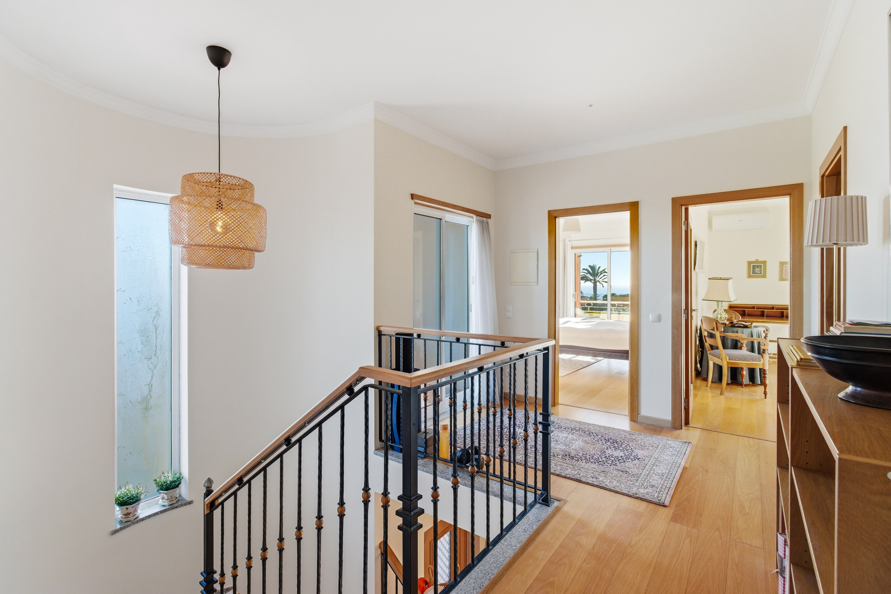 Upstairs, three double bedrooms provide peaceful retreats. All feature fitted wardrobes, air conditioning, and access to private balconies. The master bedroom includes an en-suite bathroom with a jacuzzi bath and a pleasant east-facing balcony, while the other bedrooms share a family bathroom and benefit from a west-facing balcony overlooking the garden.