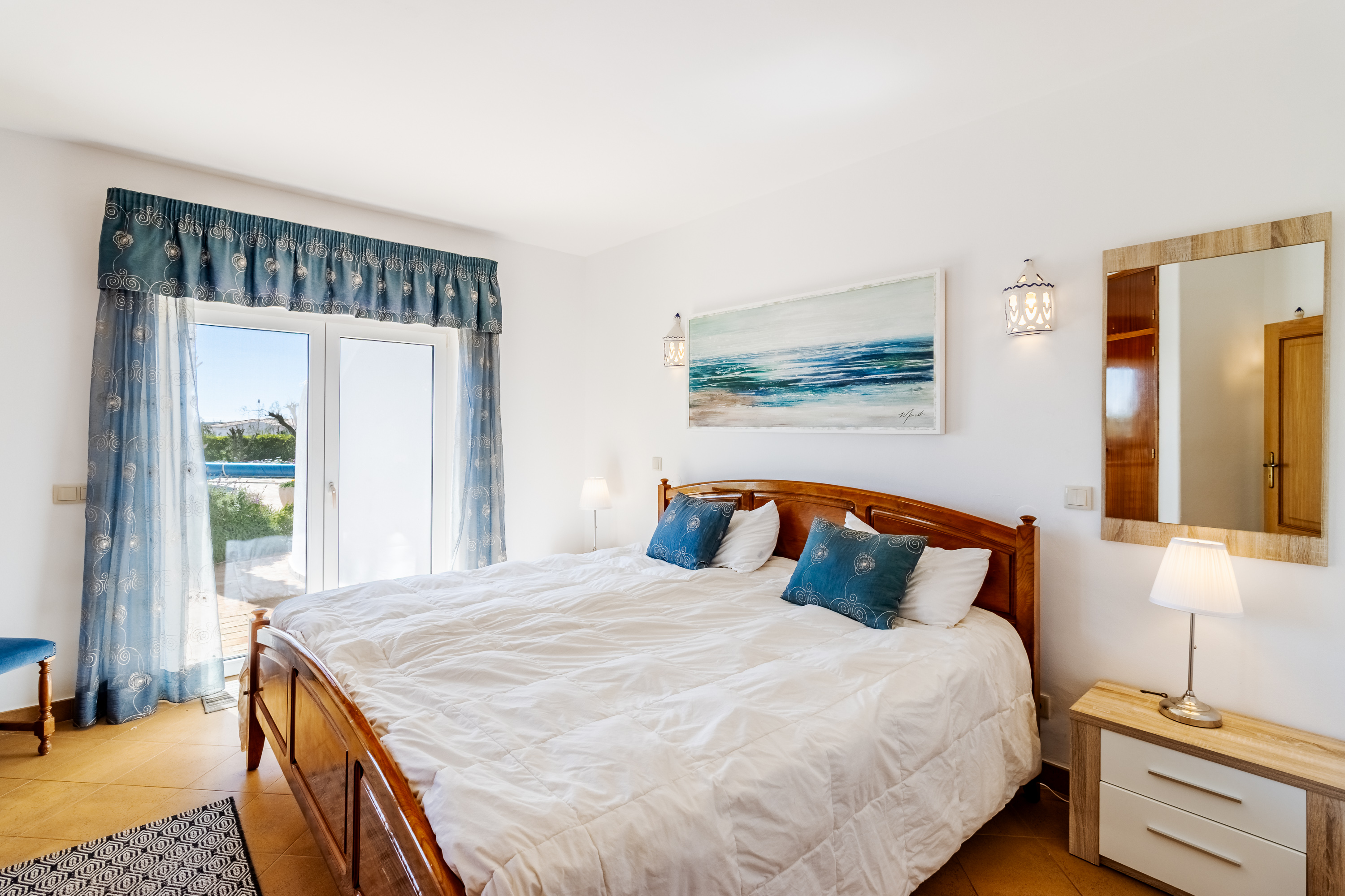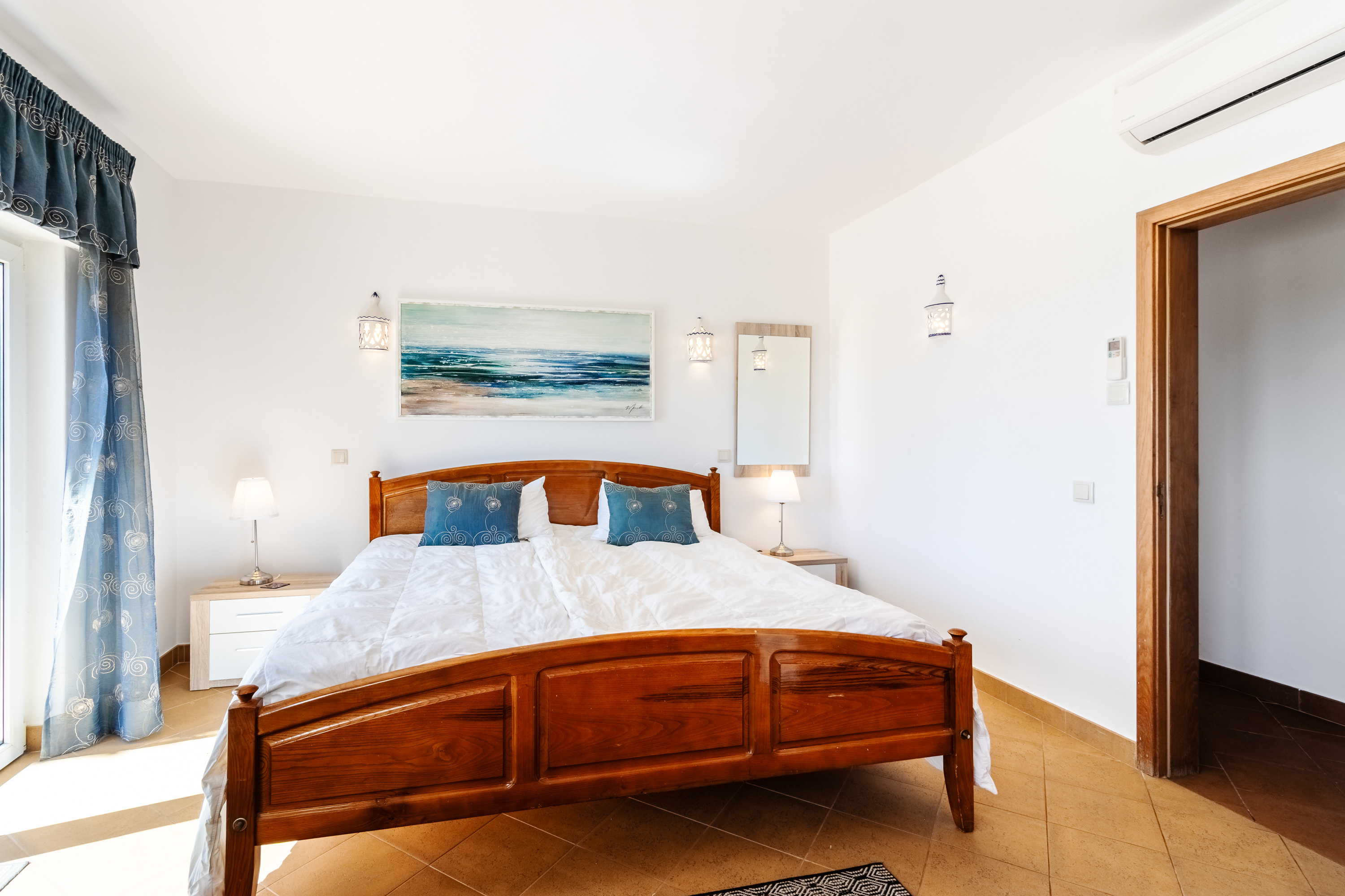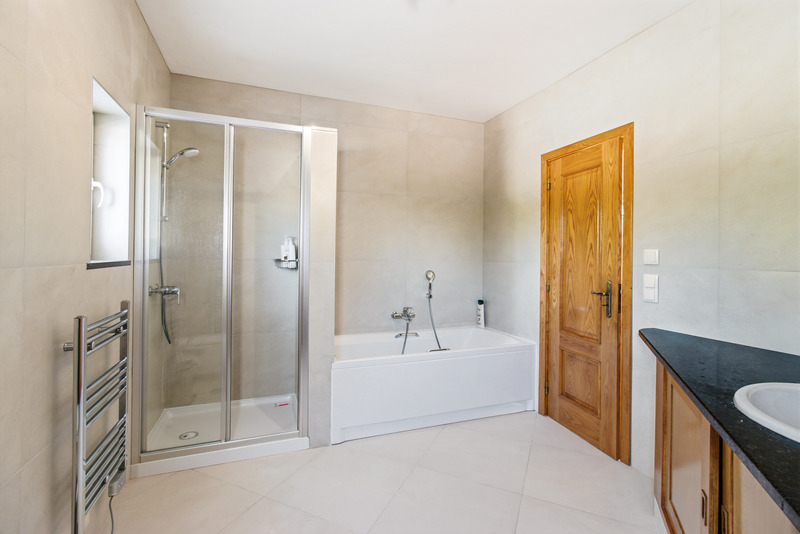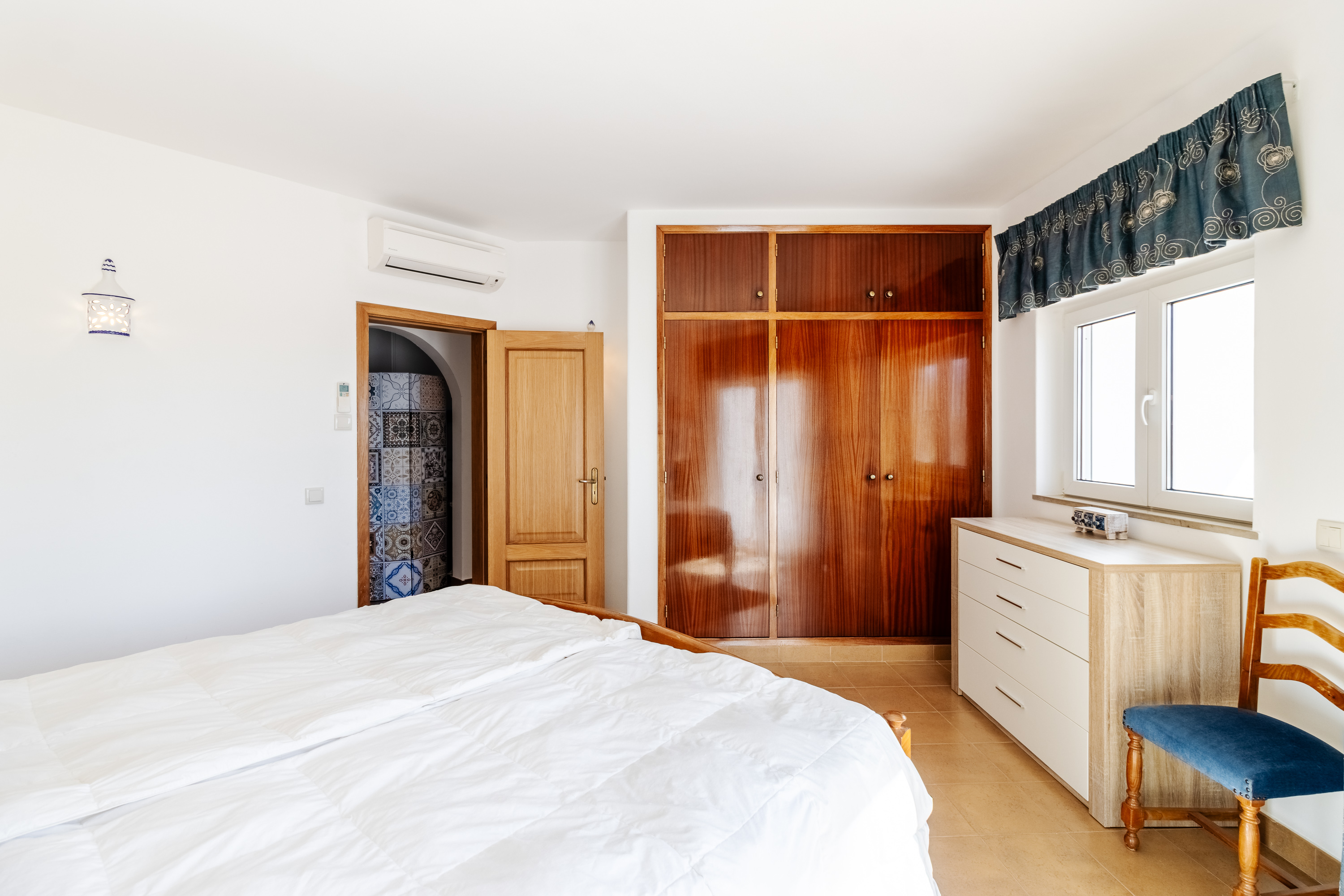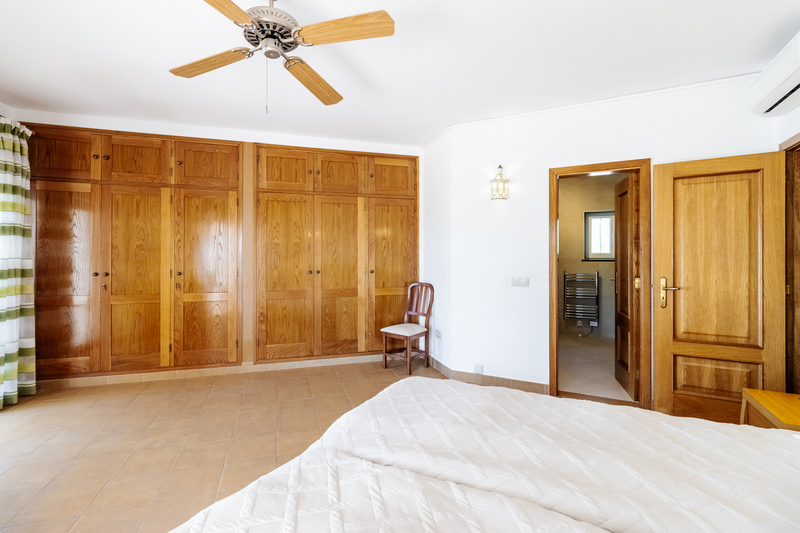 On the lower floor, the villa has three well-proportioned bedrooms. The master suite is a private retreat, featuring fitted wardrobes, air conditioning, and ceiling fans for year-round comfort. Its en-suite bathroom has been beautifully renovated, offering a luxurious combination of double sinks, a bath, and a separate shower. The master bedroom also benefits from its own covered terrace, creating a calm and secluded space to relax. The two additional bedrooms are equally inviting and share a stylishly updated family bathroom.