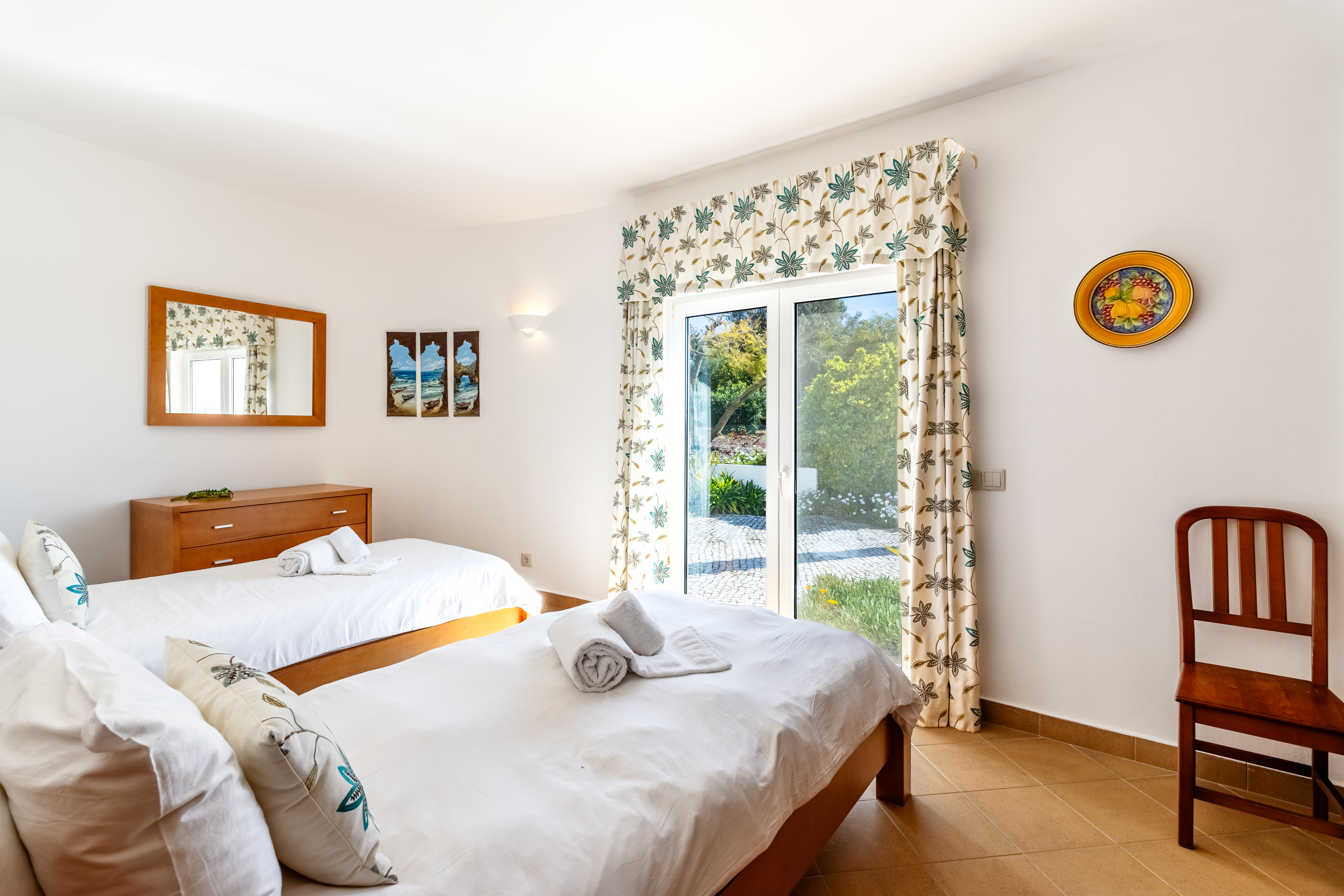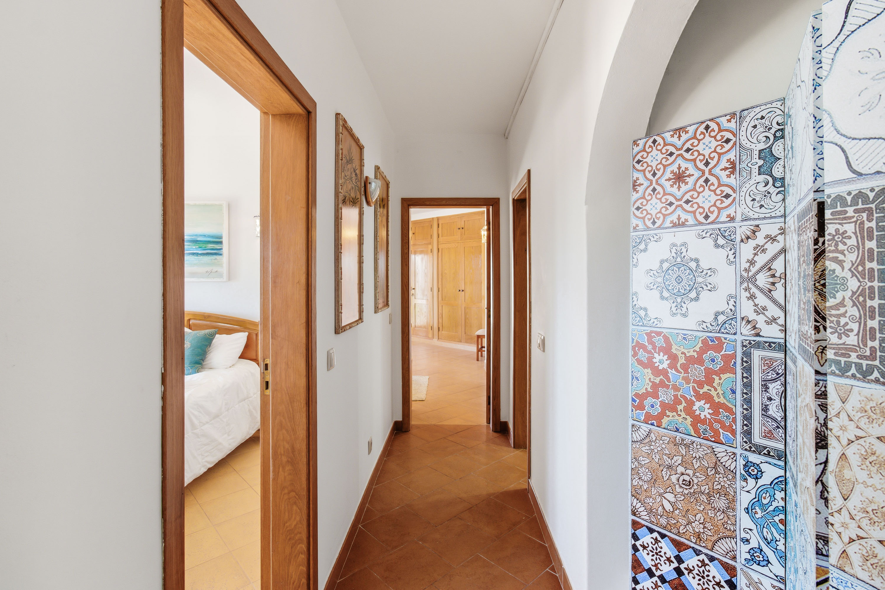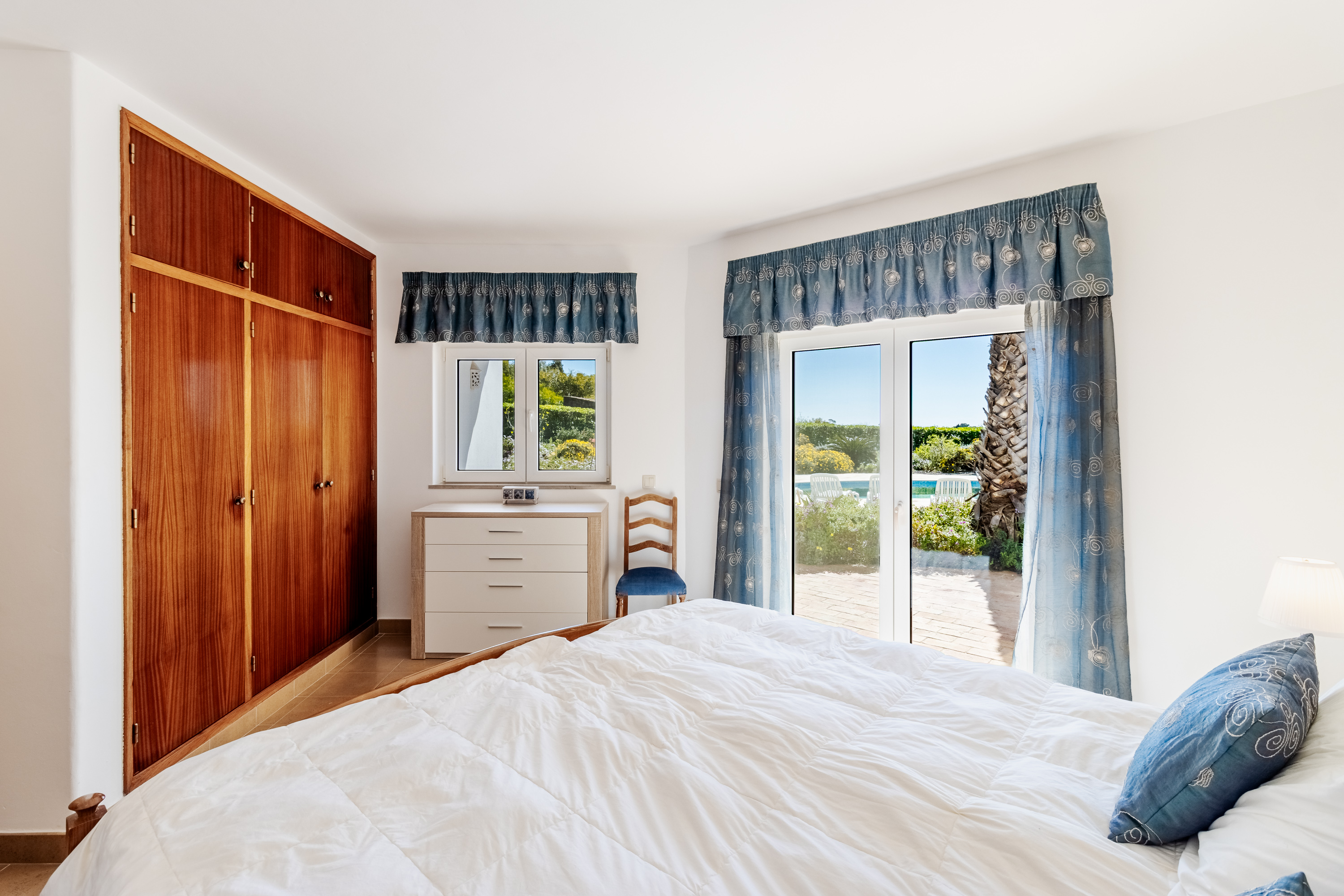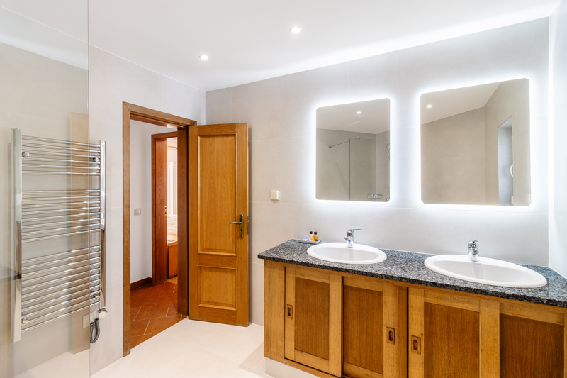 On the lower floor, the villa has three well-proportioned bedrooms. The master suite is a private retreat, featuring fitted wardrobes, air conditioning, and ceiling fans for year-round comfort. Its en-suite bathroom has been beautifully renovated, offering a luxurious combination of double sinks, a bath, and a separate shower. The master bedroom also benefits from its own covered terrace, creating a calm and secluded space to relax. The two additional bedrooms are equally inviting and share a stylishly updated family bathroom.