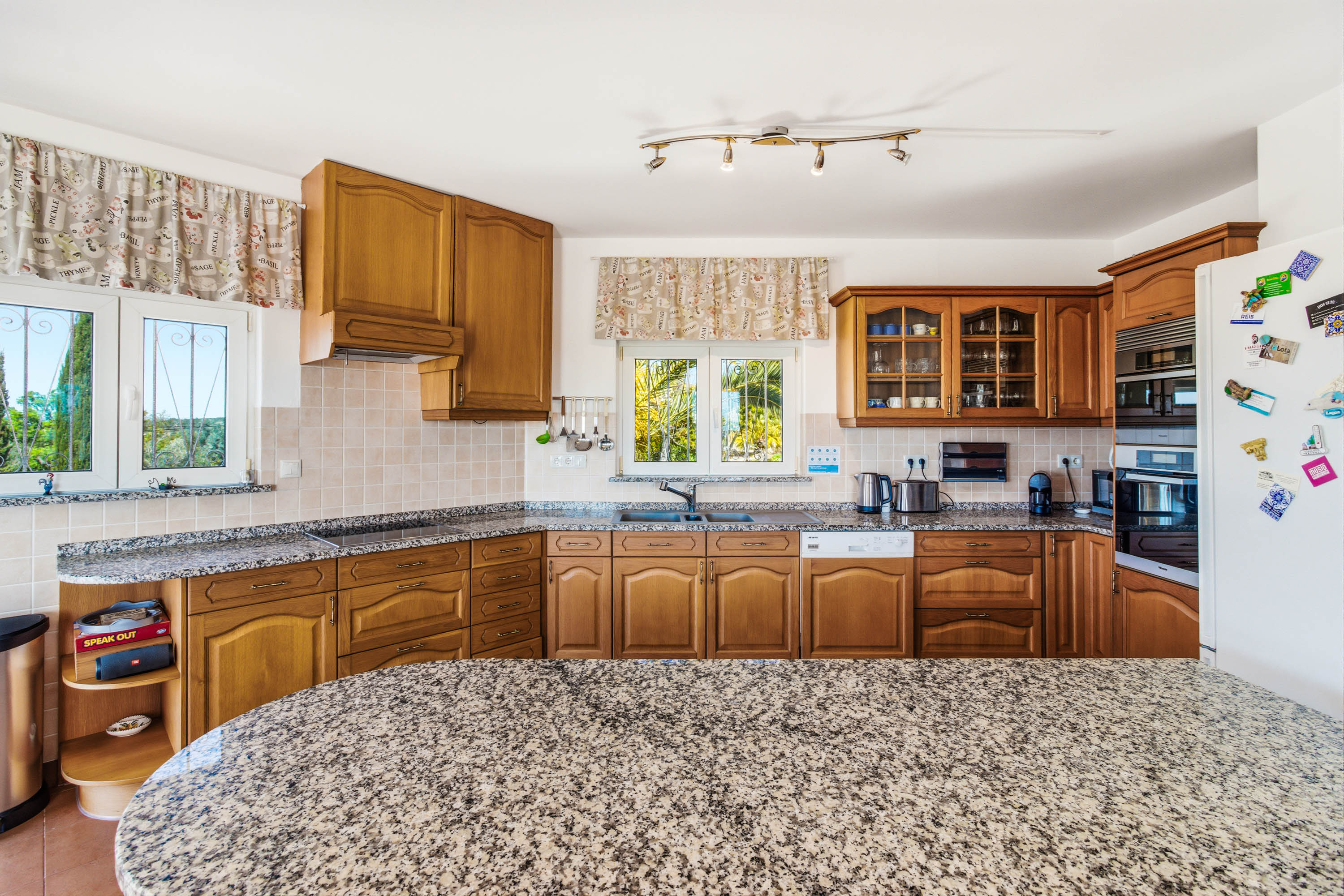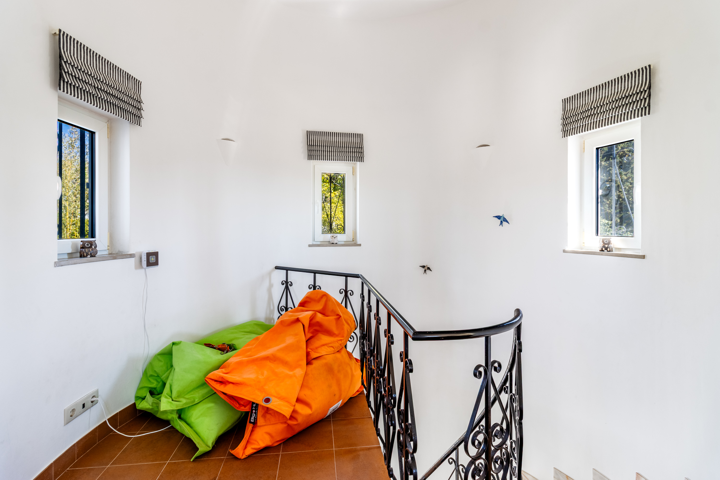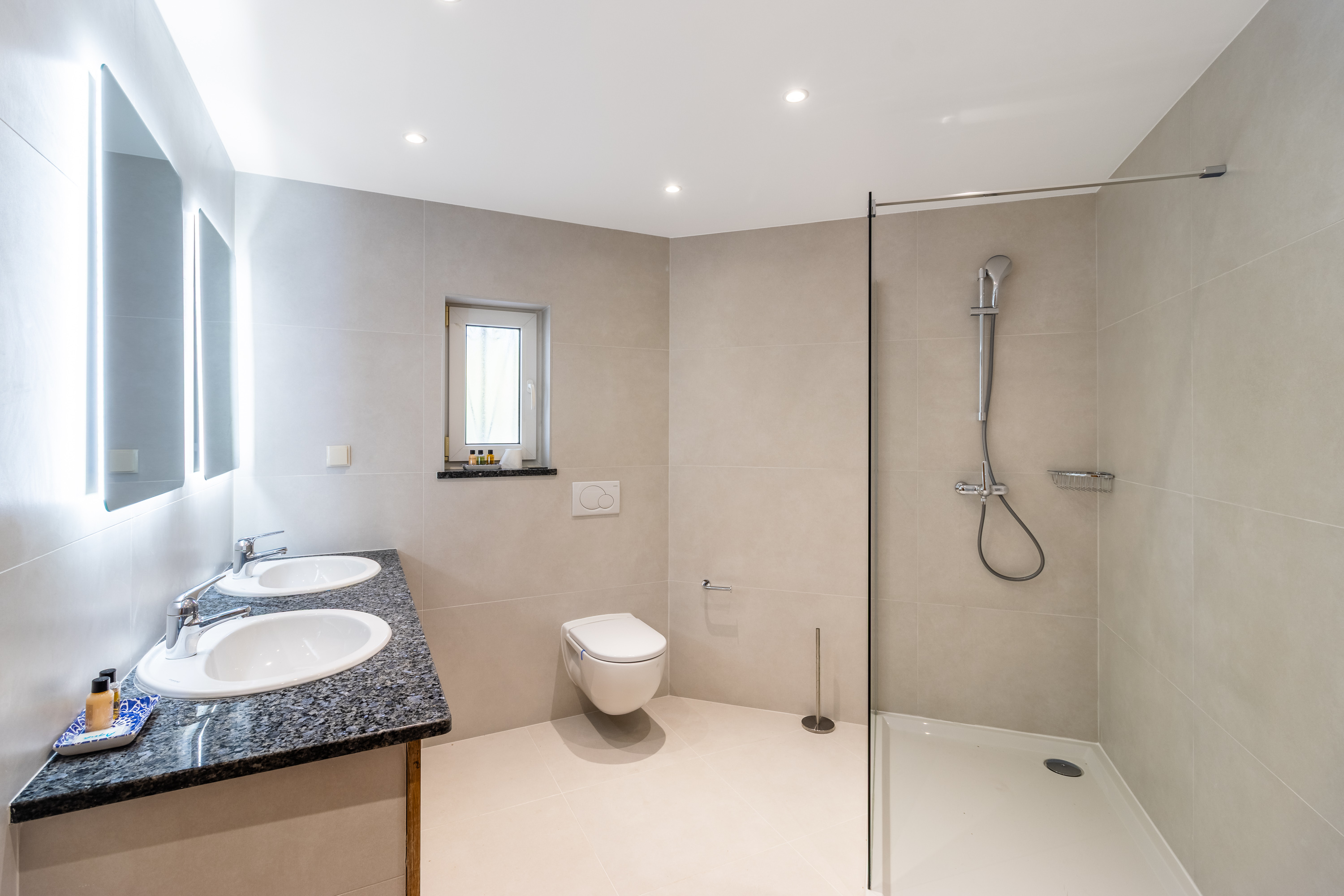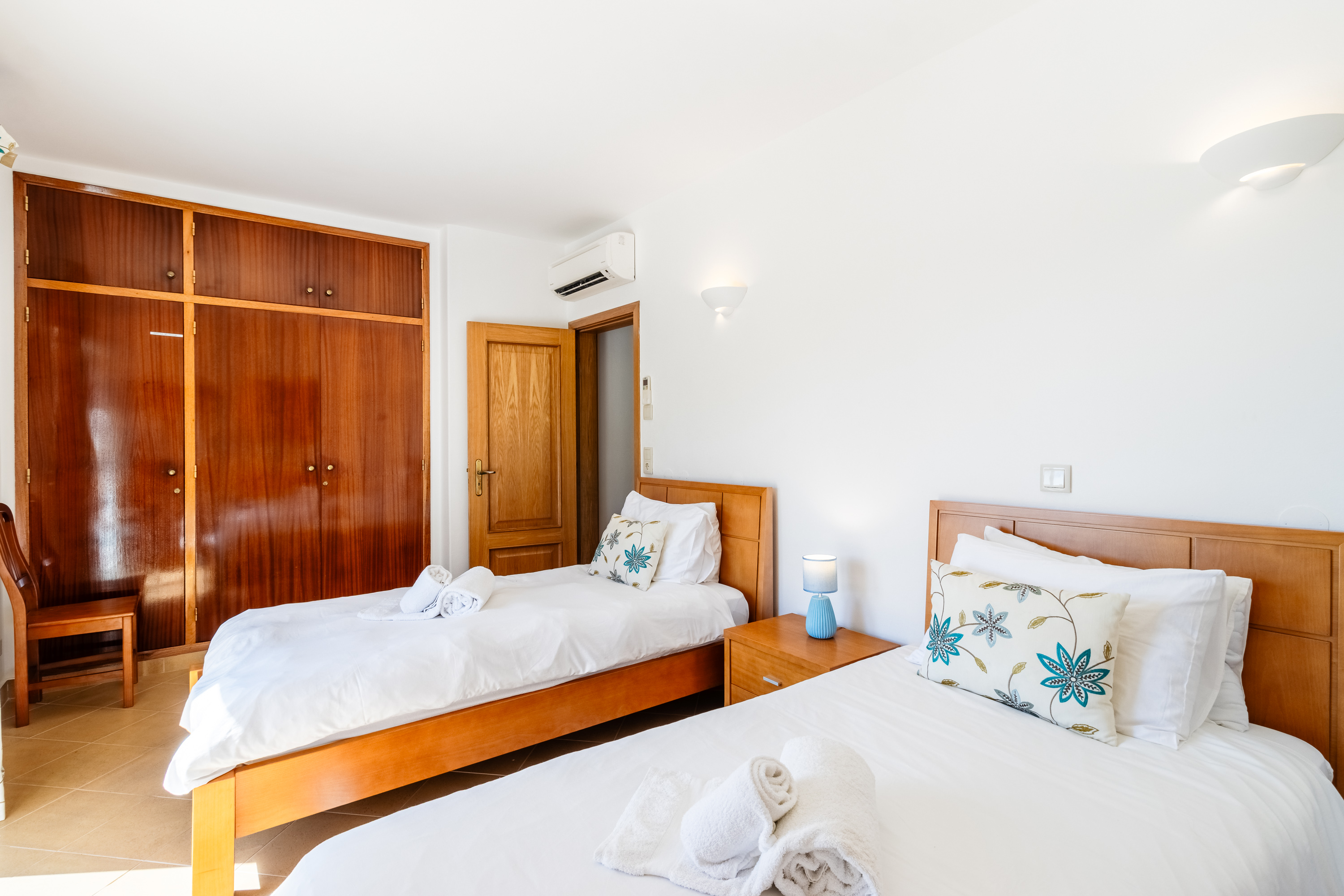 On the lower floor, the villa has three well-proportioned bedrooms. The master suite is a private retreat, featuring fitted wardrobes, air conditioning, and ceiling fans for year-round comfort. Its en-suite bathroom has been beautifully renovated, offering a luxurious combination of double sinks, a bath, and a separate shower. The master bedroom also benefits from its own covered terrace, creating a calm and secluded space to relax. The two additional bedrooms are equally inviting and share a stylishly updated family bathroom.