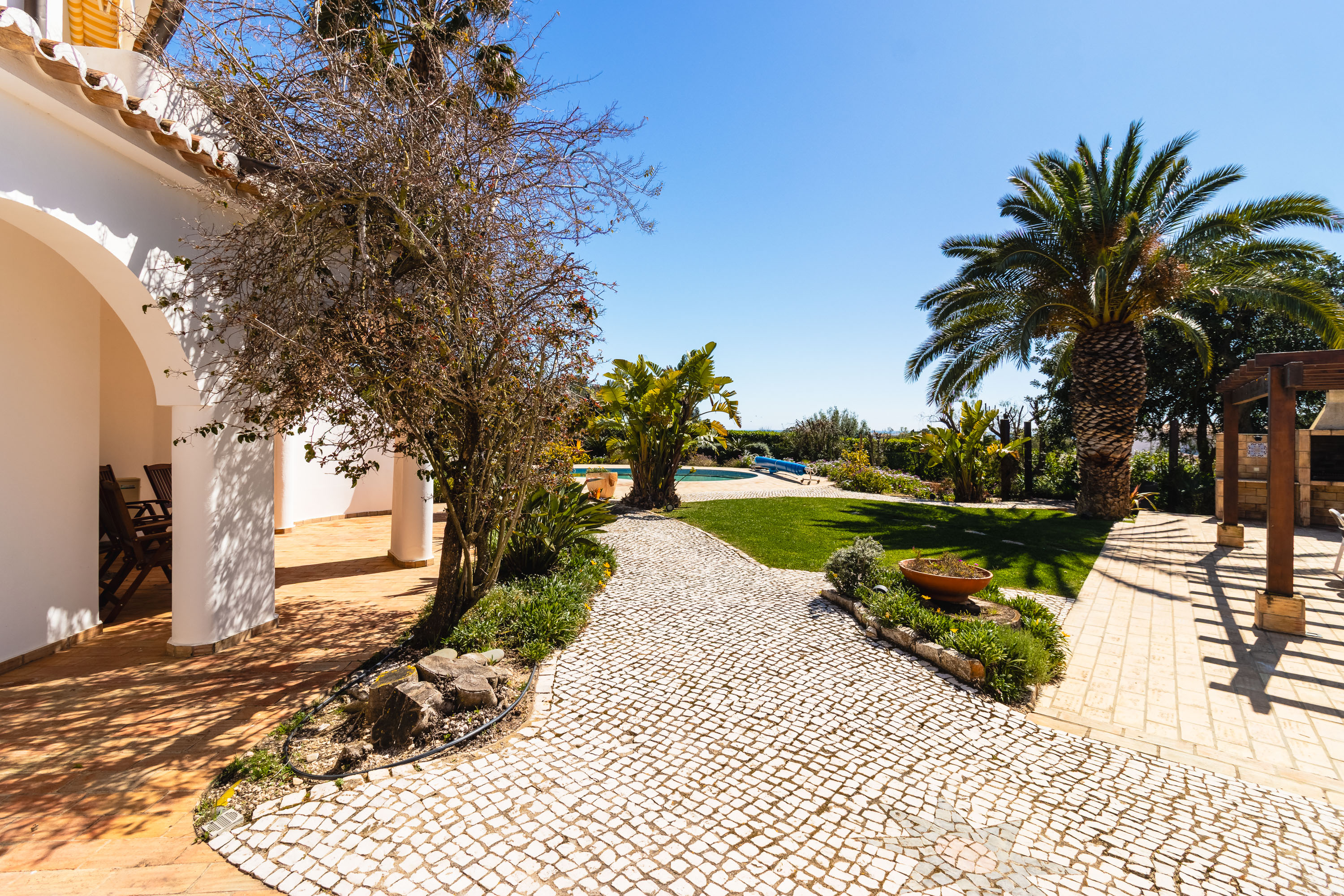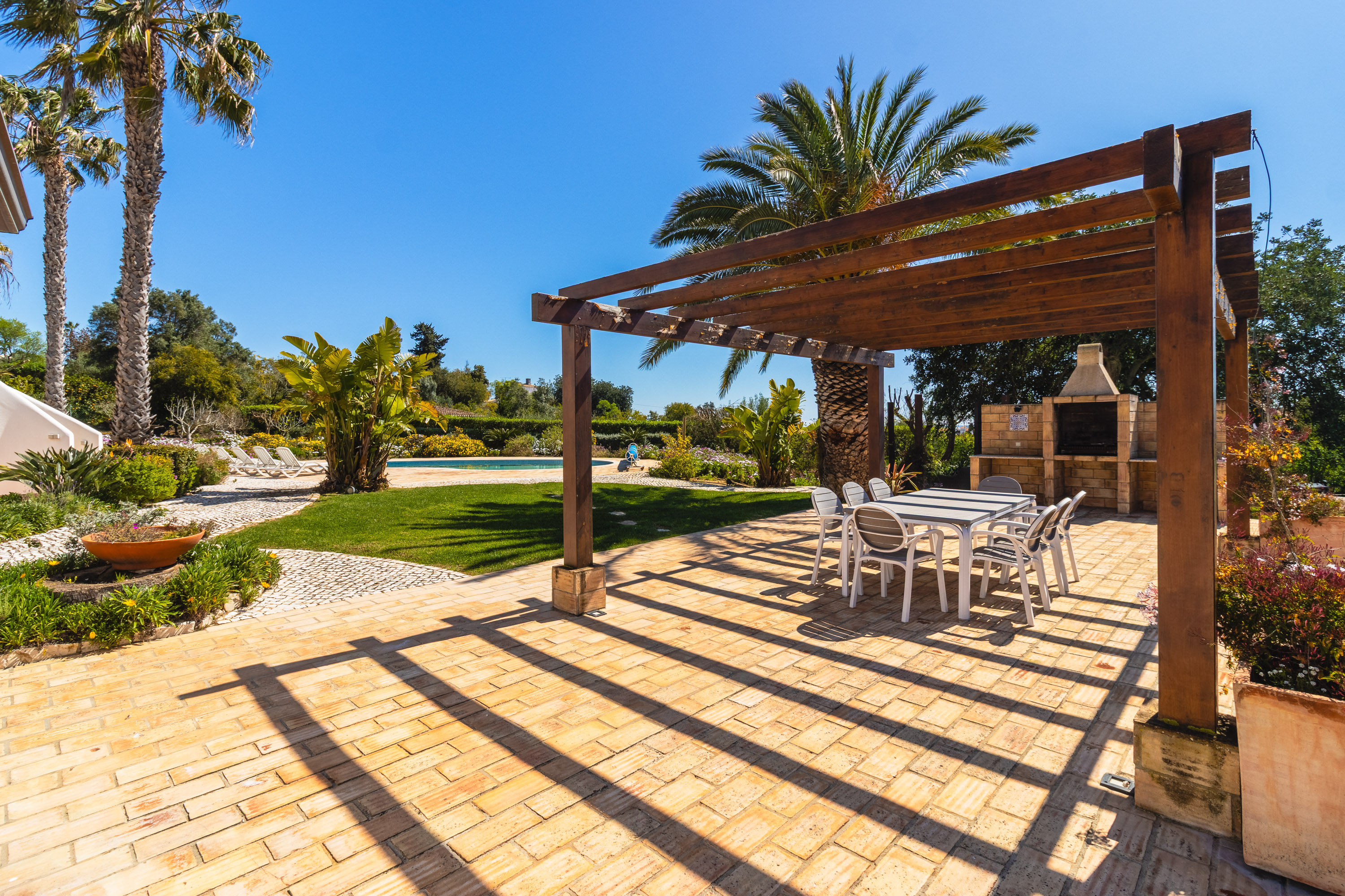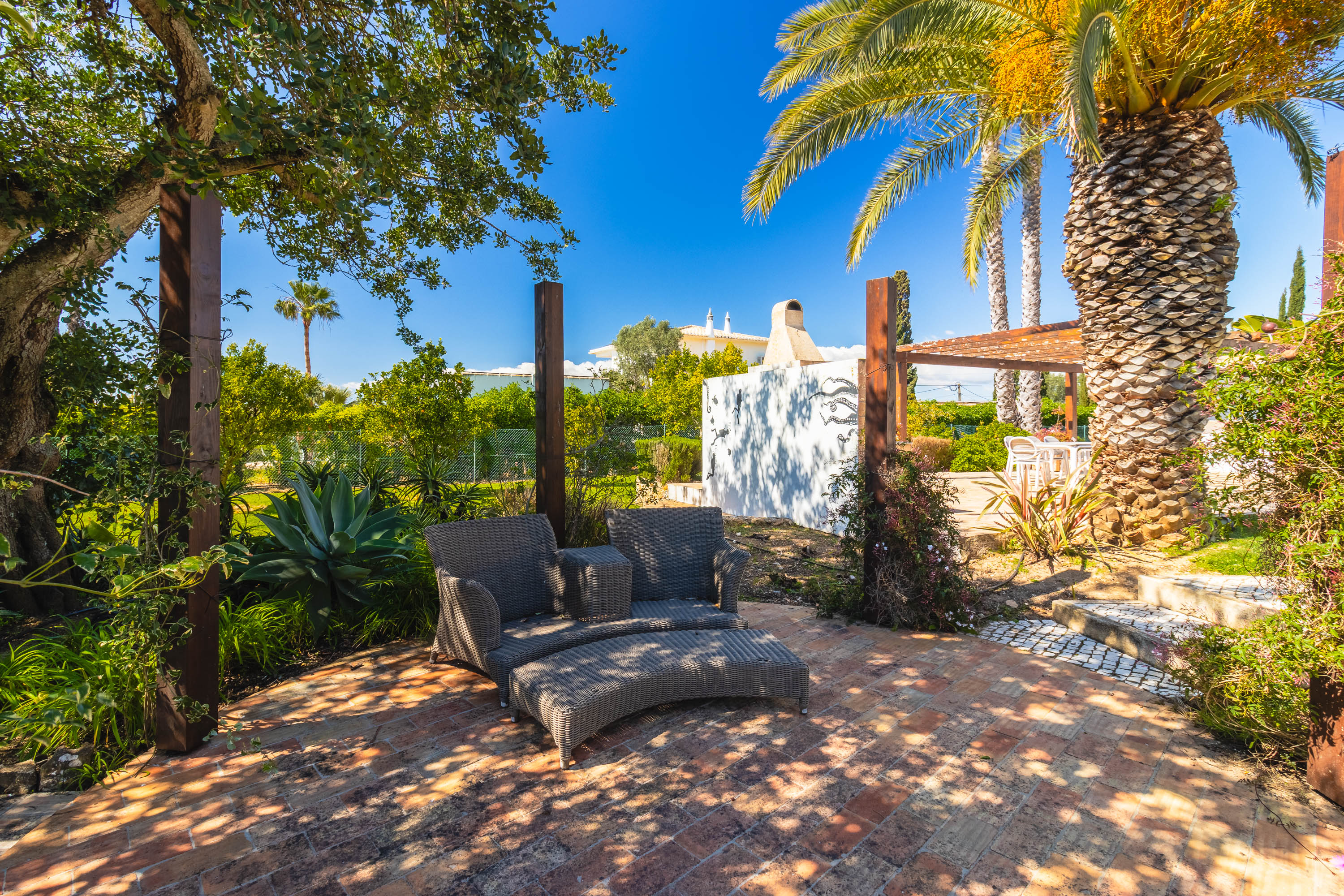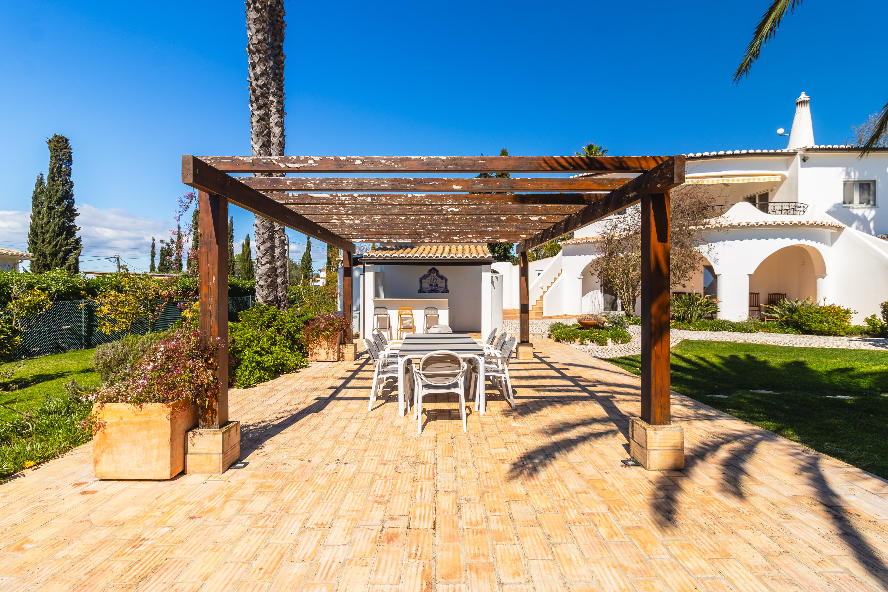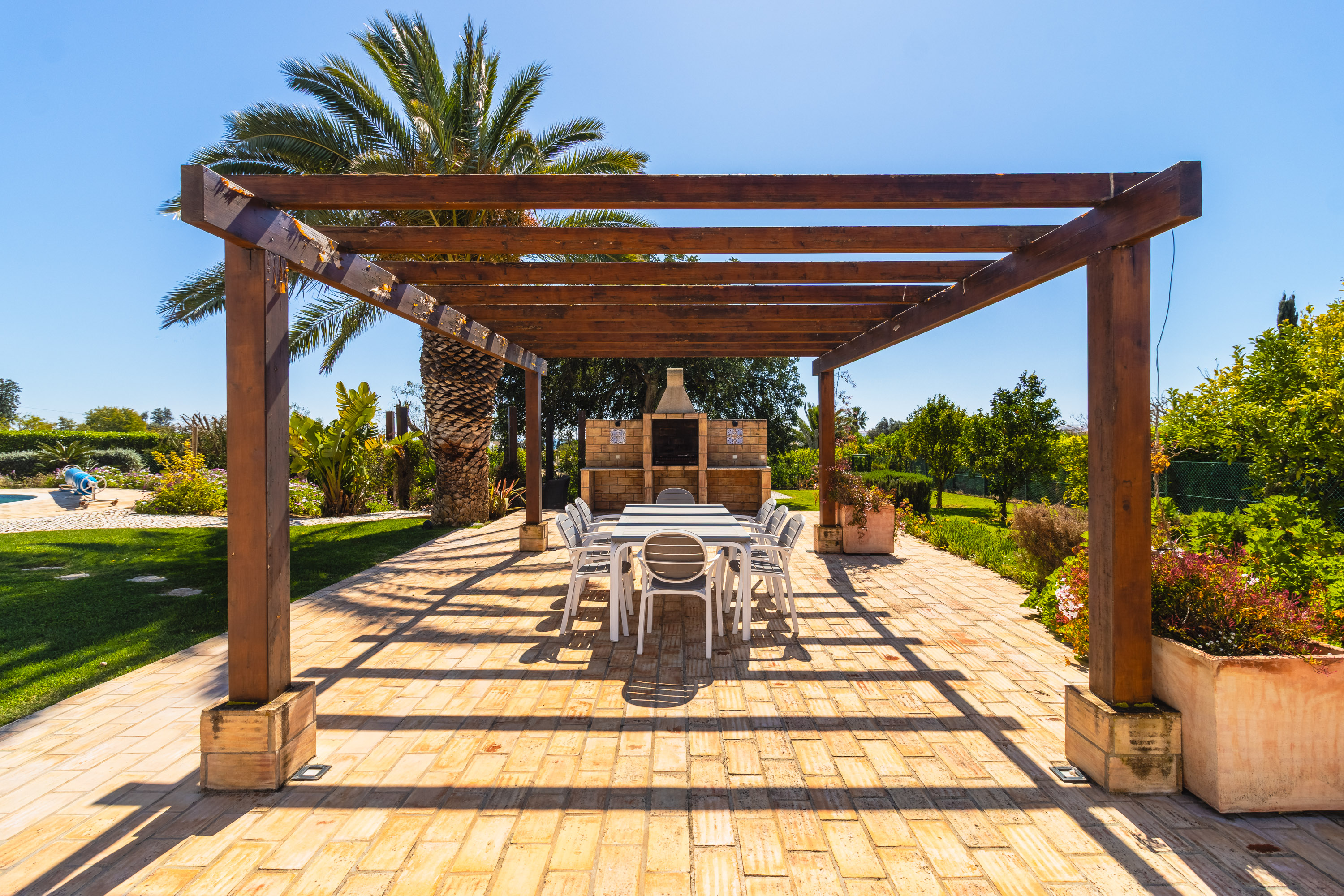 Outside is where the property truly shines. The landscaped garden is mature and lush, dotted with elegant palm trees and a variety of fruit trees, all supported by an automatic irrigation system. A gazebo provides shade for the outdoor dining area, complete with a built-in barbecue and summer kitchen—perfect for relaxed afternoons by the pool.