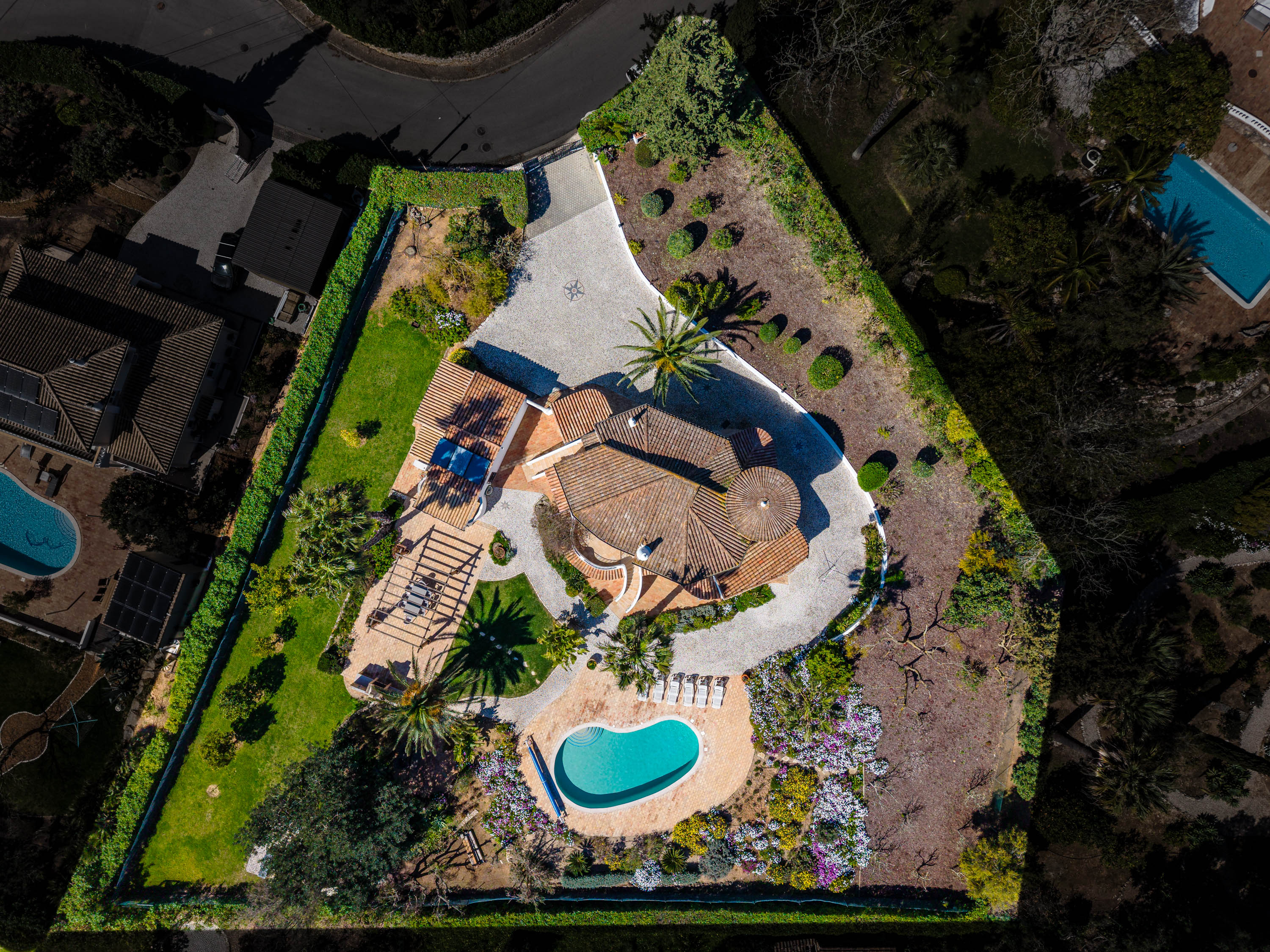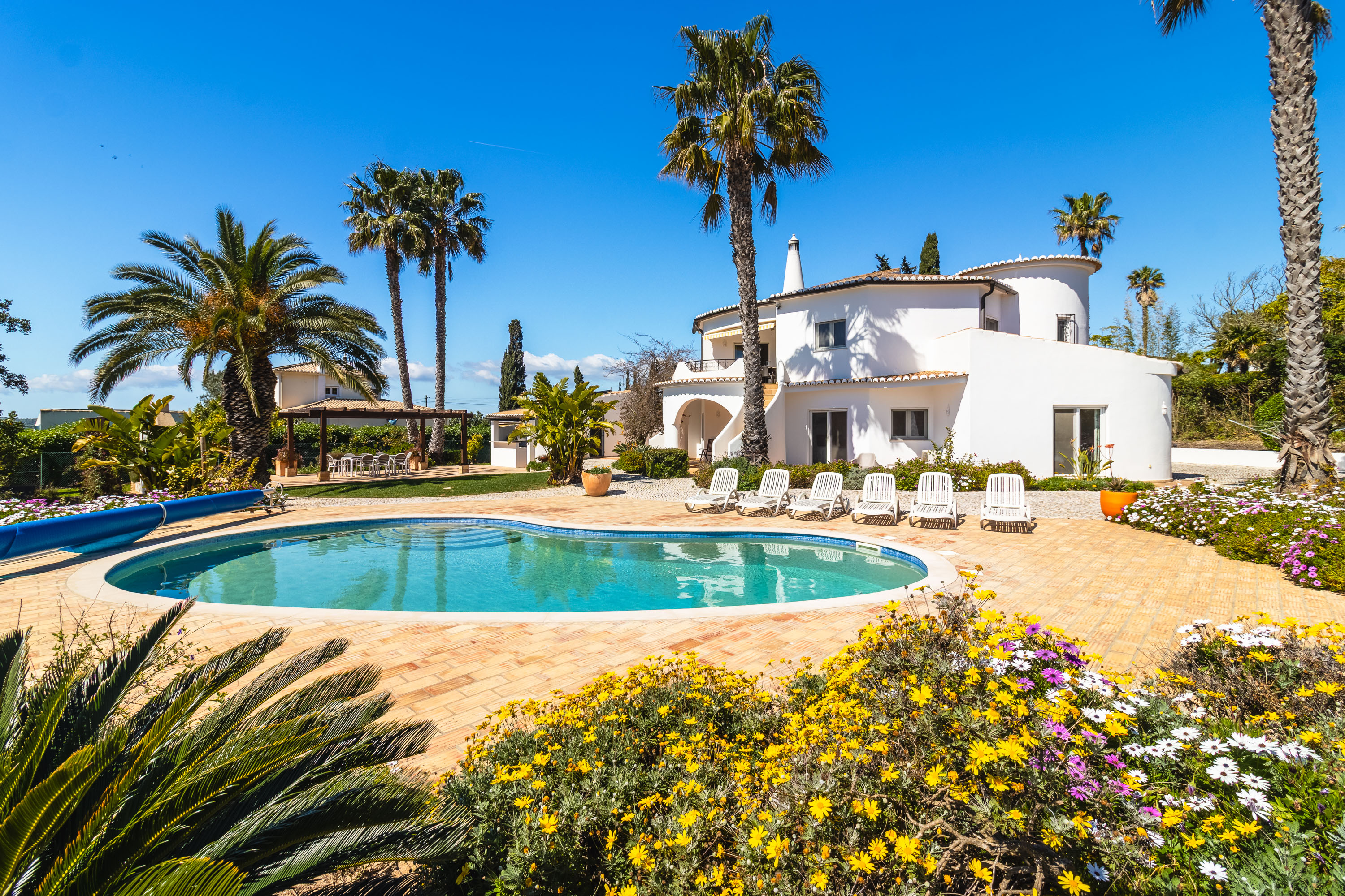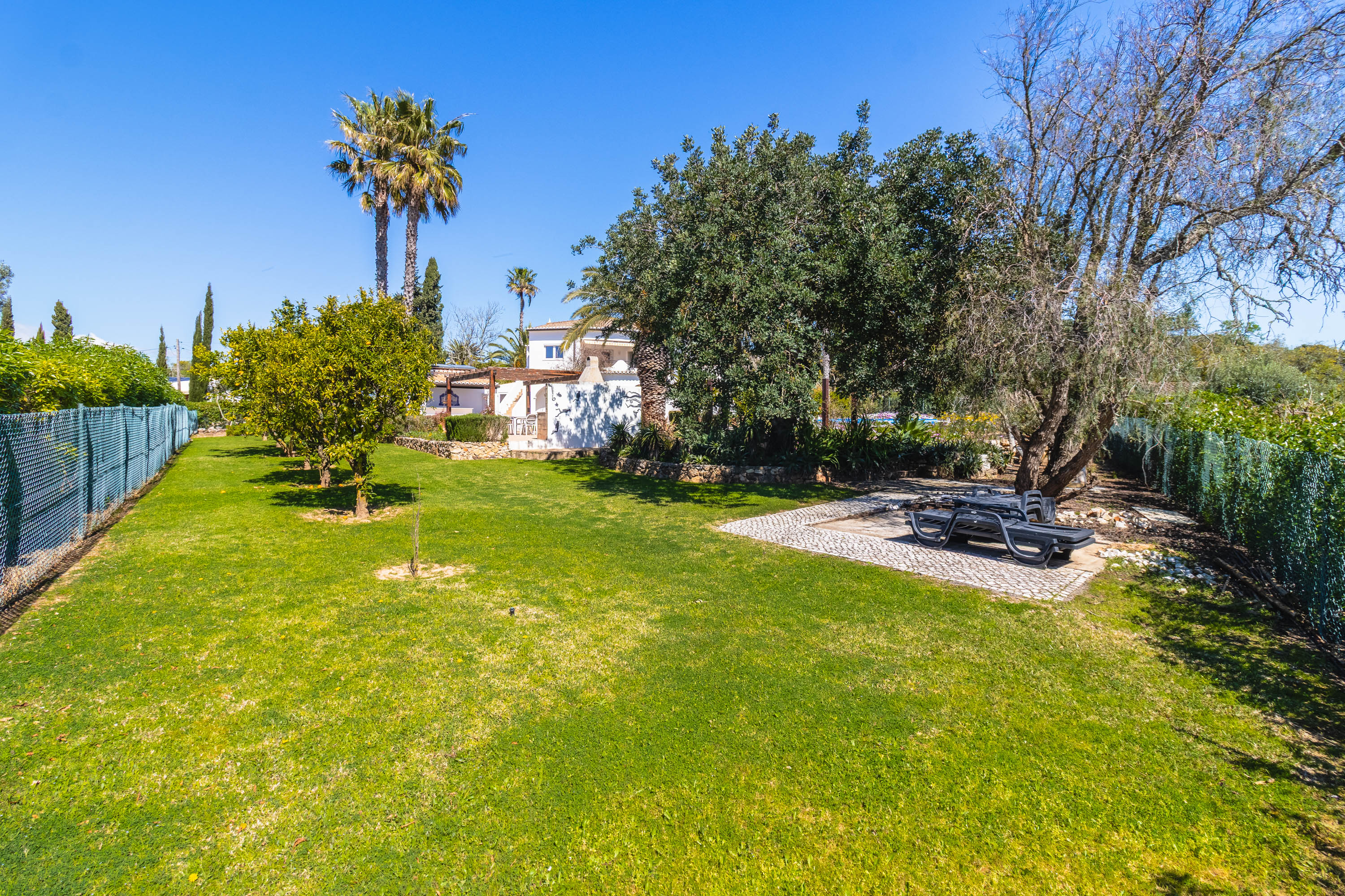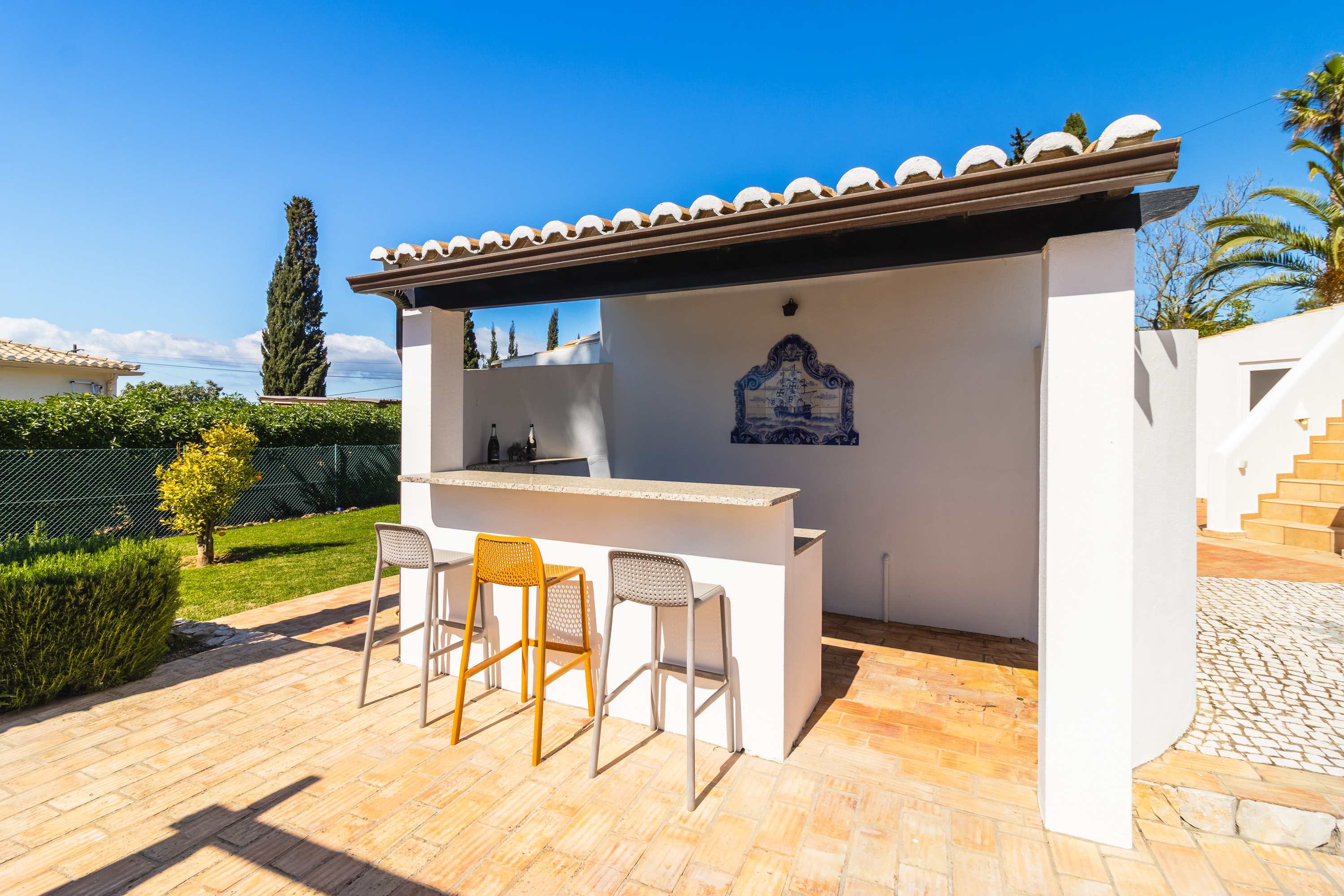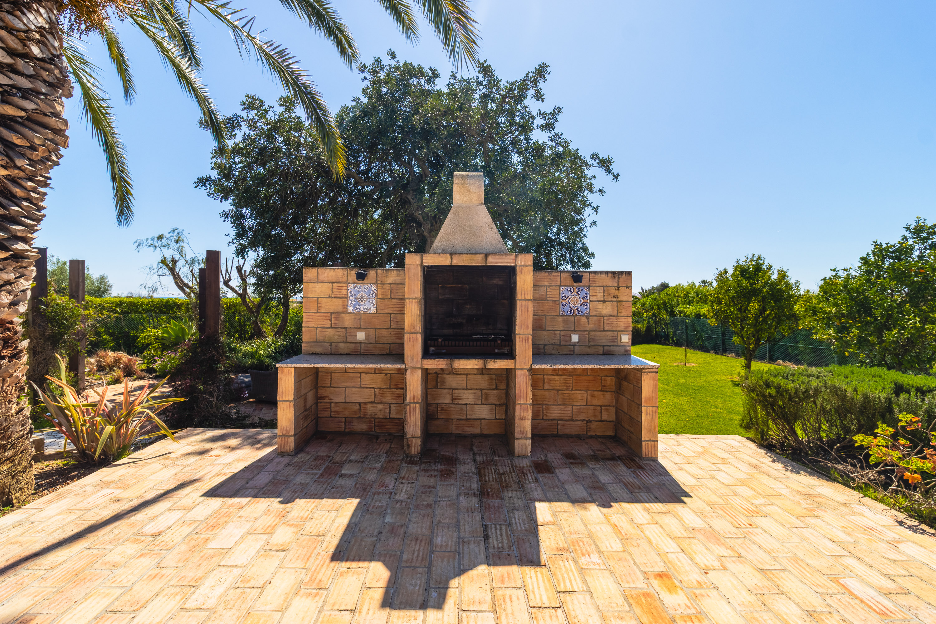 Outside is where the property truly shines. The landscaped garden is mature and lush, dotted with elegant palm trees and a variety of fruit trees, all supported by an automatic irrigation system. A gazebo provides shade for the outdoor dining area, complete with a built-in barbecue and summer kitchen—perfect for relaxed afternoons by the pool.