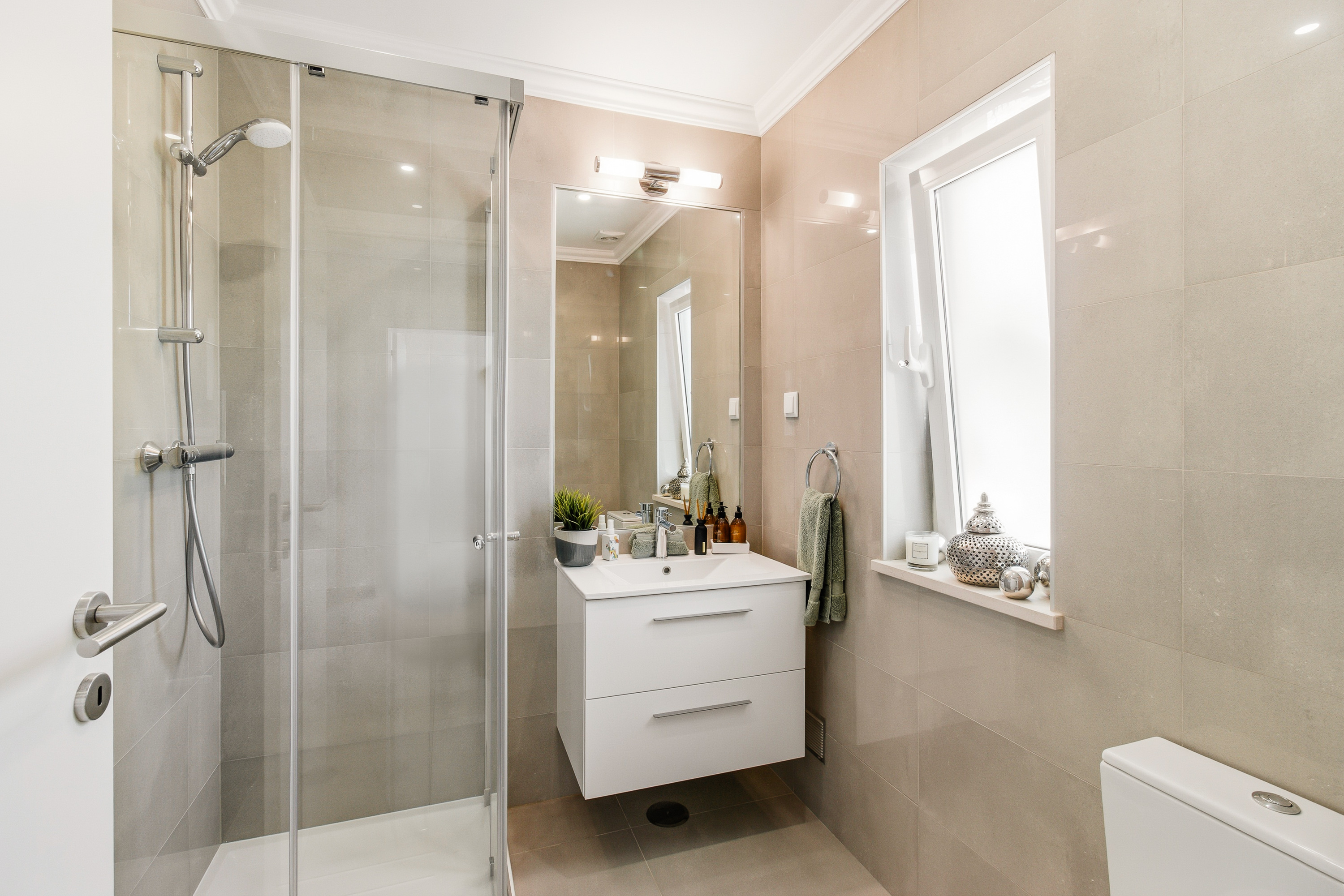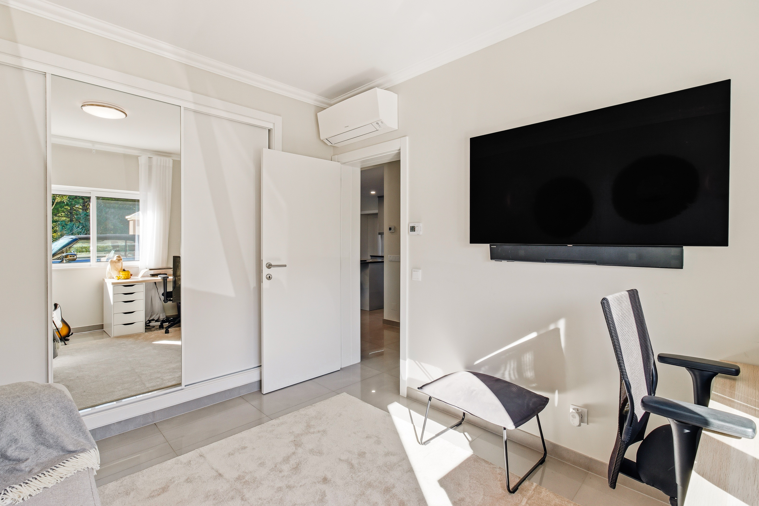 On the ground level is a versatile room that can function as a guest bedroom, office, or gym, accompanied and a family modern bathroom, offering flexibility for a variety of lifestyles. Comfort is ensured with a stylish ethanol fireplace.