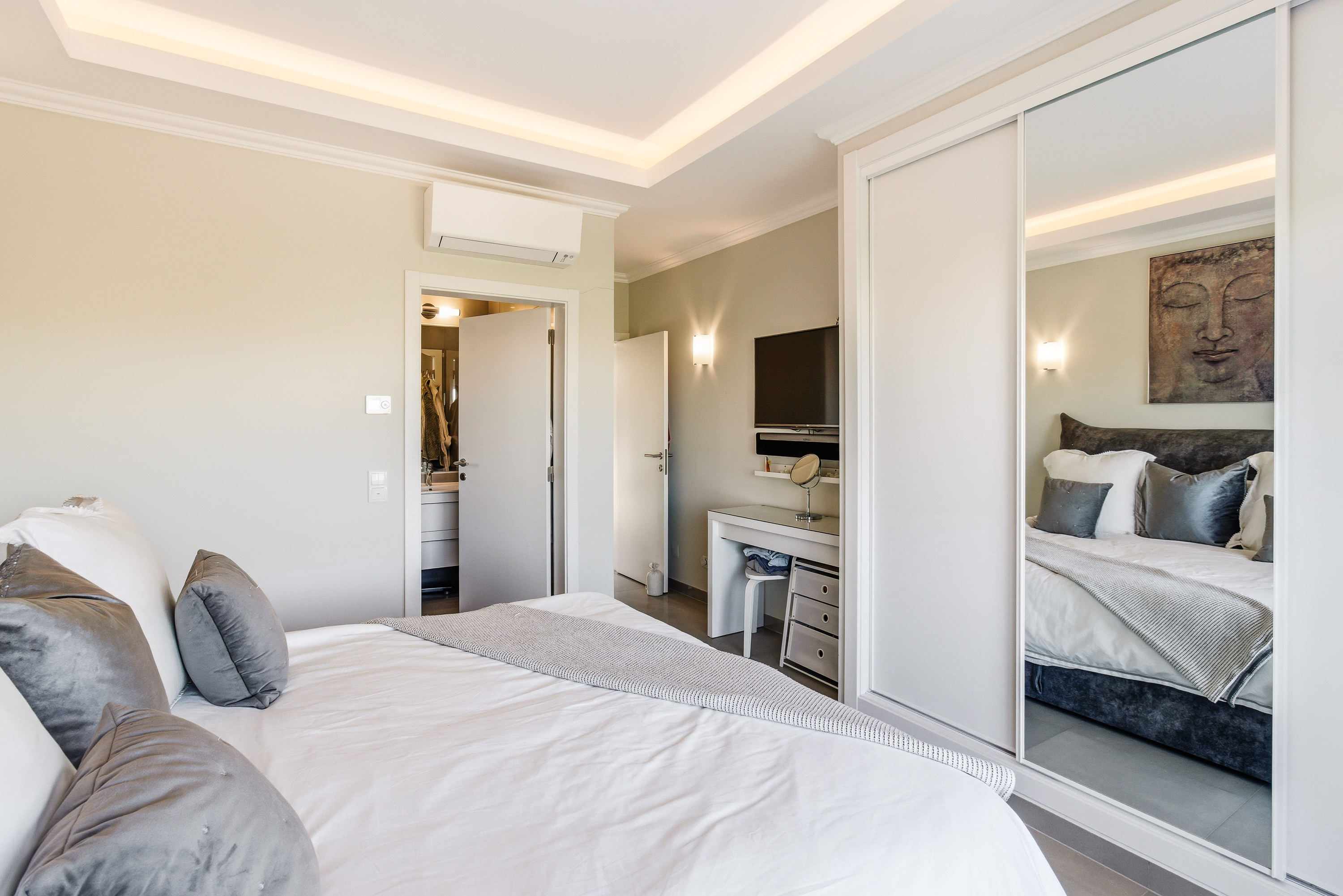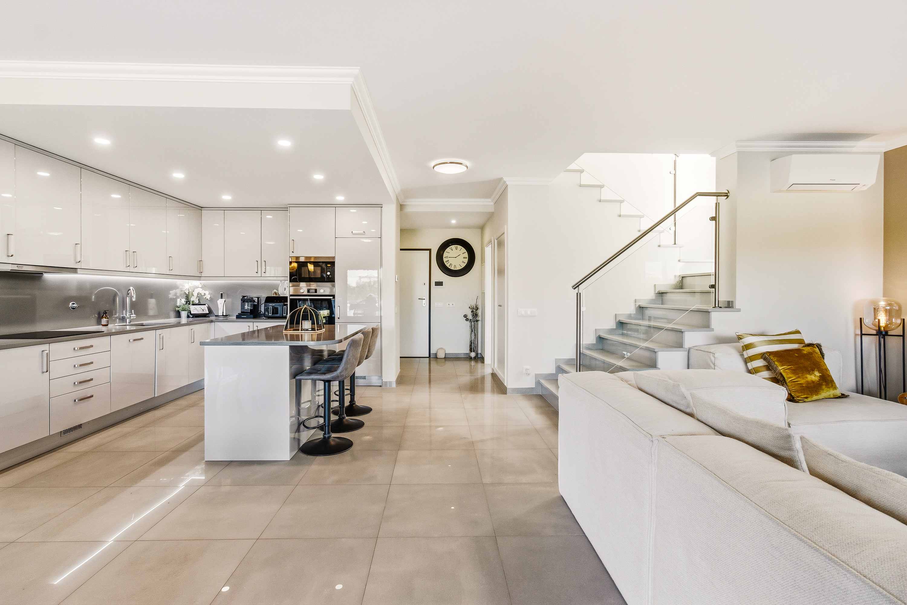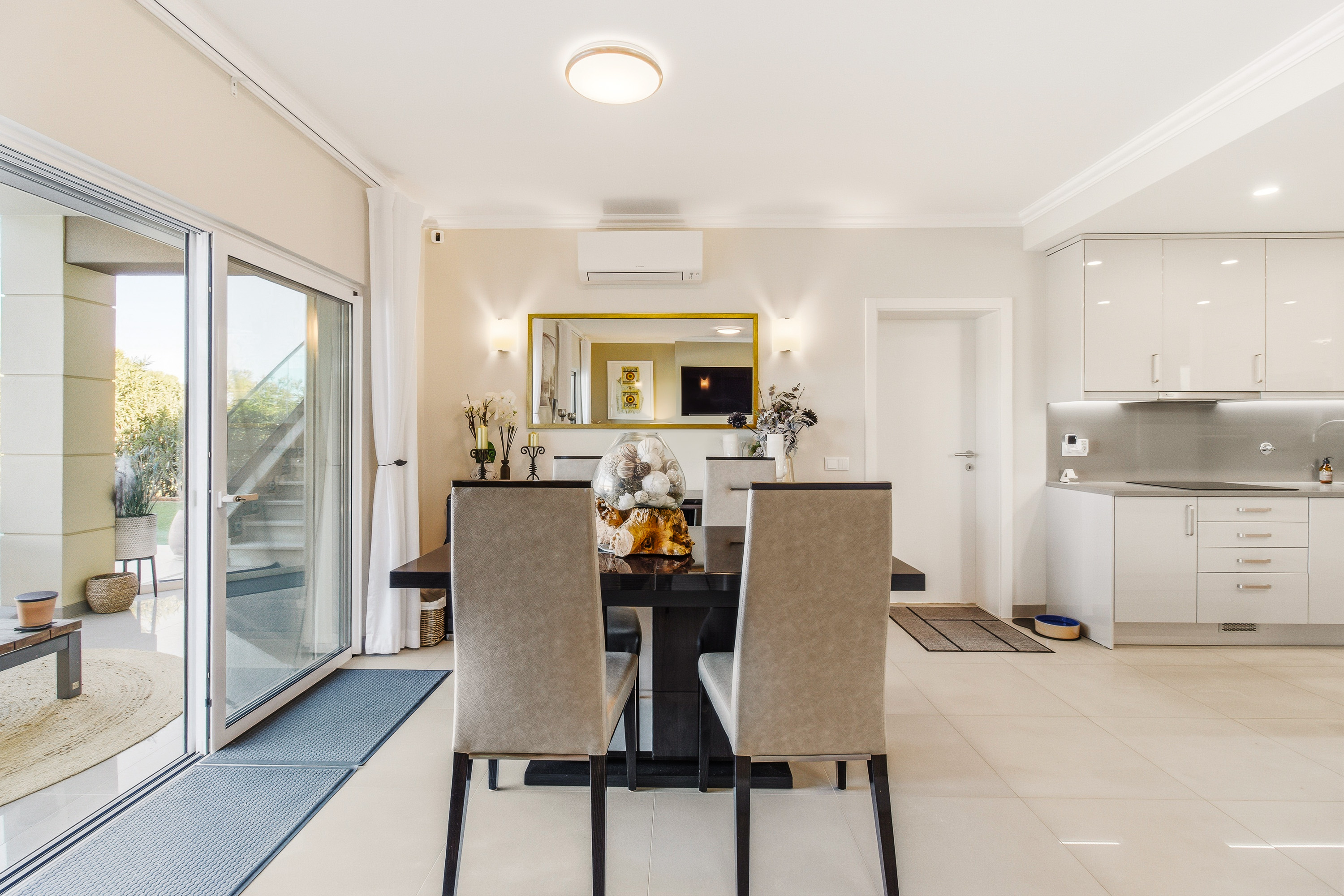 The villa’s design emphasizes light, space, and seamless indoor-outdoor living. On the ground floor, the open-plan kitchen, dining, and living areas flow effortlessly toward the west-facing heated swimming pool, creating a natural connection between the interior and the sun-drenched terraces. Practicality and convenience are integrated throughout the property. A winter terrace can be enclosed with glass to create an additional living area. The kitchen features a central island, fully equipped appliances, and a design that encourages both everyday family life and entertaining.