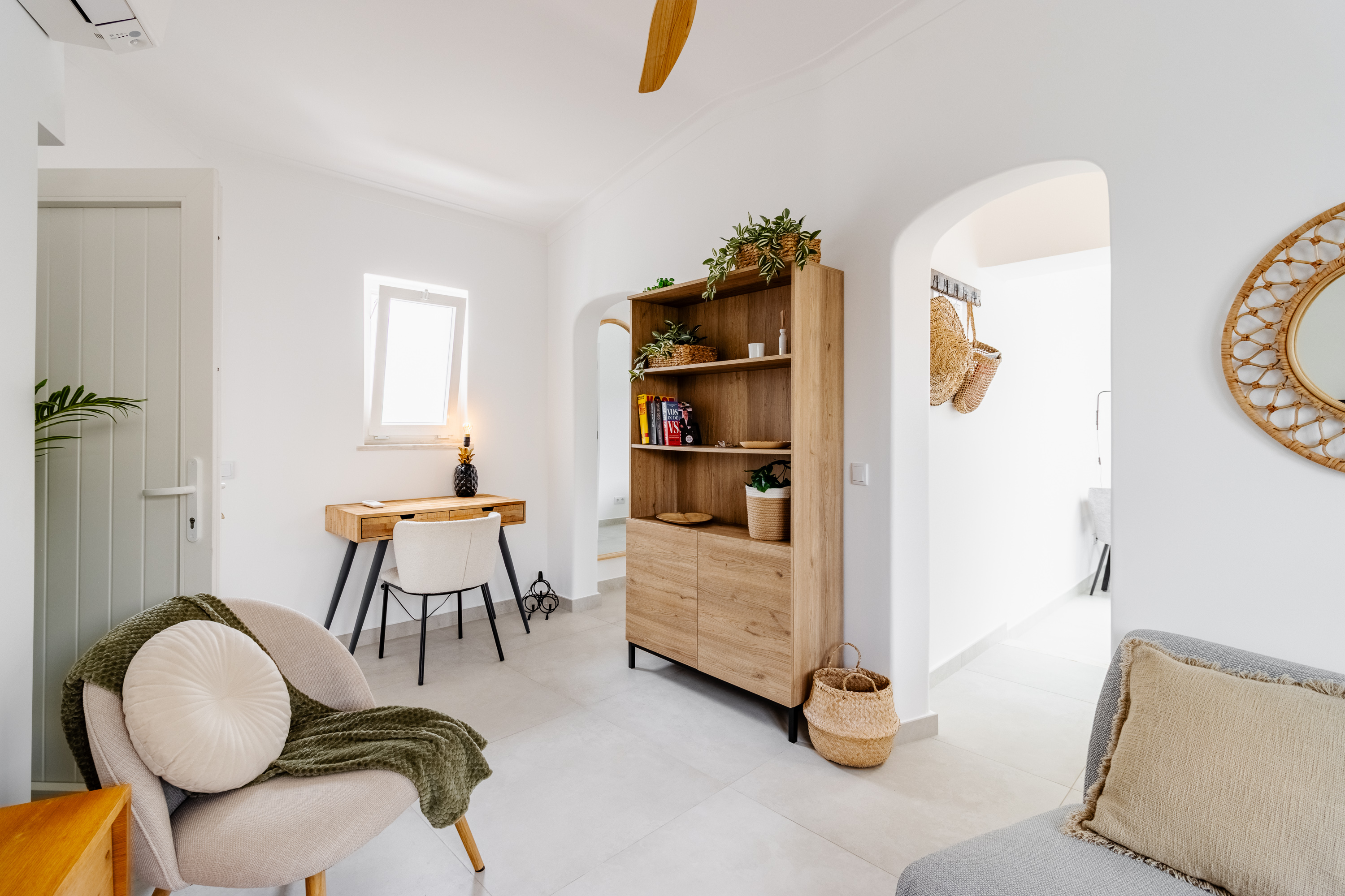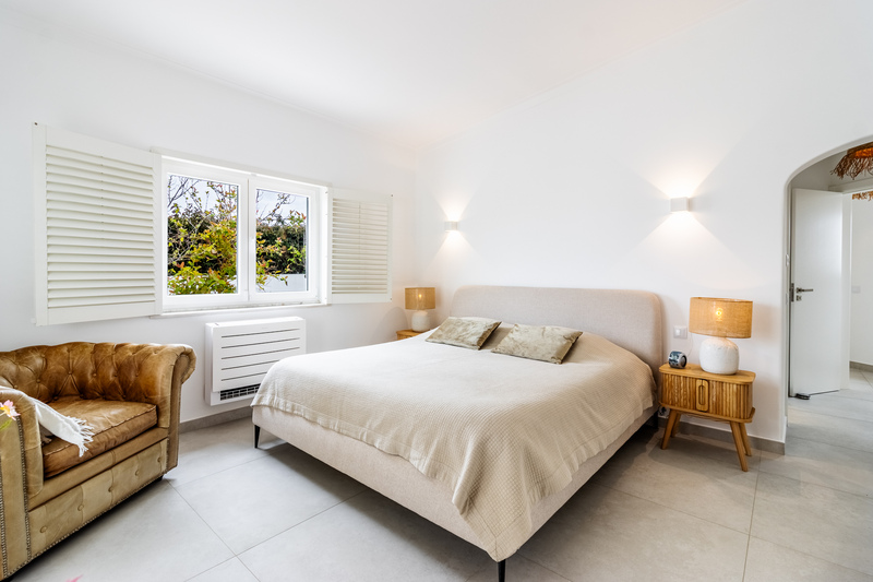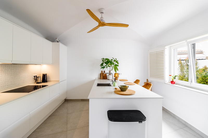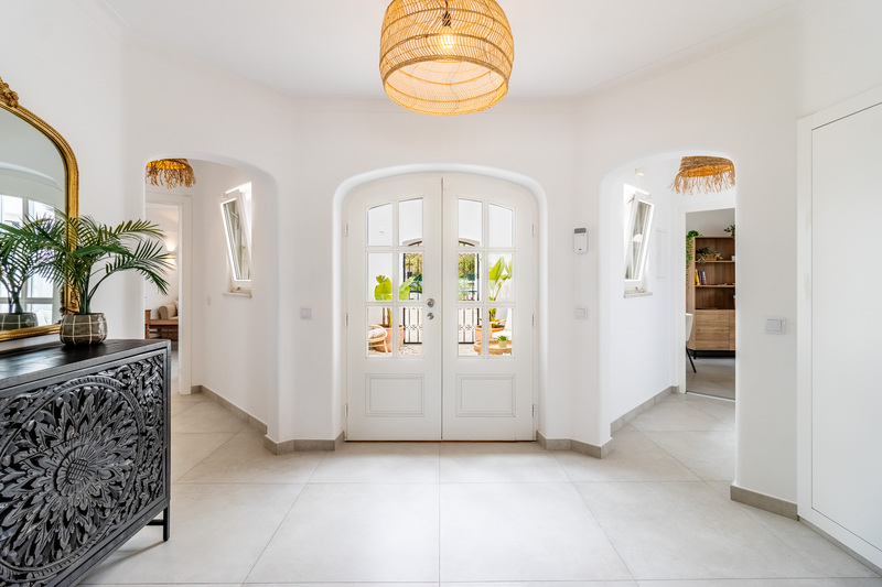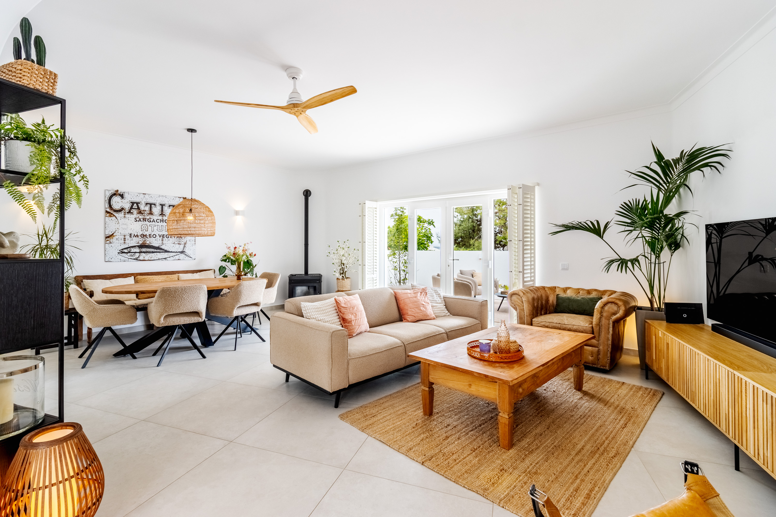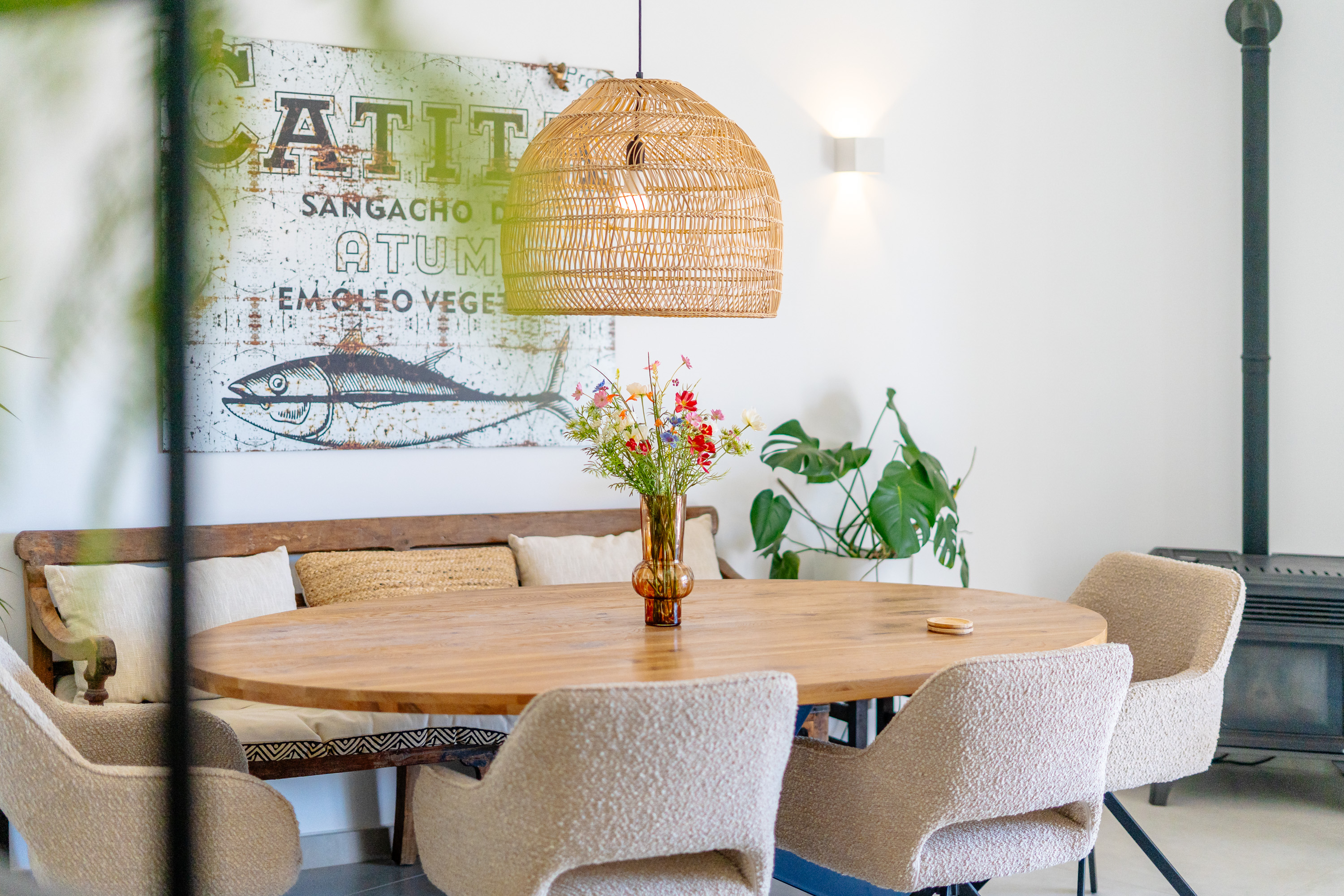 A striking circular entrance welcomes you into the home, leading through to the open-plan living, dining, and kitchen area. Elegant wide archways add a subtle Portuguese character while maintaining a modern aesthetic. The living room features a vintage-style pellet stove and doors opening directly onto the garden and pool area. The kitchen is thoughtfully designed with stylish tiled finishes, sleek cabinetry, an induction hob, built-in water filter tap, and a large central island providing additional workspace and storage.