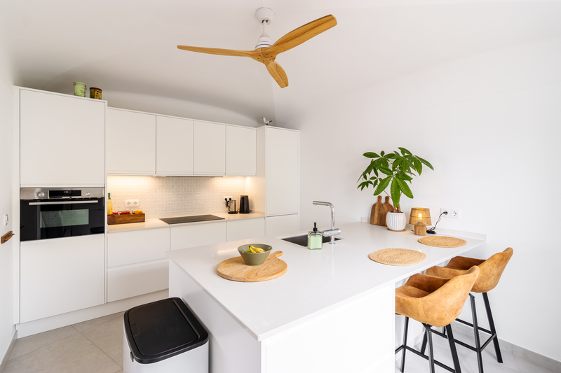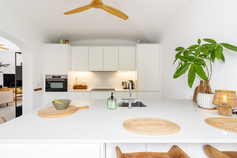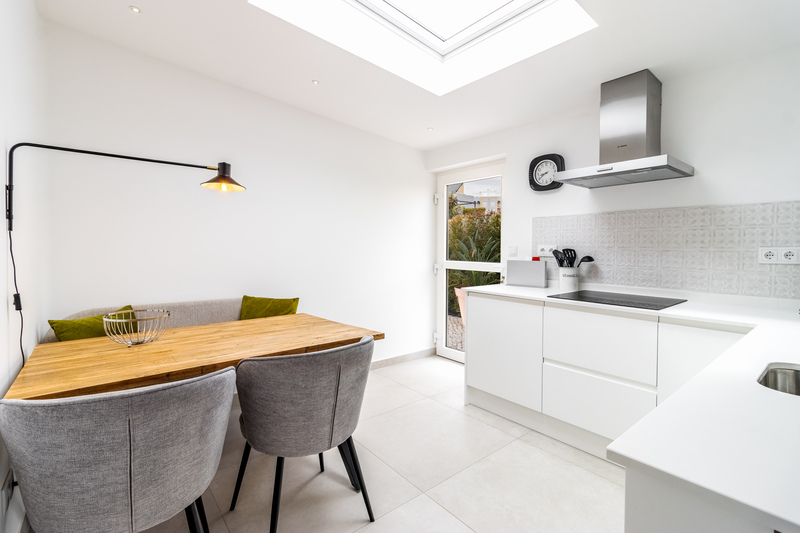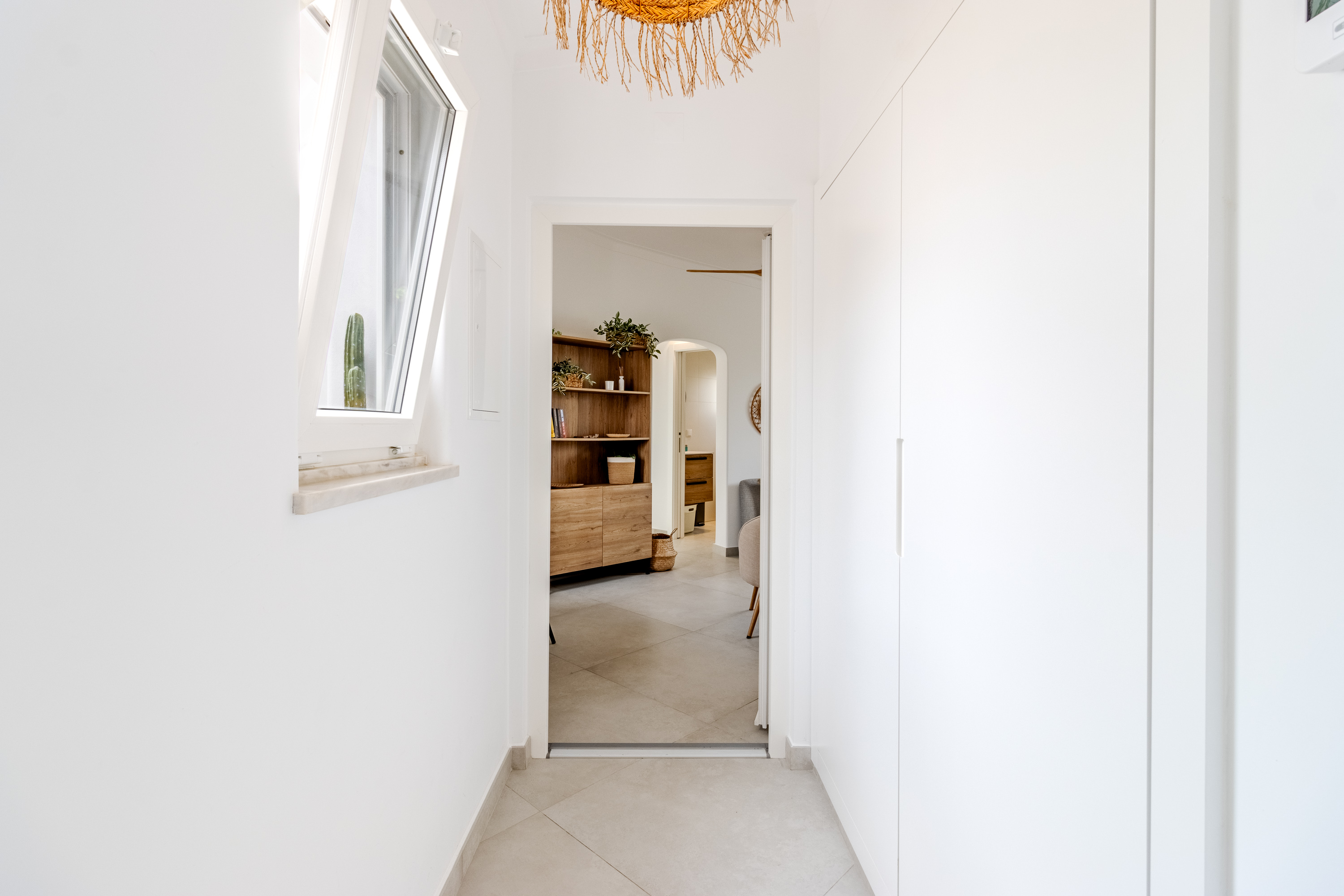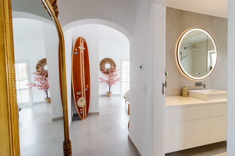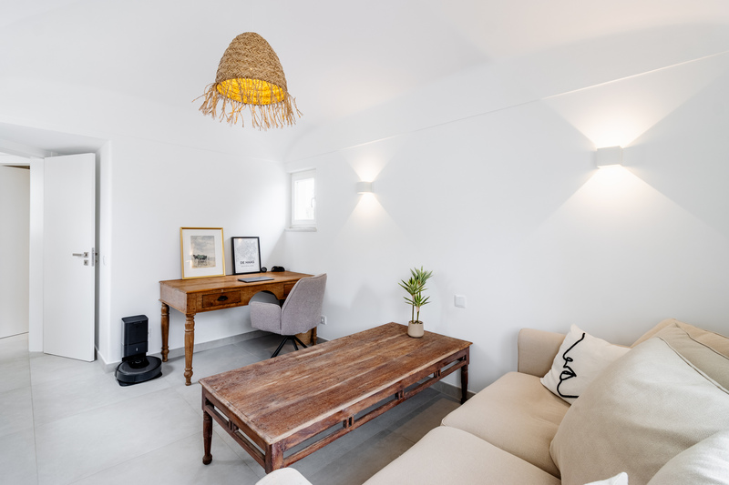 A striking circular entrance welcomes you into the home, leading through to the open-plan living, dining, and kitchen area. Elegant wide archways add a subtle Portuguese character while maintaining a modern aesthetic. The living room features a vintage-style pellet stove and doors opening directly onto the garden and pool area. The kitchen is thoughtfully designed with stylish tiled finishes, sleek cabinetry, an induction hob, built-in water filter tap, and a large central island providing additional workspace and storage.