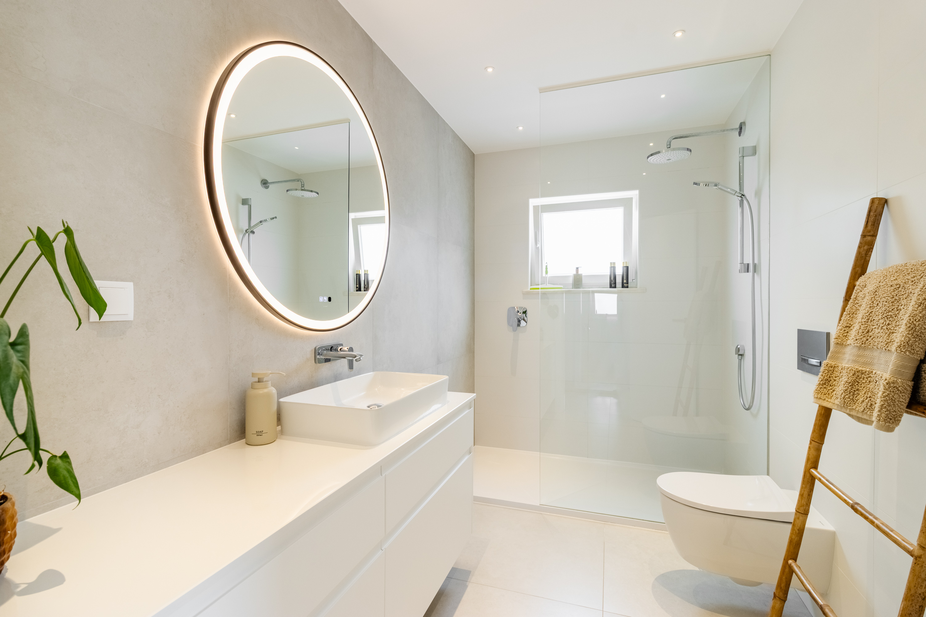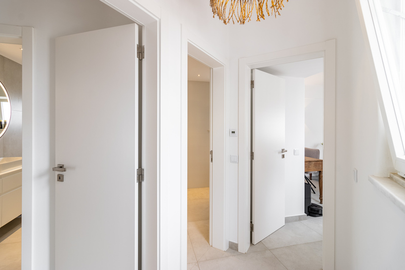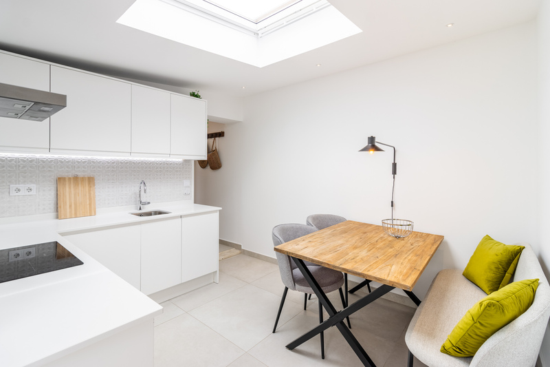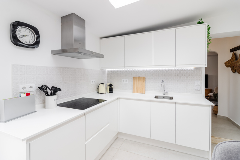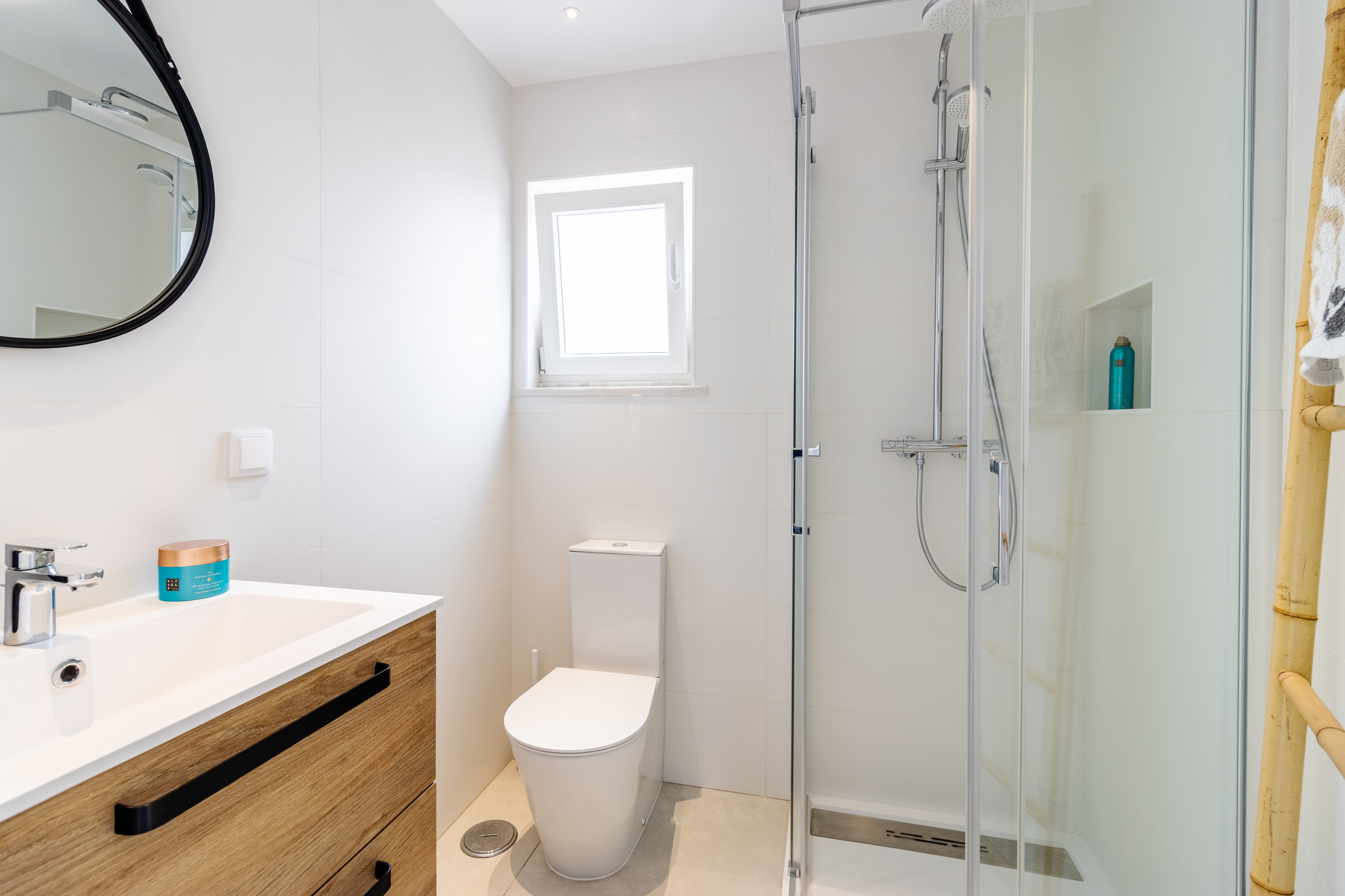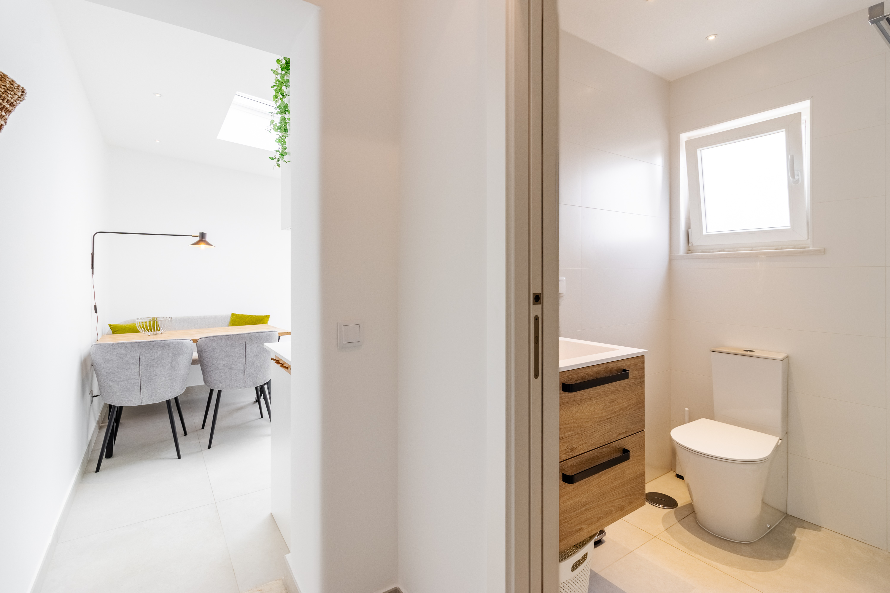 A striking circular entrance welcomes you into the home, leading through to the open-plan living, dining, and kitchen area. Elegant wide archways add a subtle Portuguese character while maintaining a modern aesthetic. The living room features a vintage-style pellet stove and doors opening directly onto the garden and pool area. The kitchen is thoughtfully designed with stylish tiled finishes, sleek cabinetry, an induction hob, built-in water filter tap, and a large central island providing additional workspace and storage.