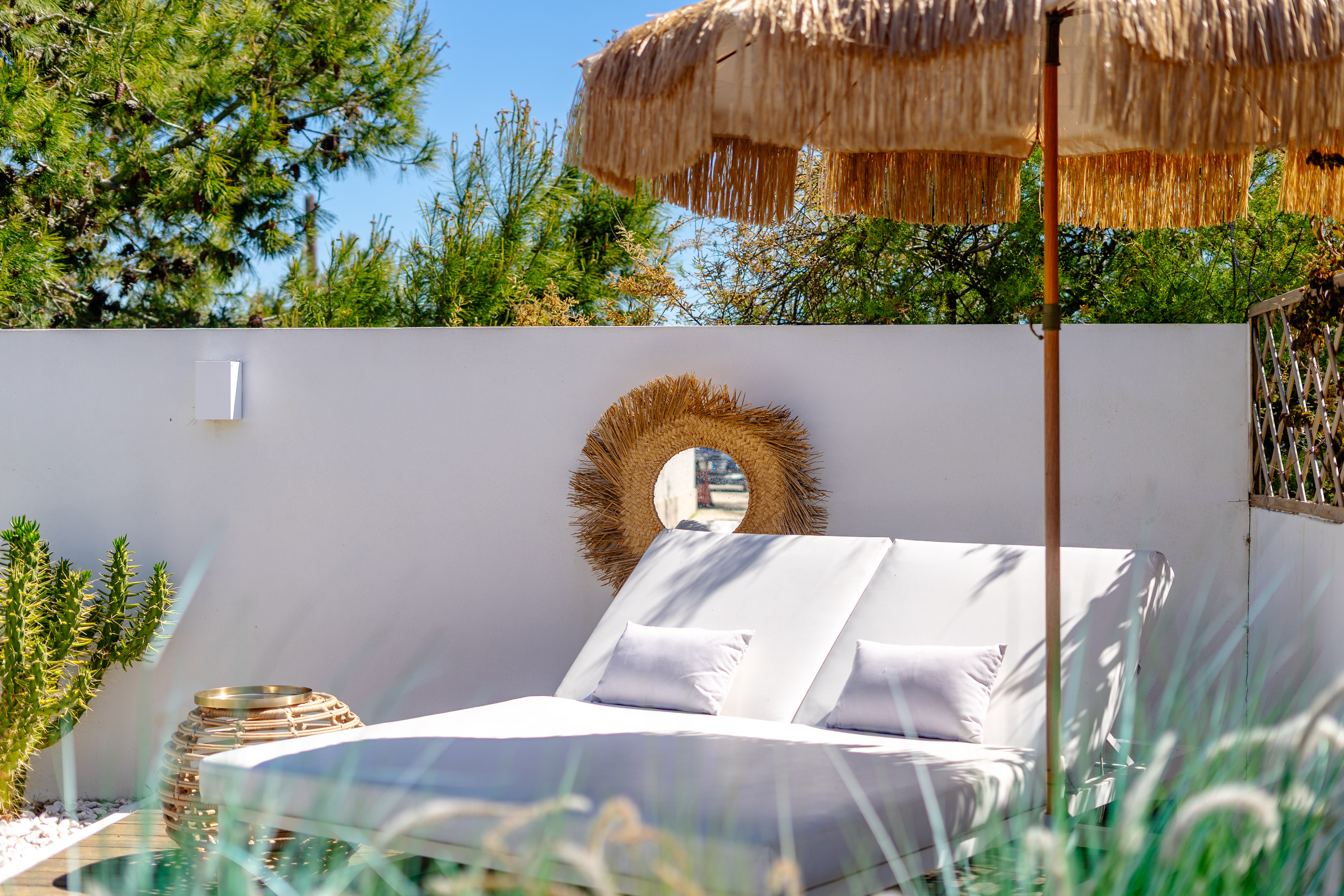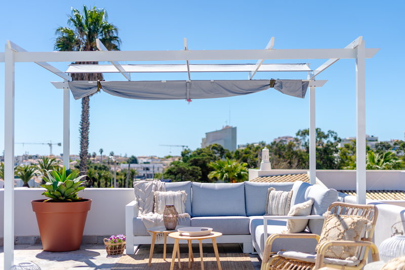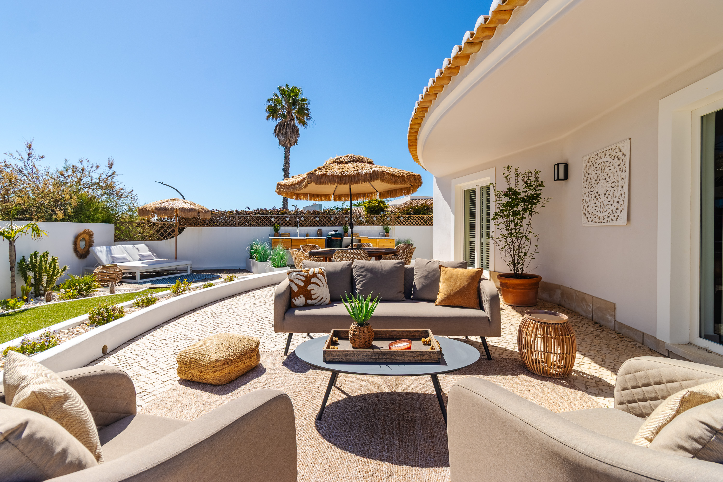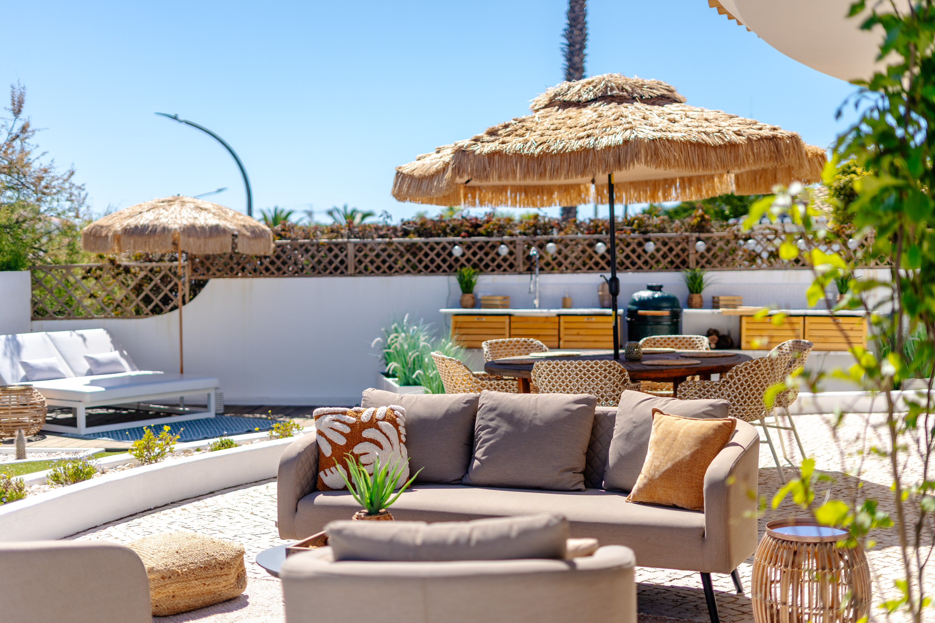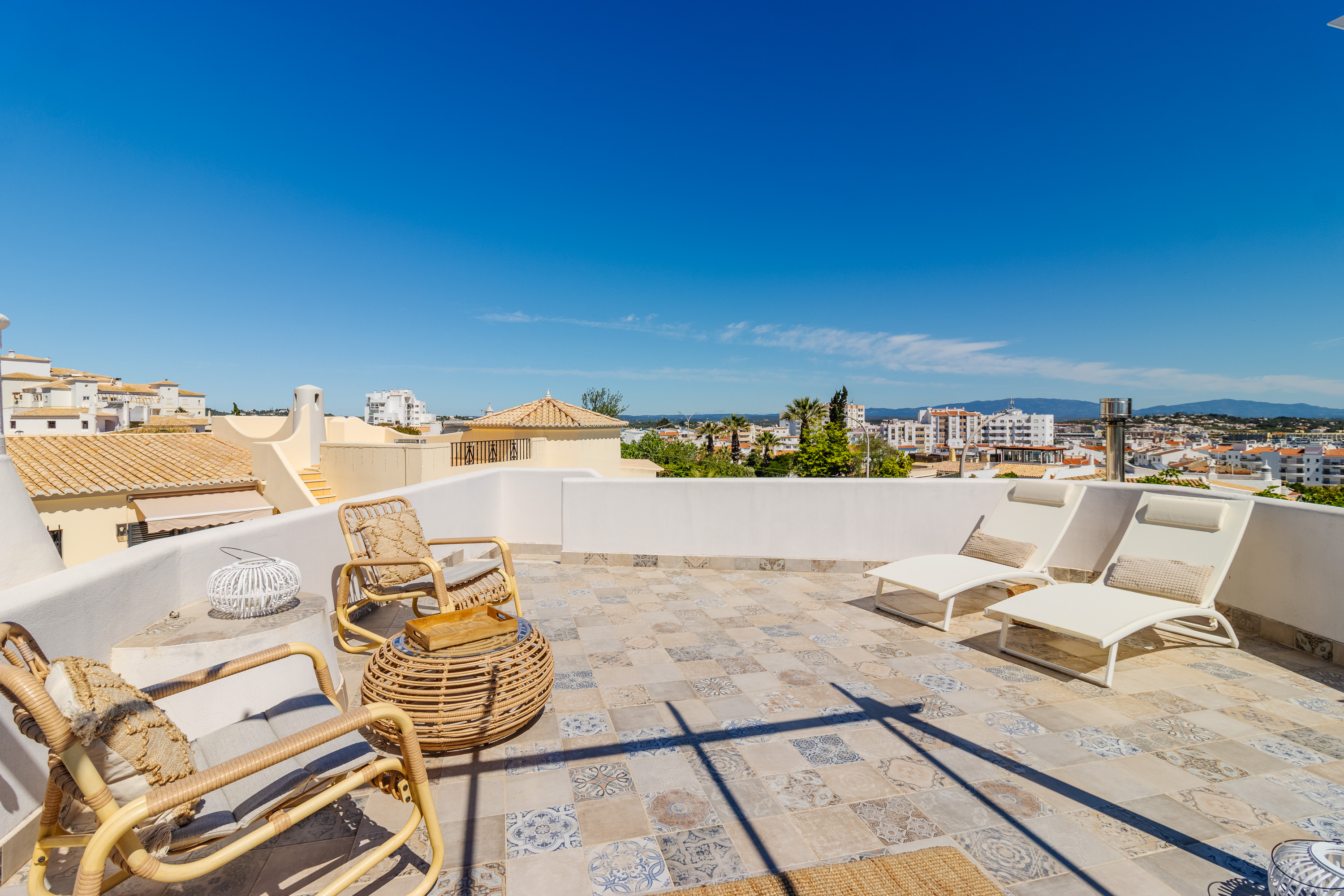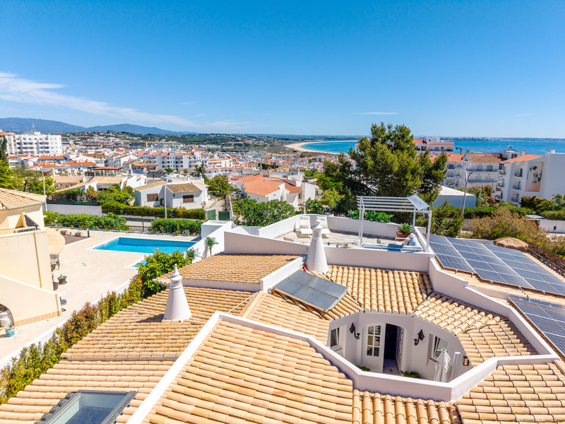 Outside, the beautifully landscaped gardens wrap around the villa and feature an array of tropical plants and fruit trees. The outdoor space includes a swimming pool and an elegantly designed outdoor kitchen, perfect for entertaining. There are many beautiful little terraced areas in which to relax in the sunshine or read a book in the shade. From here, stairs lead to the private roof terrace, where you can relax in the sunshine and enjoy stunning sea and beach views stretching across to Meia Praia and Lagos.