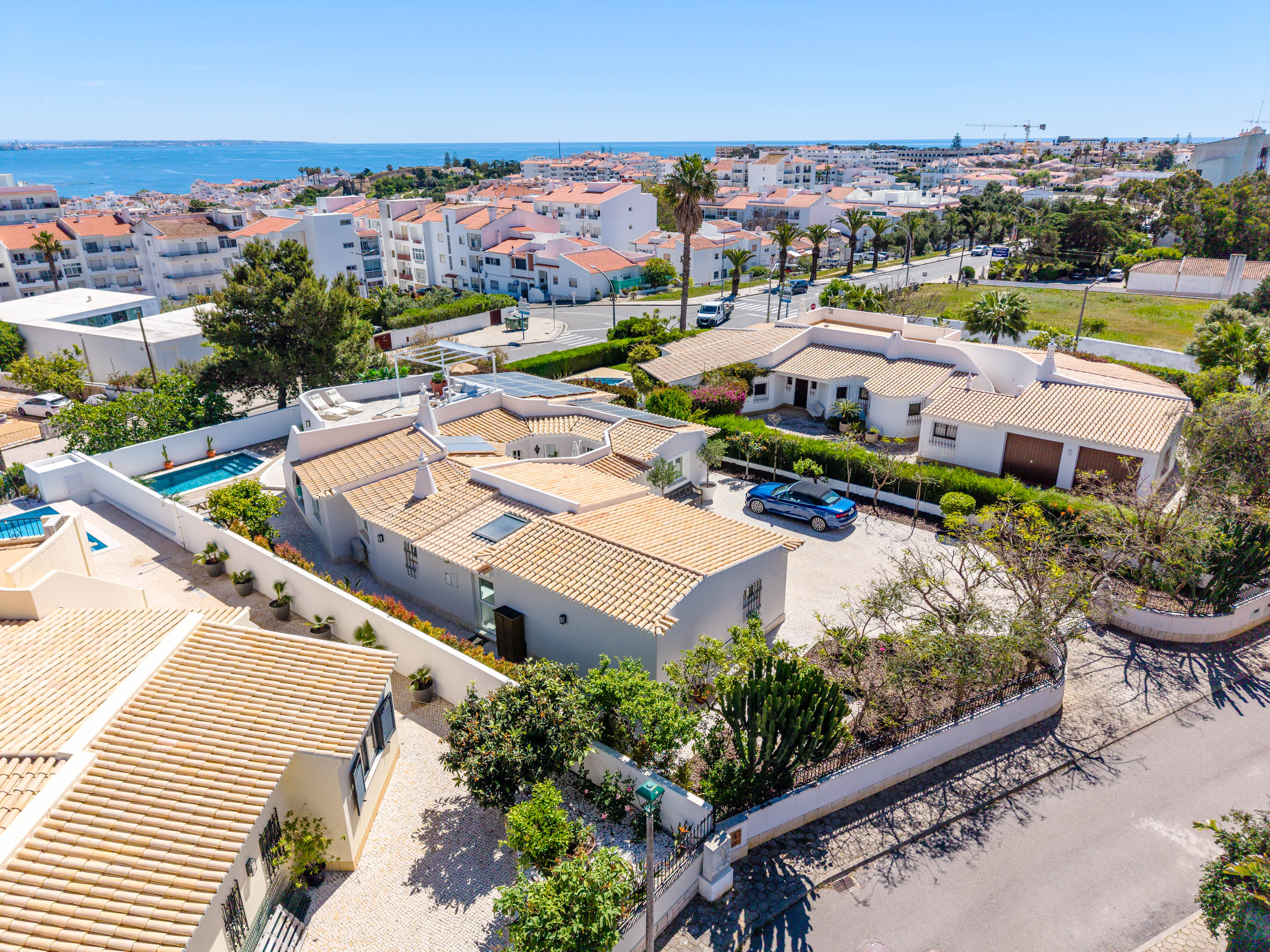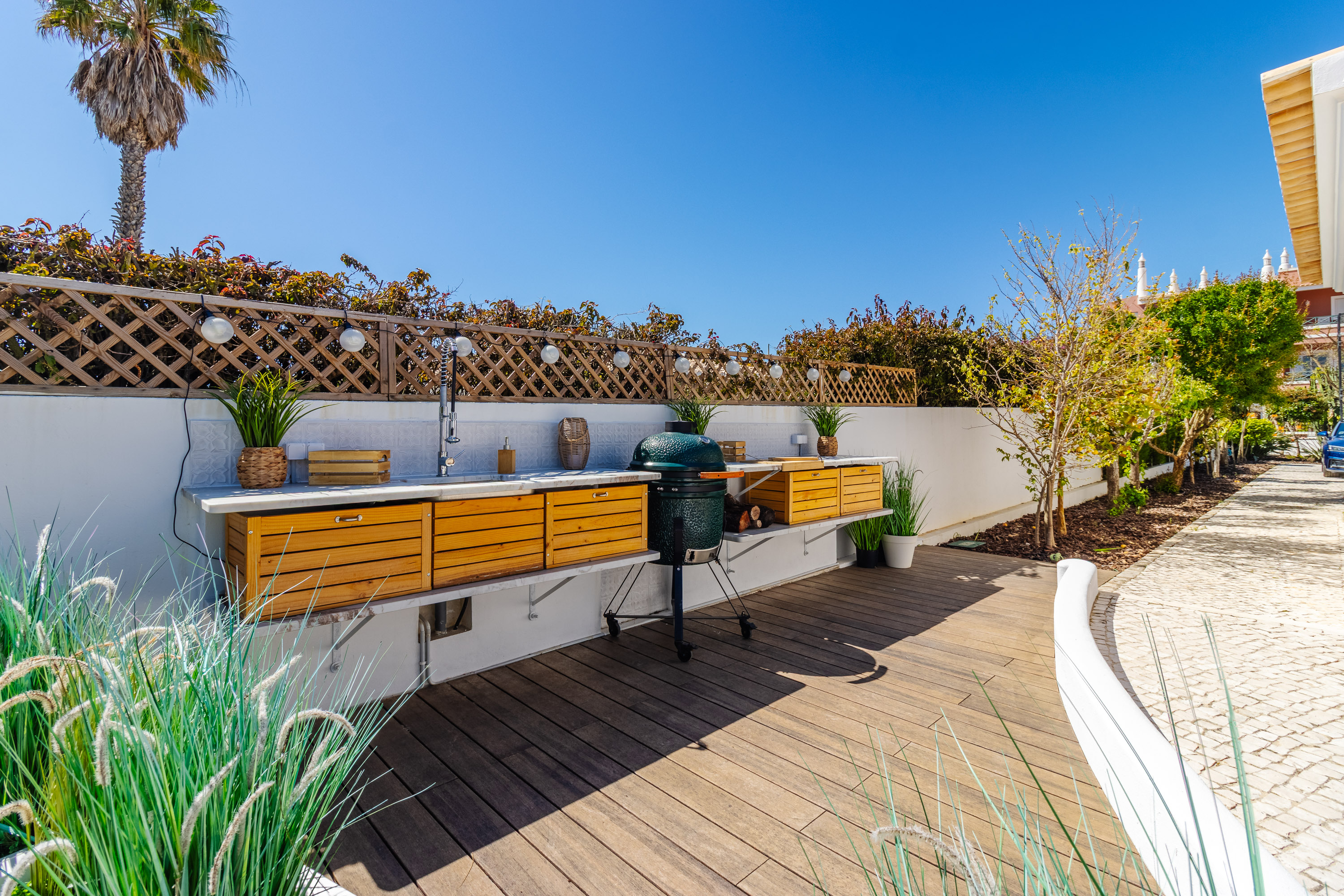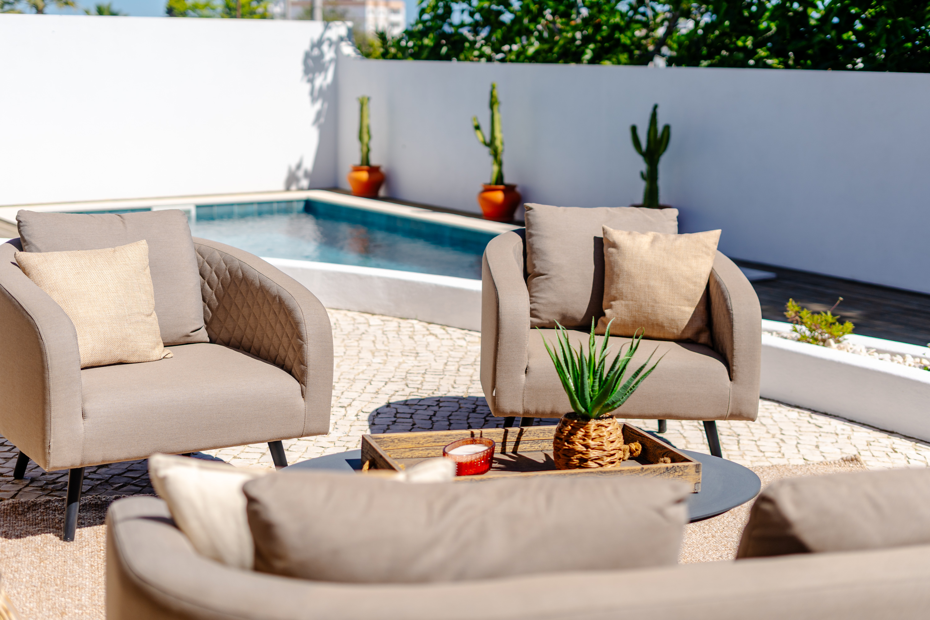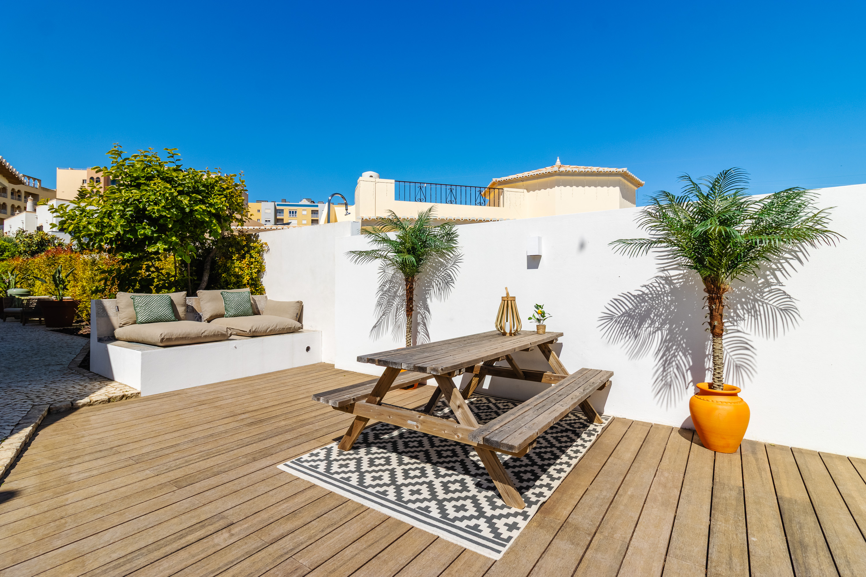 Outside, the beautifully landscaped gardens wrap around the villa and feature an array of tropical plants and fruit trees. The outdoor space includes a swimming pool and an elegantly designed outdoor kitchen, perfect for entertaining. There are many beautiful little terraced areas in which to relax in the sunshine or read a book in the shade. From here, stairs lead to the private roof terrace, where you can relax in the sunshine and enjoy stunning sea and beach views stretching across to Meia Praia and Lagos.