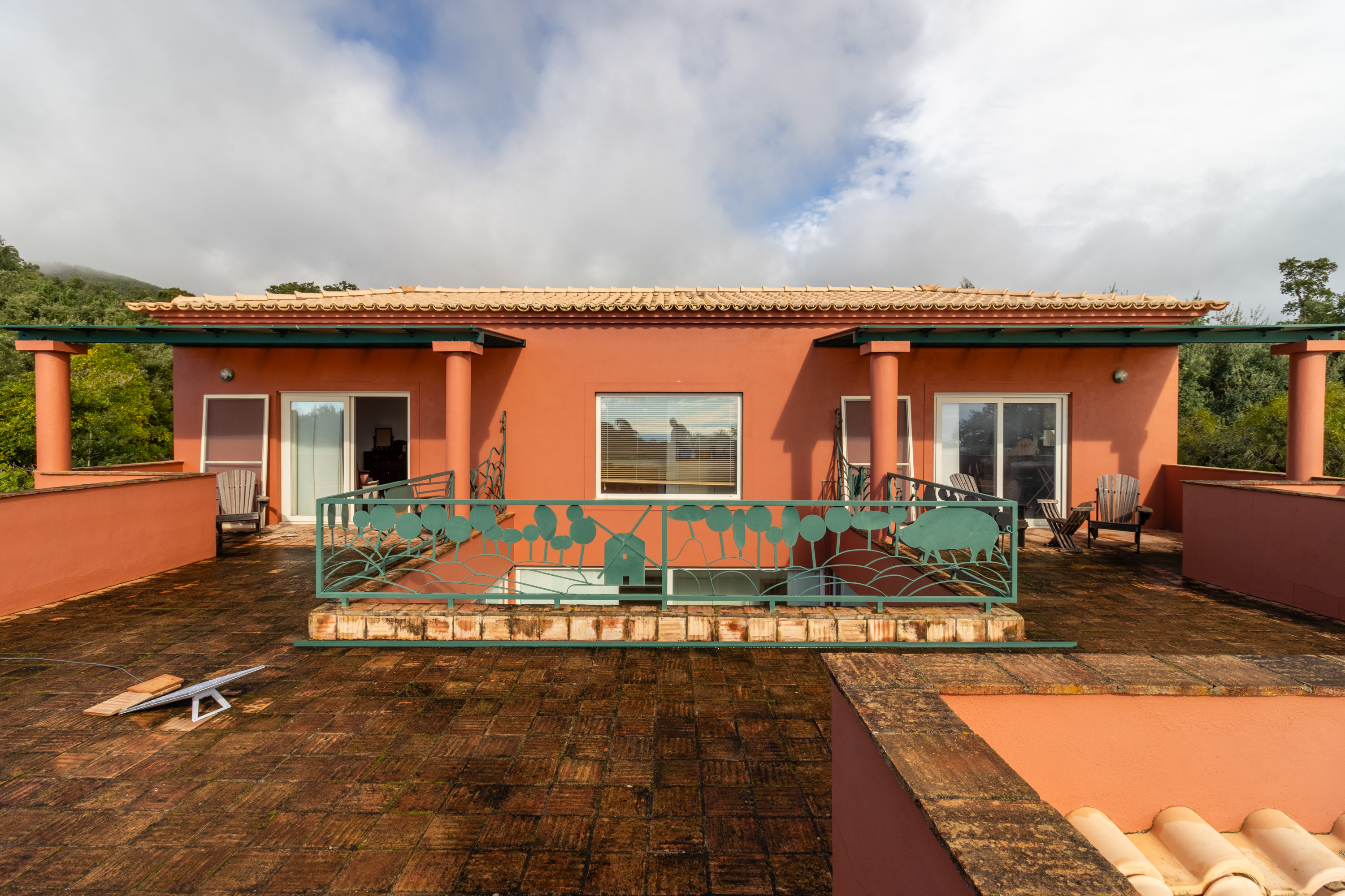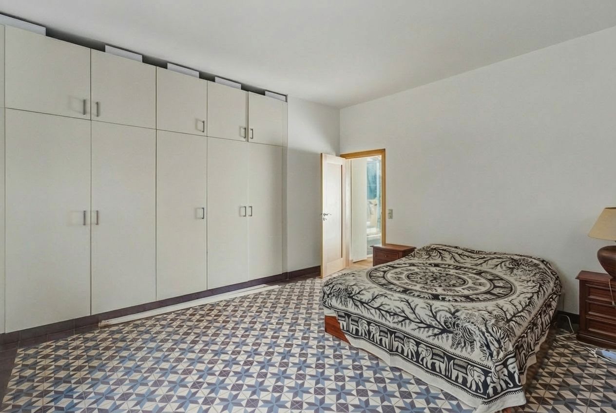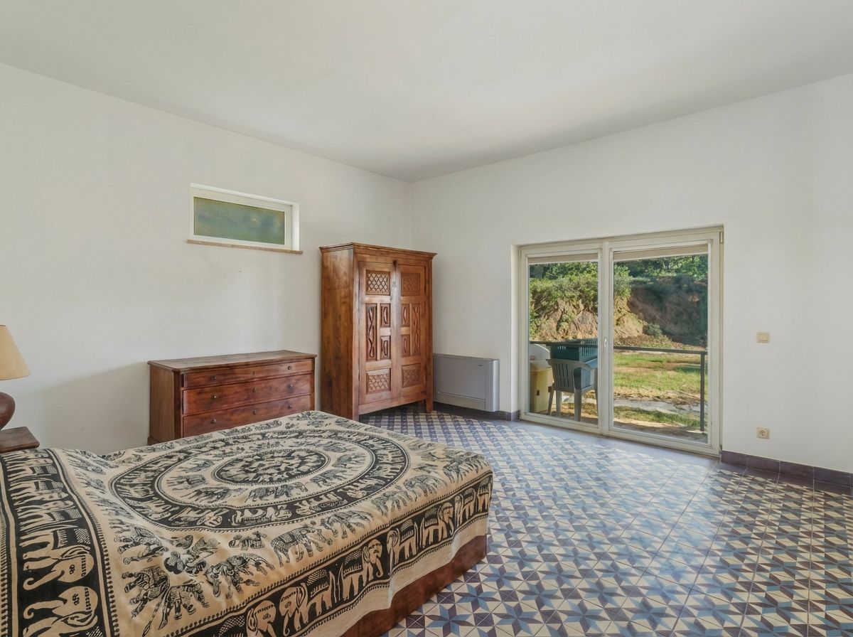 Upstairs, there are two very generous bedrooms, each with direct access to the upper terrace, where panoramic views stretch across the hills towards the coast.